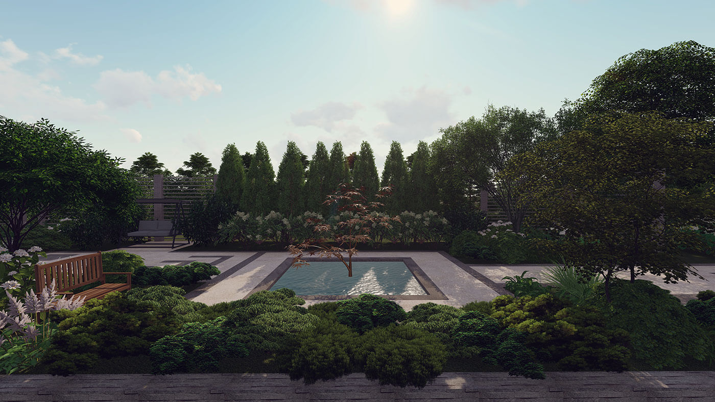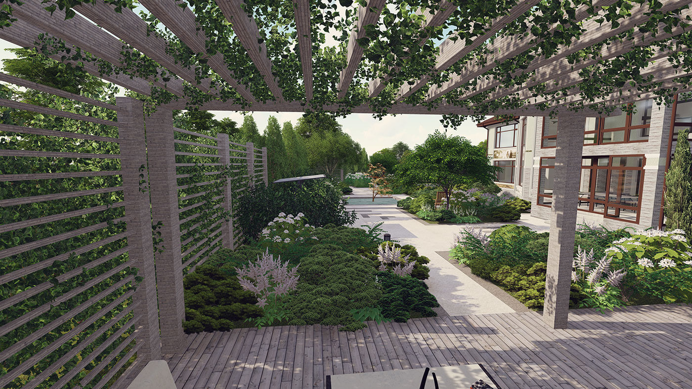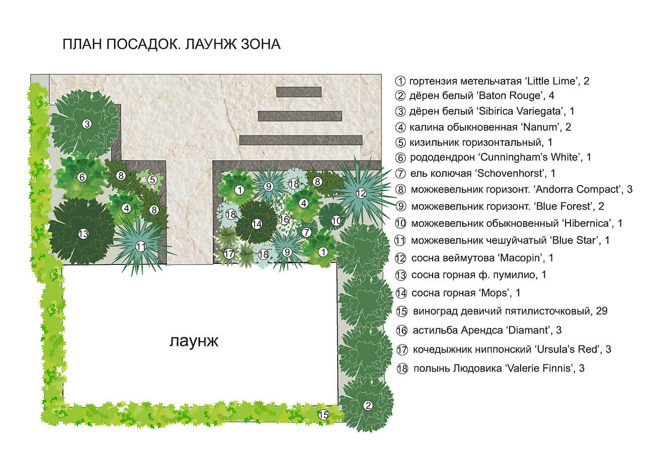 Любимый цвет заказчика — зеленый, именно поэтому было принято решение создать монохромный сад, используя разные оттенки зеленого в цветовой гамме растений, материалов, скульптуры.