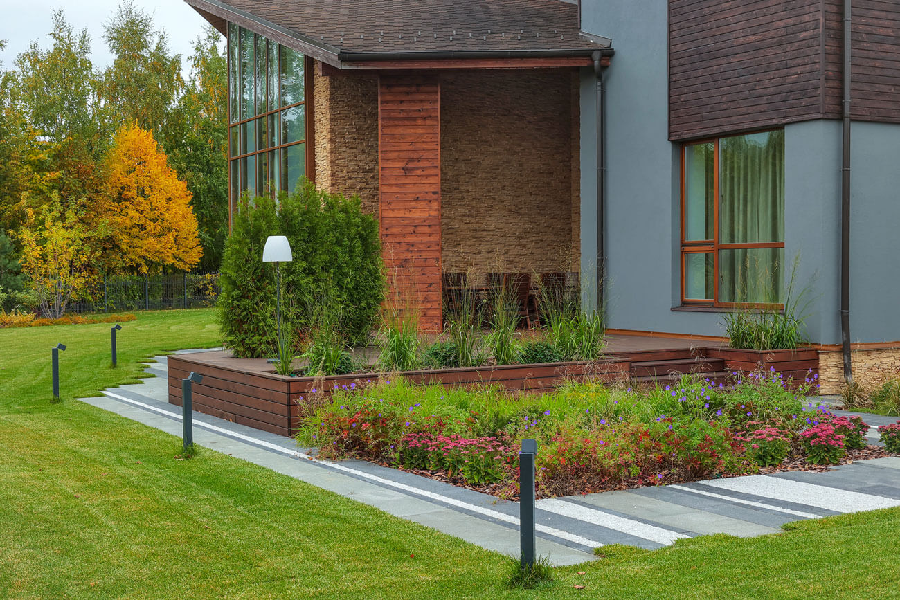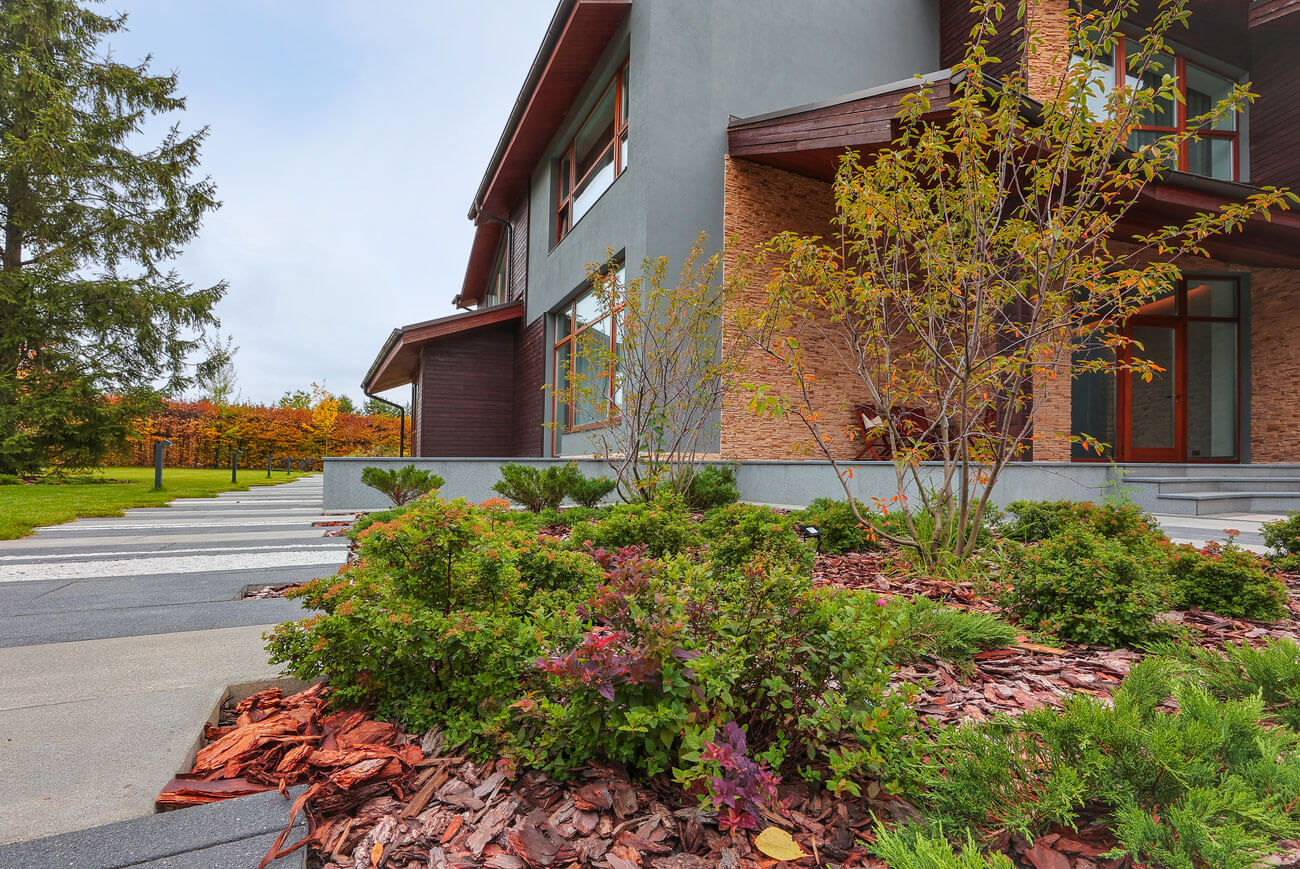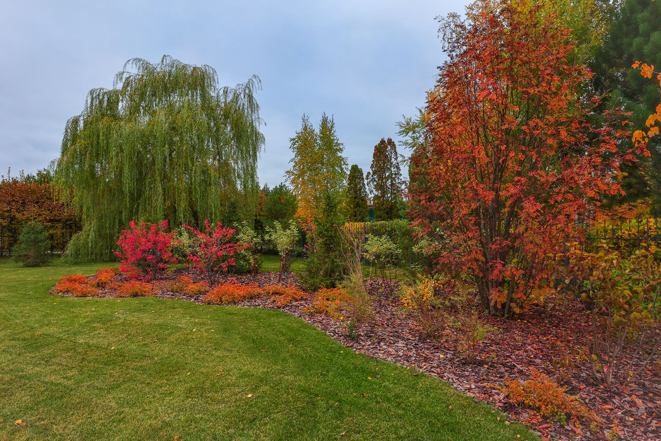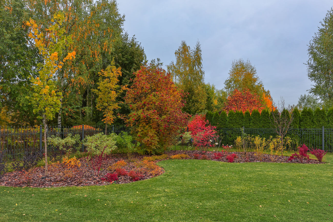 Озеленение расположено пейзажными куртинами, которые создают кулисные посадки по периметру участка и растворяют его границы.