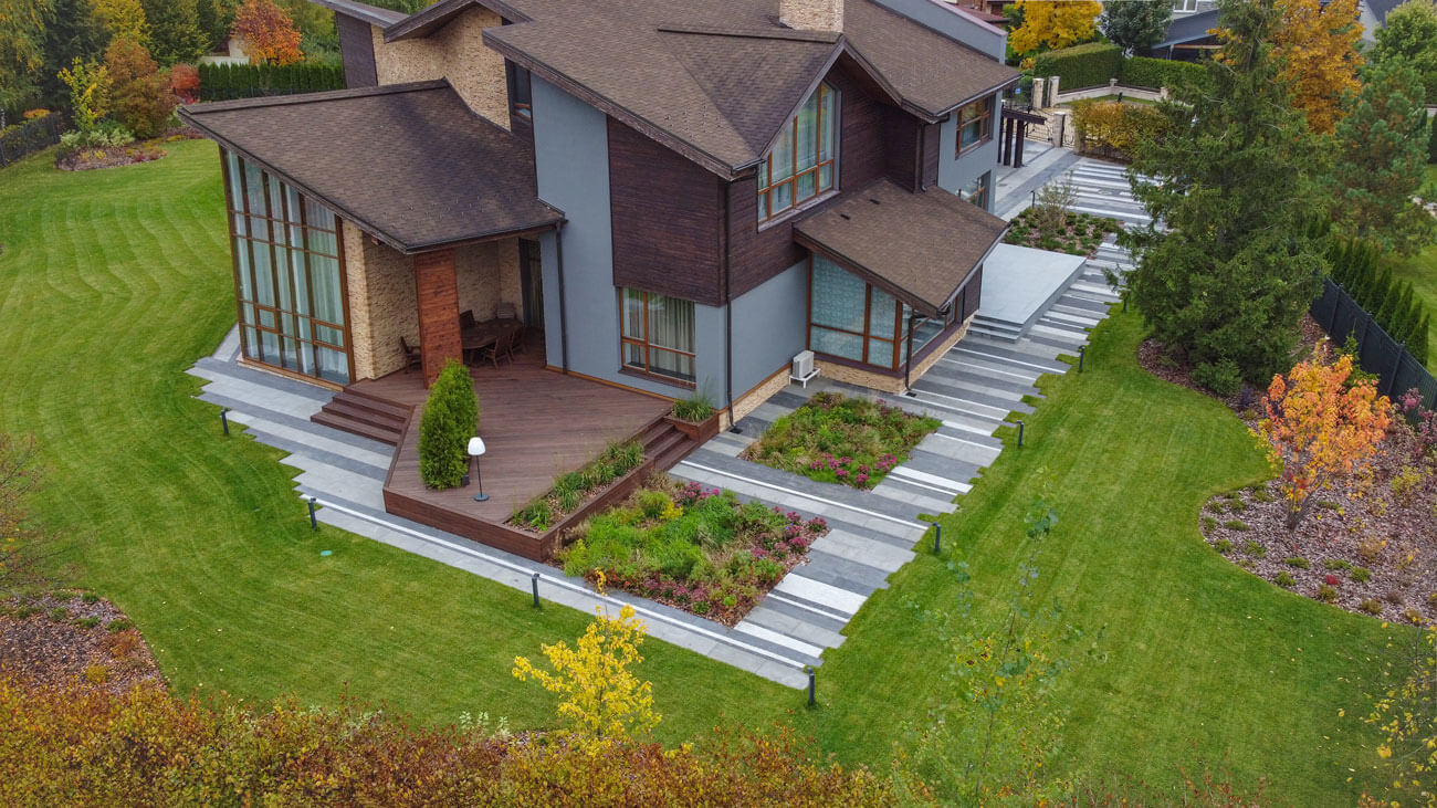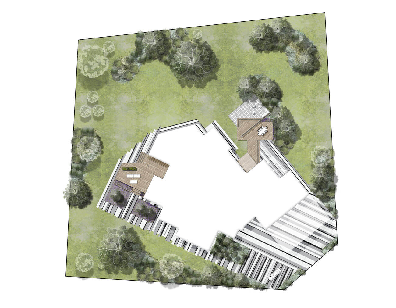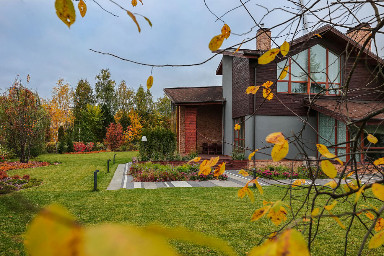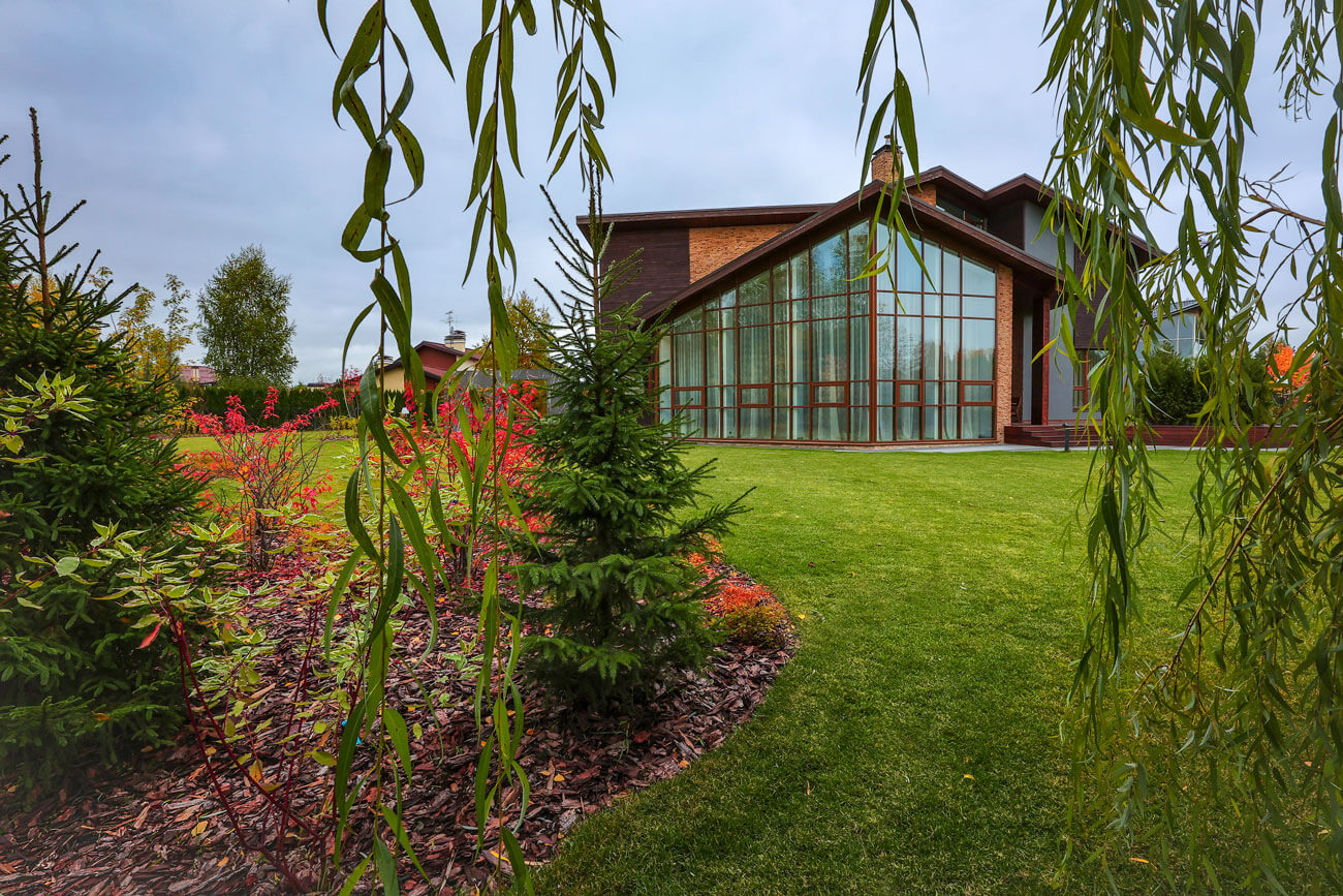 Клиенты приобрели участок с существующим домом в современном стиле и дорожками. Участок площадью 33 сотки с равнинным рельефом и локальными посадками деревьев. Существующий дом имеет панорамное остекление, выходящее в сад и являющееся главным архитектурным элементом.