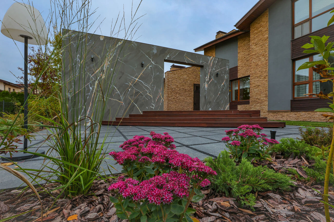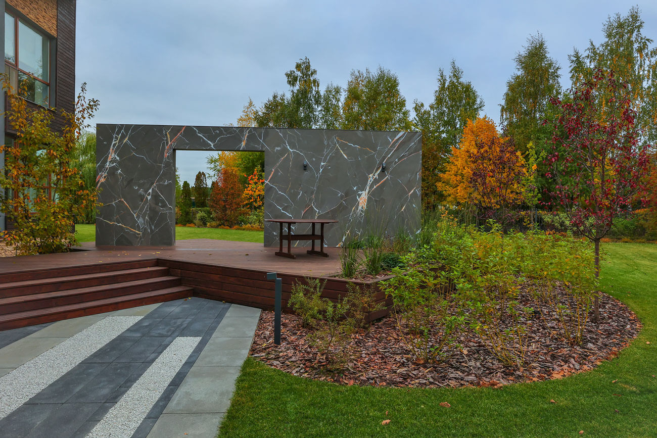 Сад — это продолжение дома. Спроектированный деревянный настил, пристроенный к зданию, является своеобразной комнатой под открытым небом. Декоративная стена с порталом, которая врезается в деревянный настил, является центральным элементом сада. Арка служит своеобразной границей между архитектурой и ландшафтом. Следуя по настилу из дома, ты делаешь шаг сквозь портал в новую реальность.
