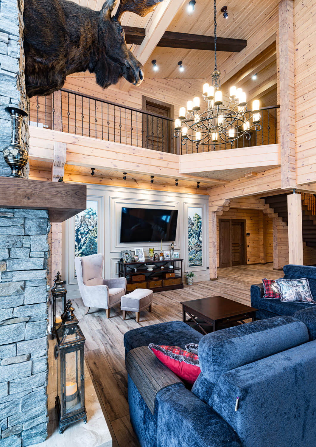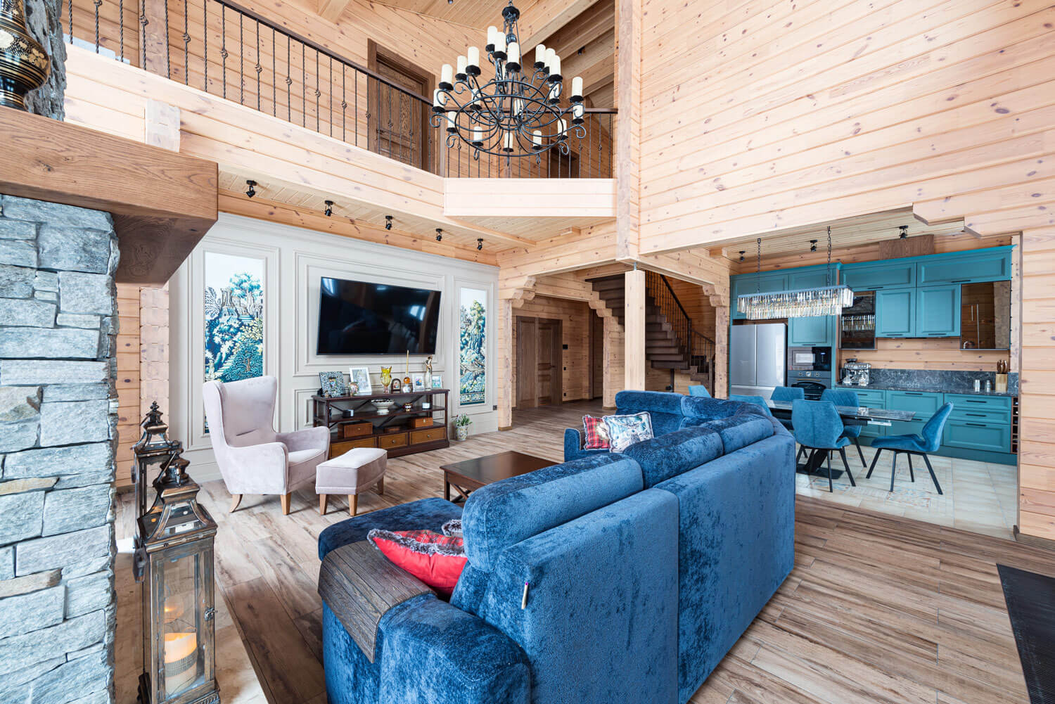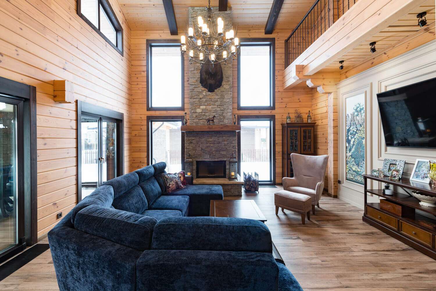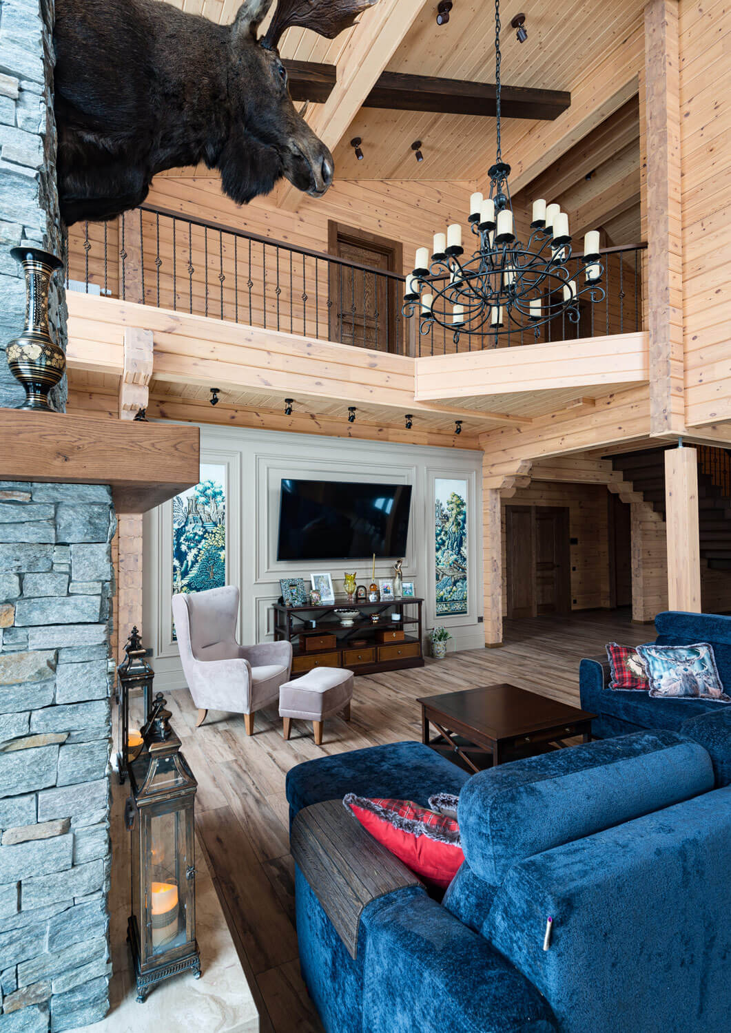 Планировка дома простая, компактная, что дает возможность рационально использовать все пространства. Первый этаж занимают двусветная гостиная, объединенная с кухней-столовой, хозяйская спальня, а также бильярдная с выходом на террасу. Гостиная, столовая и кухня занимают центральную часть дома с открытой планировкой. Мебель изготовлена из дуба на столярном производстве по индивидуальному заказу. Доминантой гостиной стал камин с застекленной топкой, облицованный серо-зеленым кварцитом. По центру каминной трубы разместили подаренный хозяевам охотничий трофей, который подчеркнул атмосферу дома в стиле шале.