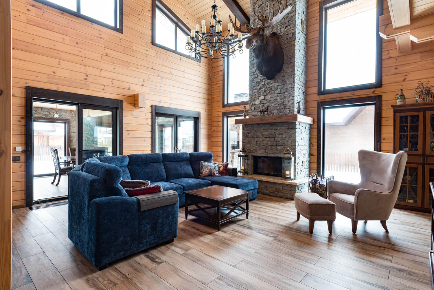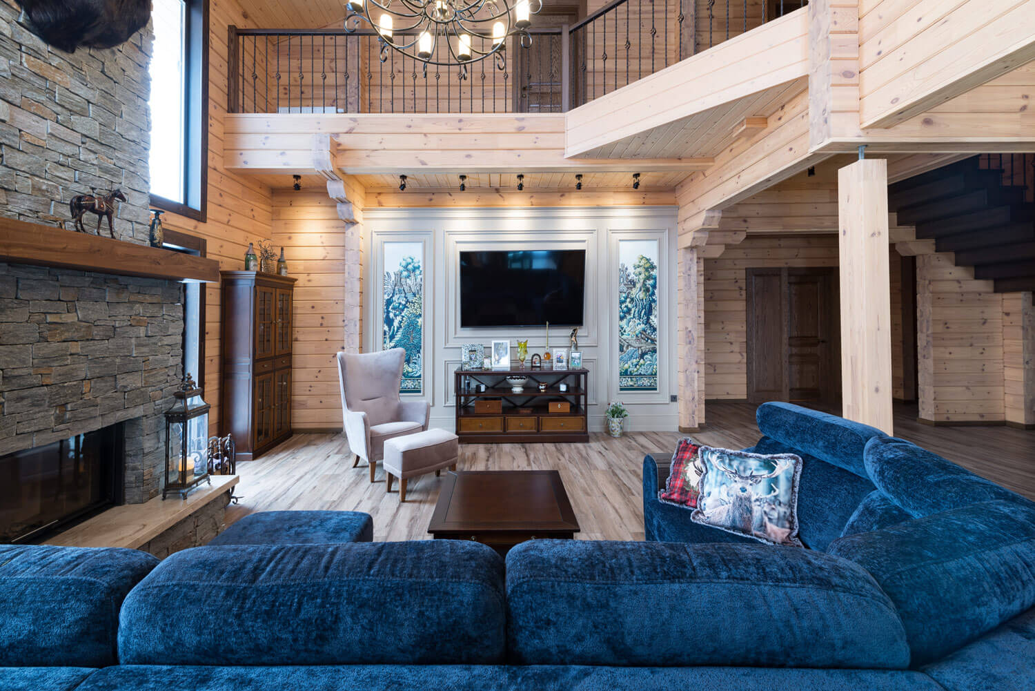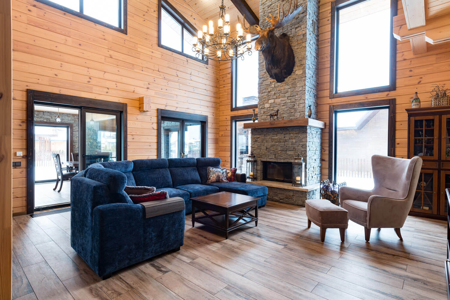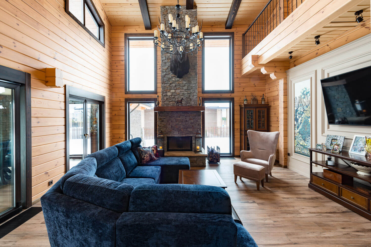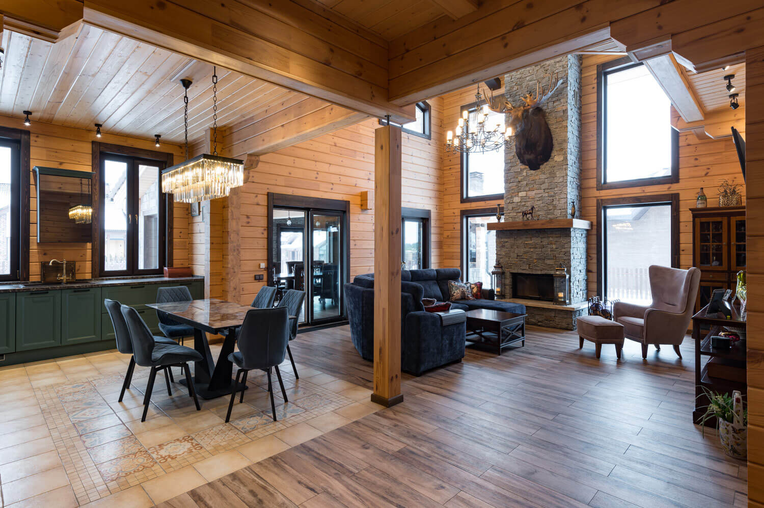 Планировка дома простая, компактная, что дает возможность рационально использовать все пространства. Первый этаж занимают двусветная гостиная, объединенная с кухней-столовой, хозяйская спальня, а также бильярдная с выходом на террасу. Гостиная, столовая и кухня занимают центральную часть дома с открытой планировкой. Мебель изготовлена из дуба на столярном производстве по индивидуальному заказу. Доминантой гостиной стал камин с застекленной топкой, облицованный серо-зеленым кварцитом. По центру каминной трубы разместили подаренный хозяевам охотничий трофей, который подчеркнул атмосферу дома в стиле шале.