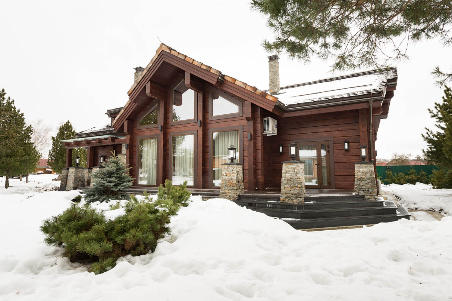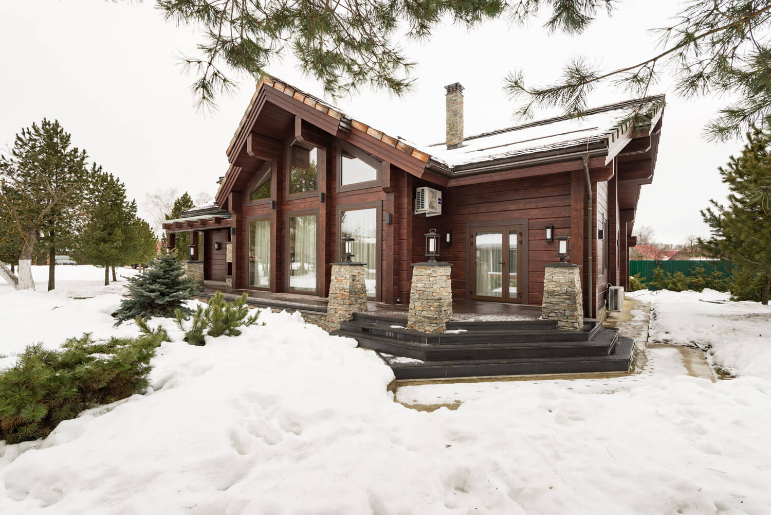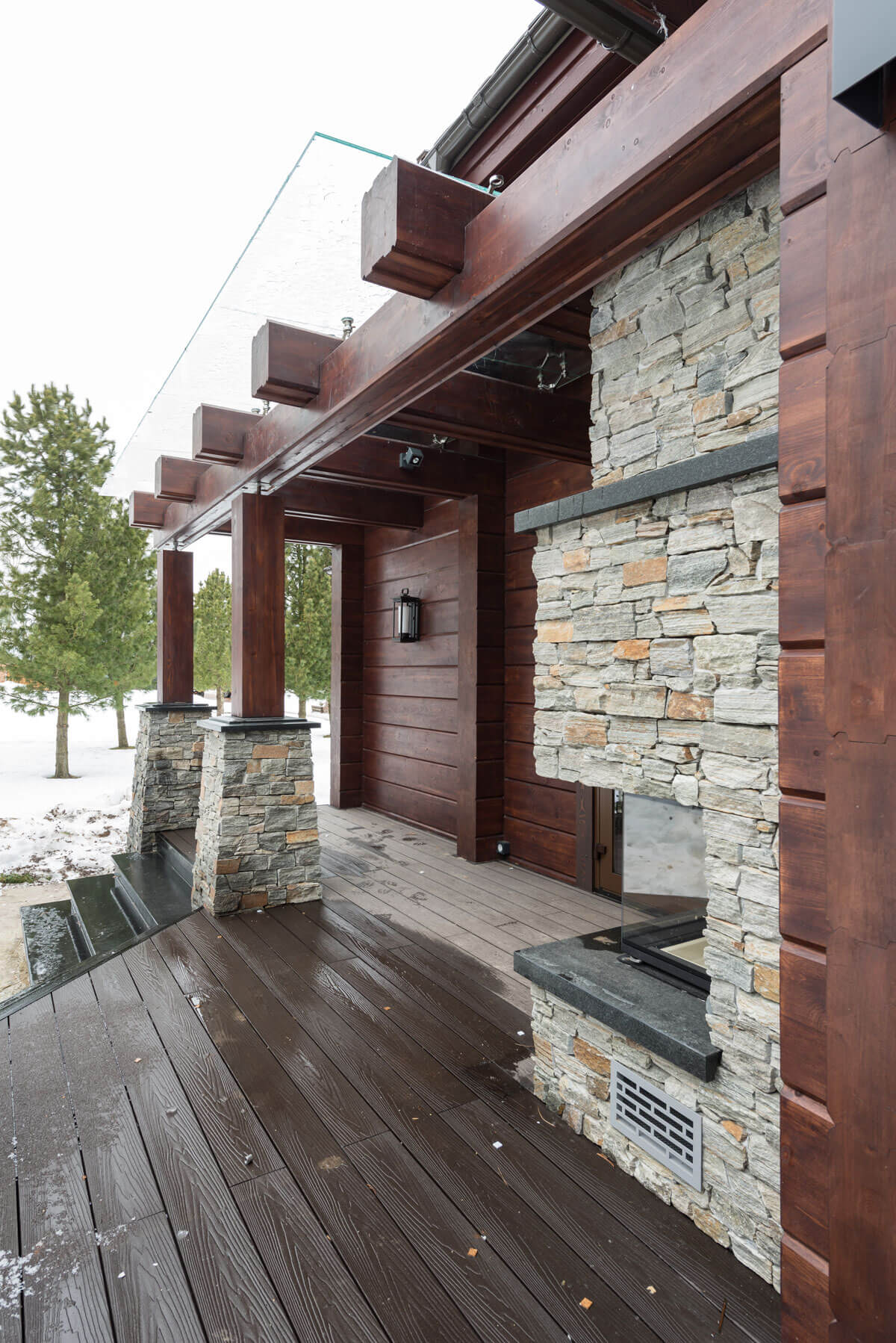 Отличительной особенностью дома стала открытая терраса с фонарными опорами и столбами, облицованными природным камнем.