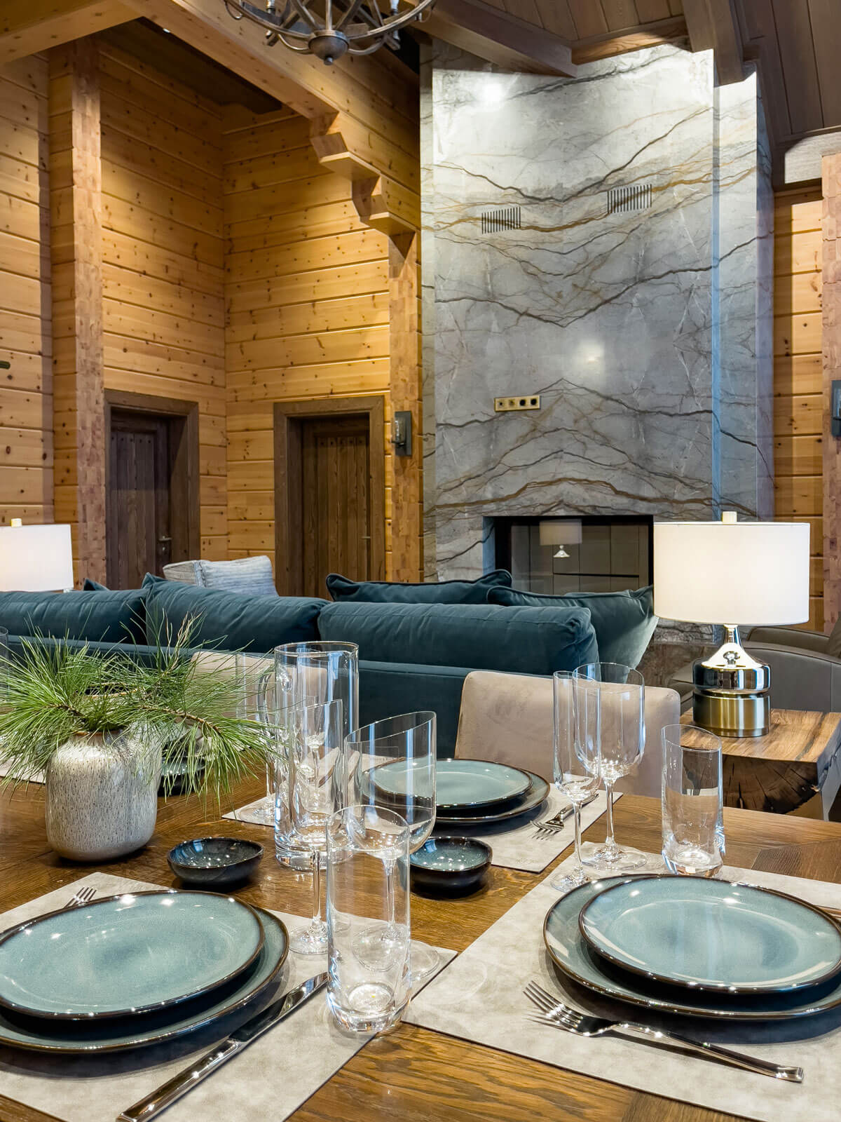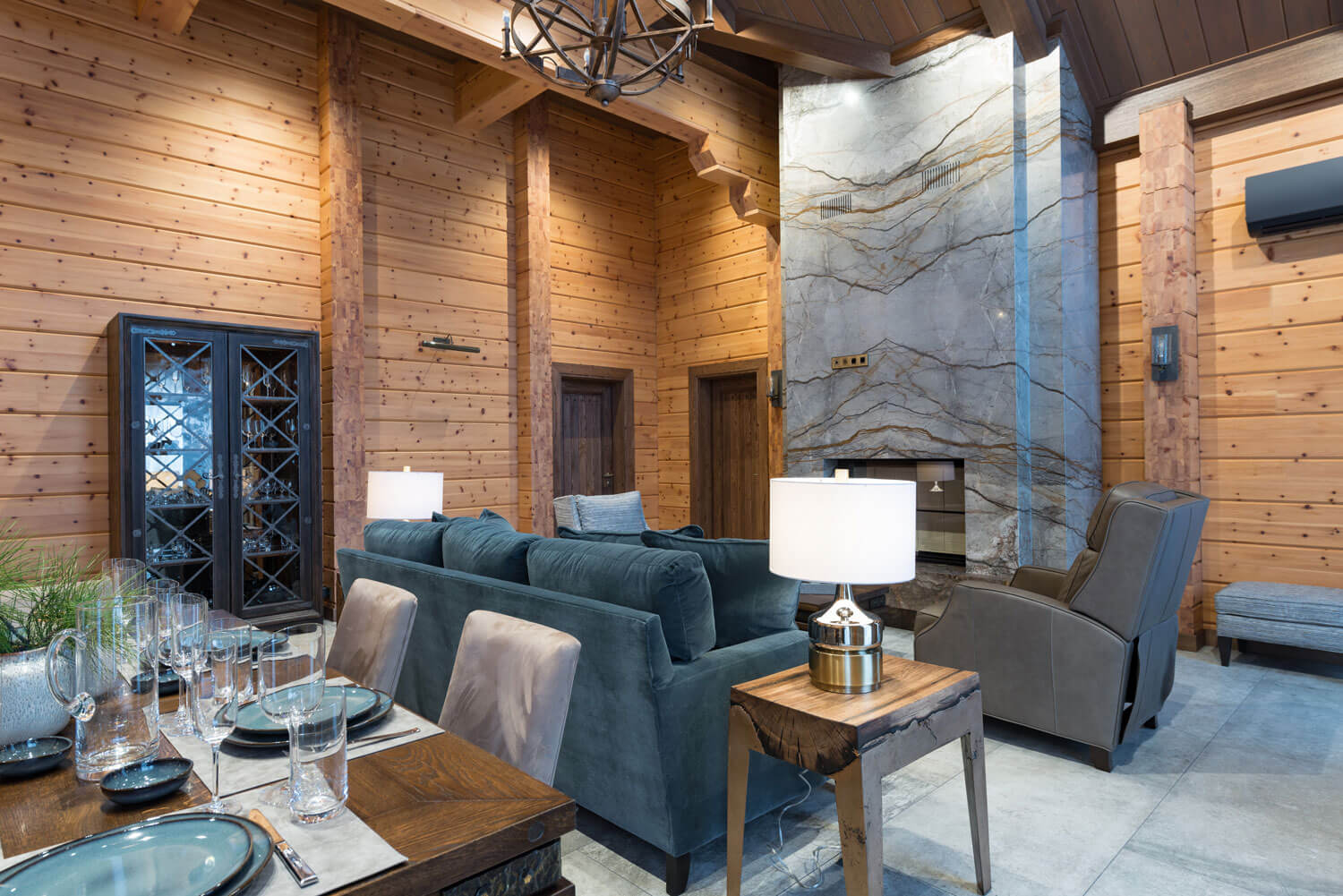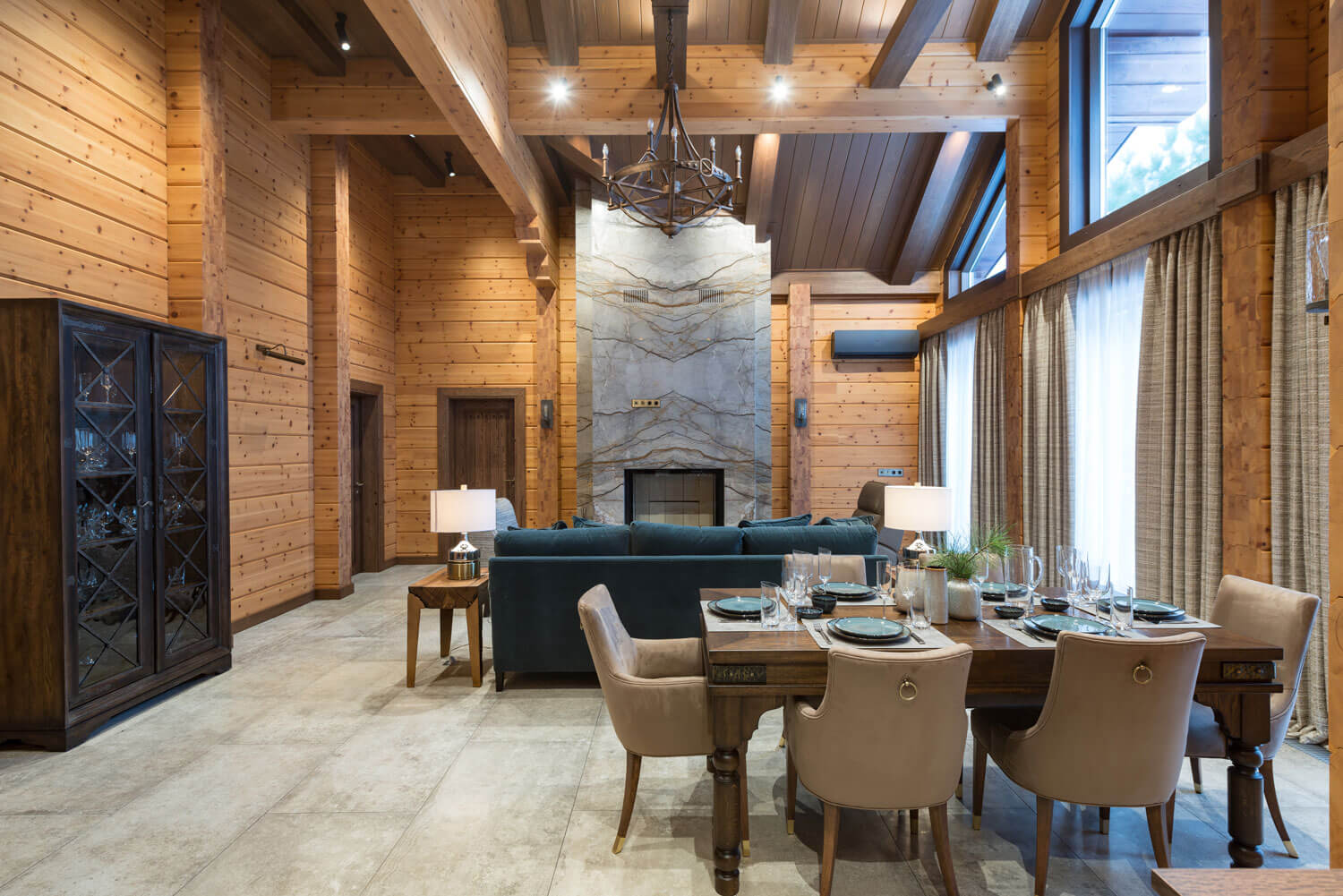 В общем пространстве гостиной-столовой доминирующую роль играет массивный камин с остекленной топкой, облицованный двумя сортами мрамора. В качестве напольного покрытия выбрали широкоформатный керамогранит, фактура которого отчасти напоминает шелк, при этом он не имеет глянцевого блеска. В спальнях пол выложен инженерной доской из дуба с брашированной матовой поверхностью.