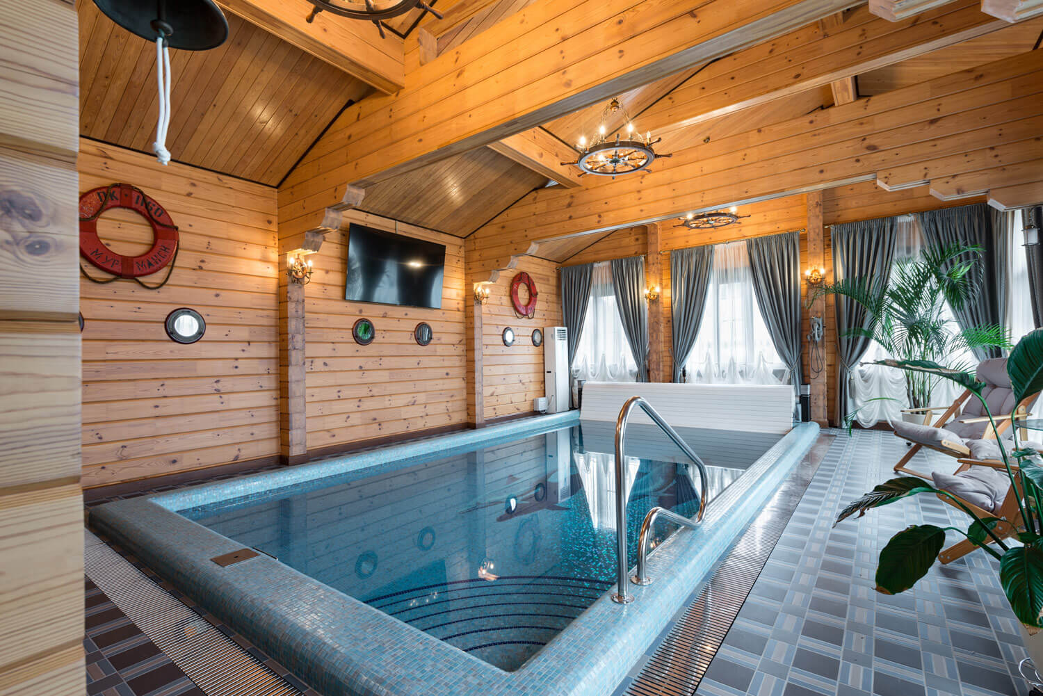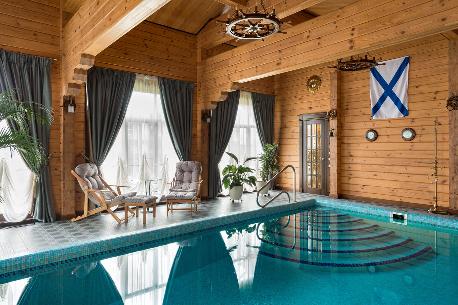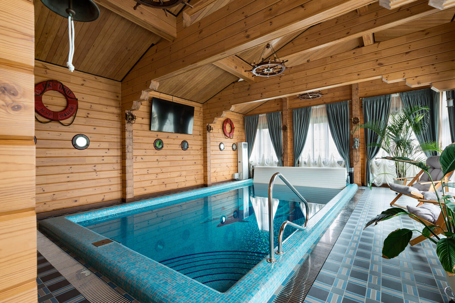 Хороший компактный бассейн. Но меня смущают шторы на окнах как в гостиной. Может деревянные жалюзи смотрелись бы более органично