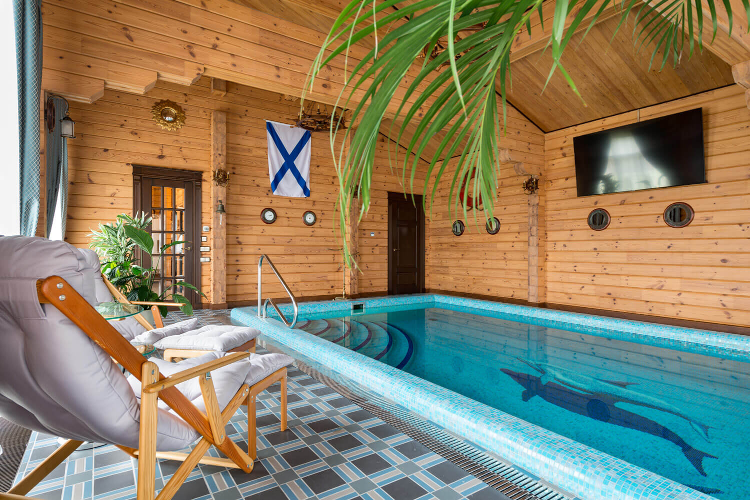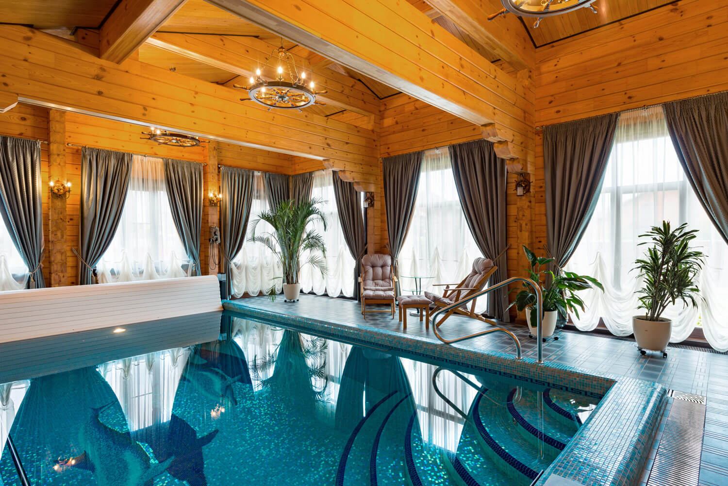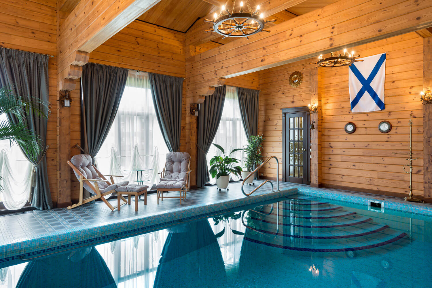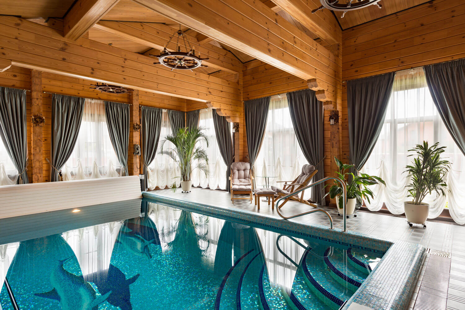 Хороший компактный бассейн. Но меня смущают шторы на окнах как в гостиной. Может деревянные жалюзи смотрелись бы более органично