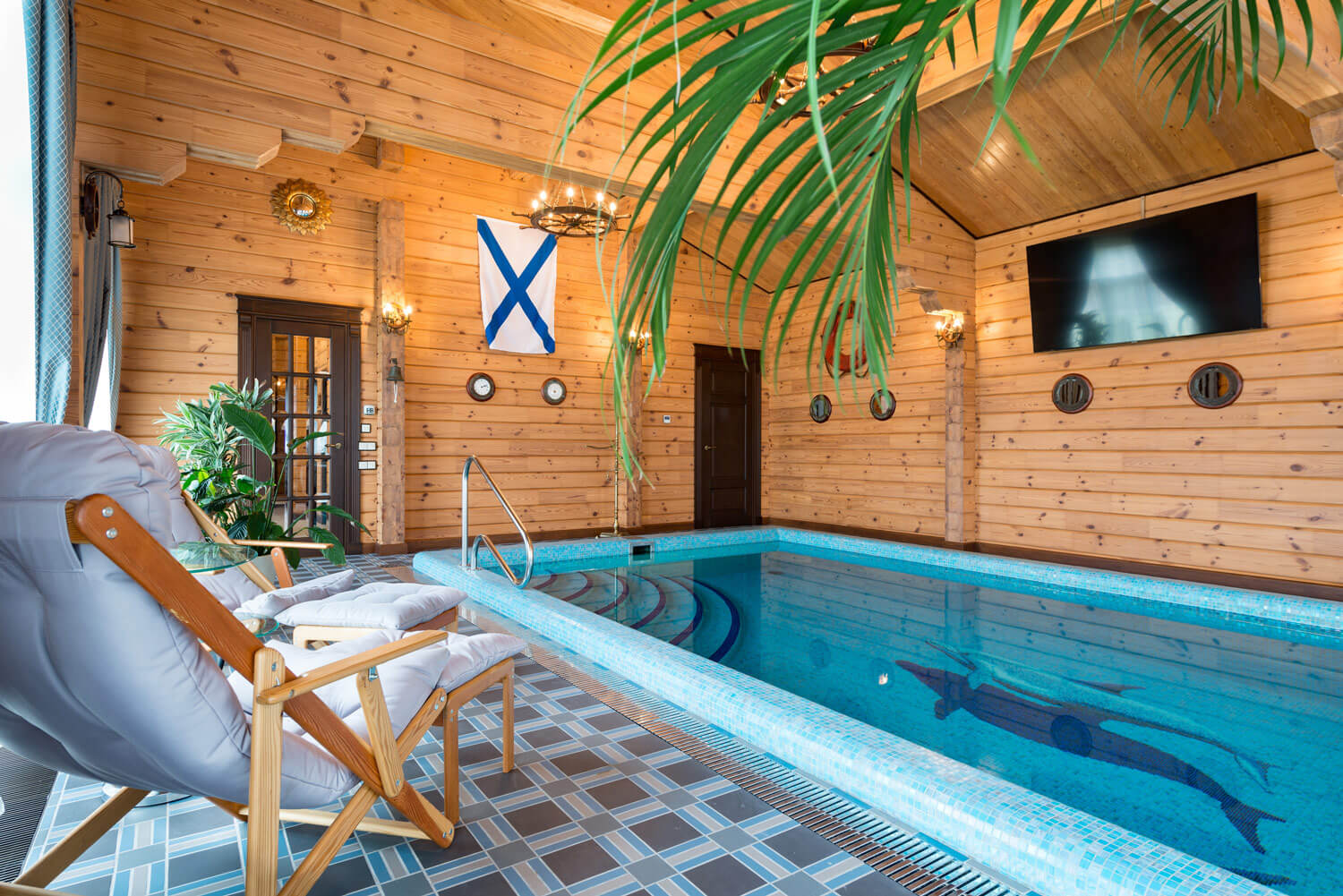 Пол в душевой зоне и бассейне облицован португальской плиткой. Чаша бассейна выложена мозаикой ручной работы.