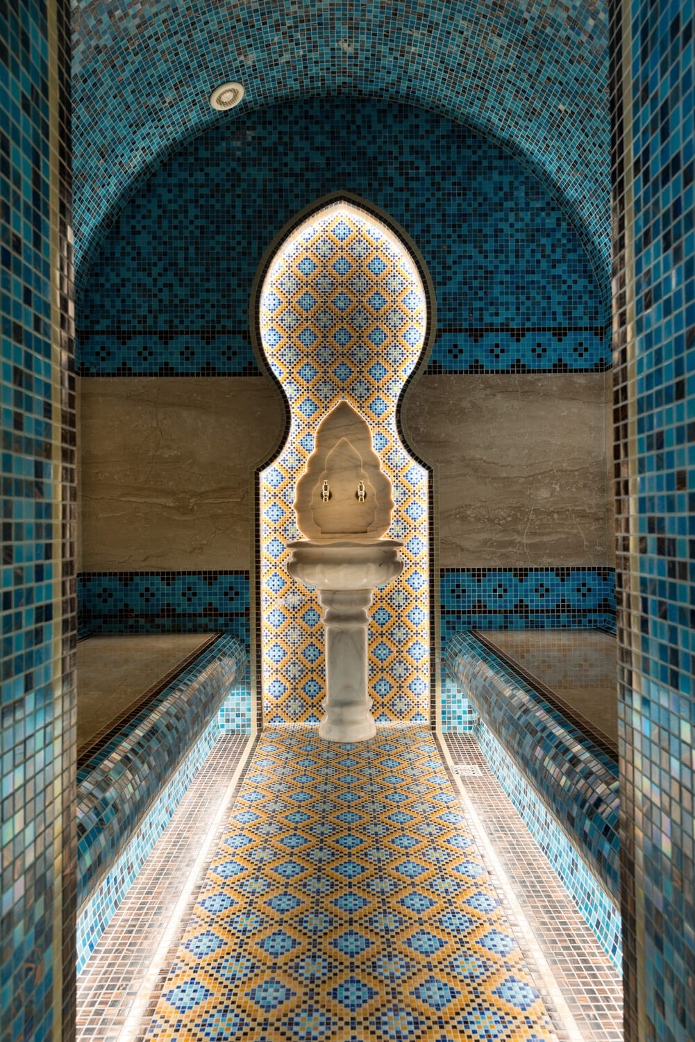 Зона спа оборудована в отдельно стоящем строении рядом с домом. Хаммам оформлен мрамором и мозаикой, орнамент которой выполнен по индивидуальному проекту.