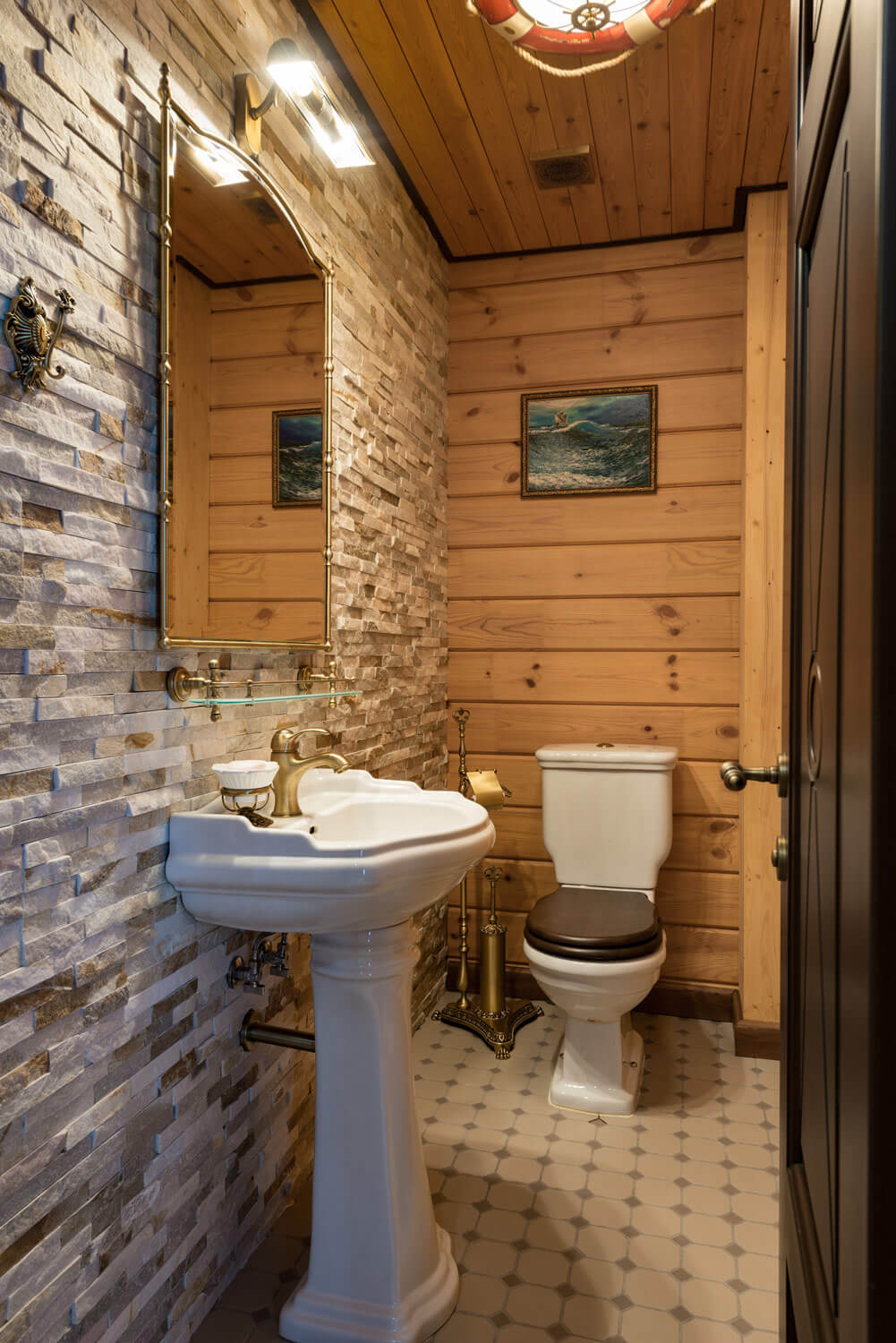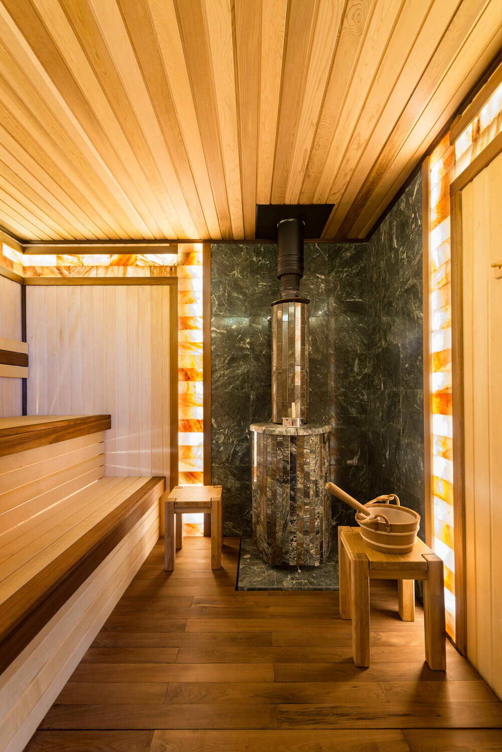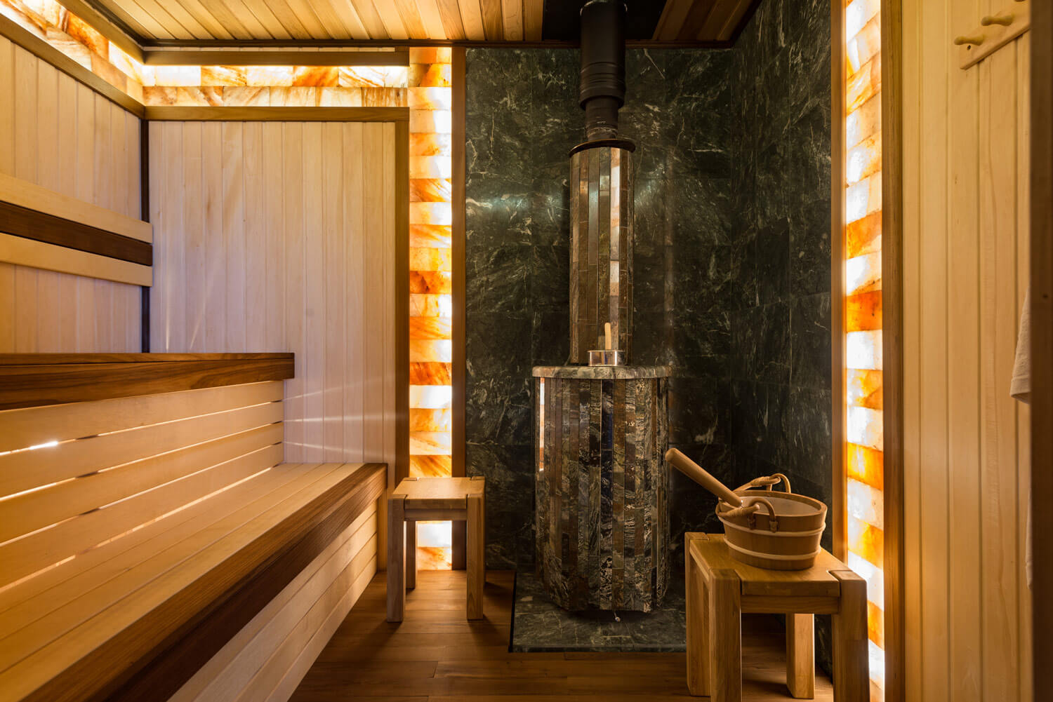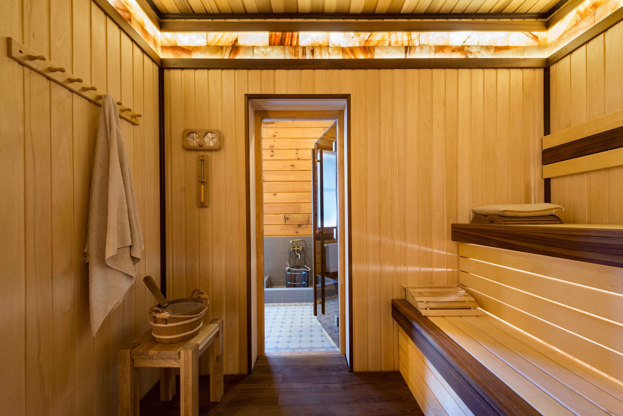 Сауна, как и многое в этом доме, сделана по индивидуальному проекту. Полки — из абаша и термоабаша, стены обшиты вагонкой из липы, пол — из термолипы, а потолок из канадского кедра. Верхняя часть стен по периметру помещения выложена плитами из гималайской соли.