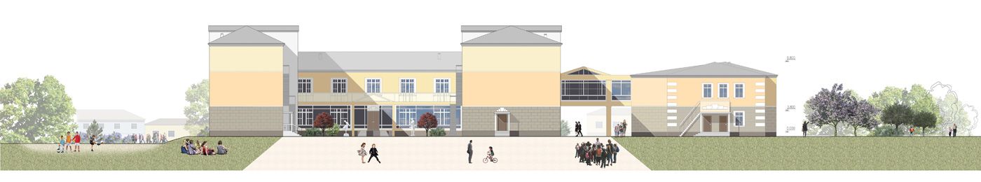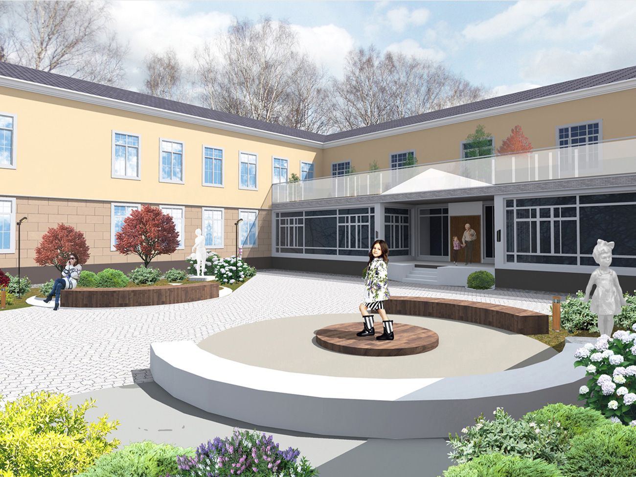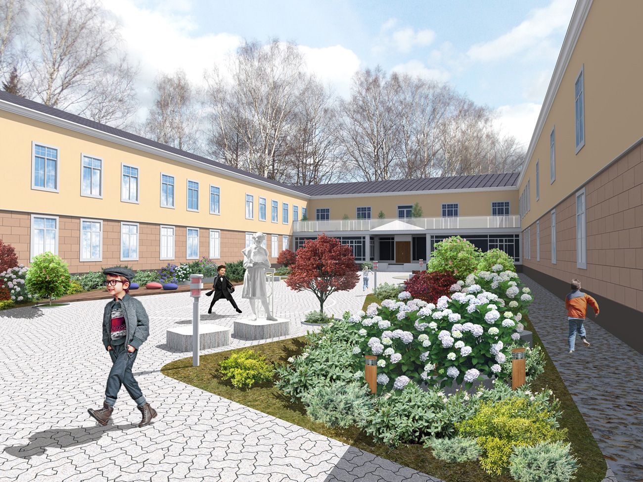 Создан дизайн-проект по благоустройству школьного участка. Оригинальным решением проекта внутреннего двора является устройство сада скульптур с площадками для танцев, литературных чтений, обсуждений, дискуссий. Здесь создается эстетическое пространство, наполненное своеобразными артефактами, зона будет играть свою роль как в экстерьерном пространстве, так и переходить в интерьер (из окон второго этажа будет открываться вид на сад). Акцент в центре сада — мраморные белые скульптуры, которые в весенне-летний период будут утопать в цветах и кустарниках.