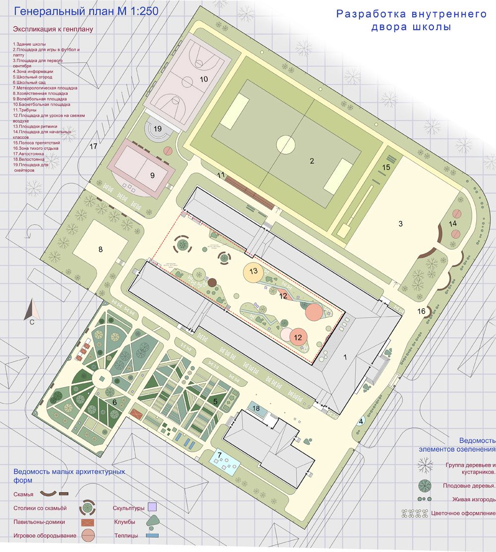 В начальный период существования школы скульптуры украшали главный вход в школу. Сад со скульптурами трактуется нами как некое напоминание о прошлой эпохе, он будет создавать парадность, преемственность и праздничность. Среди растений разместятся площадки для занятий на воздухе, общения, бесед и диспутов, площадки для творчества и искусства, а также площадка для ритмики и танцев. Во время перемен в теплое время года дети будут отдыхать в школьном дворе.