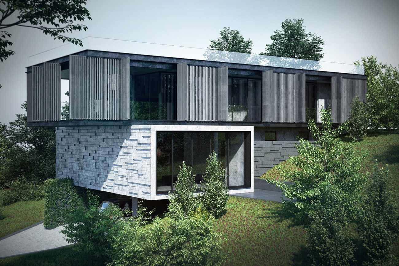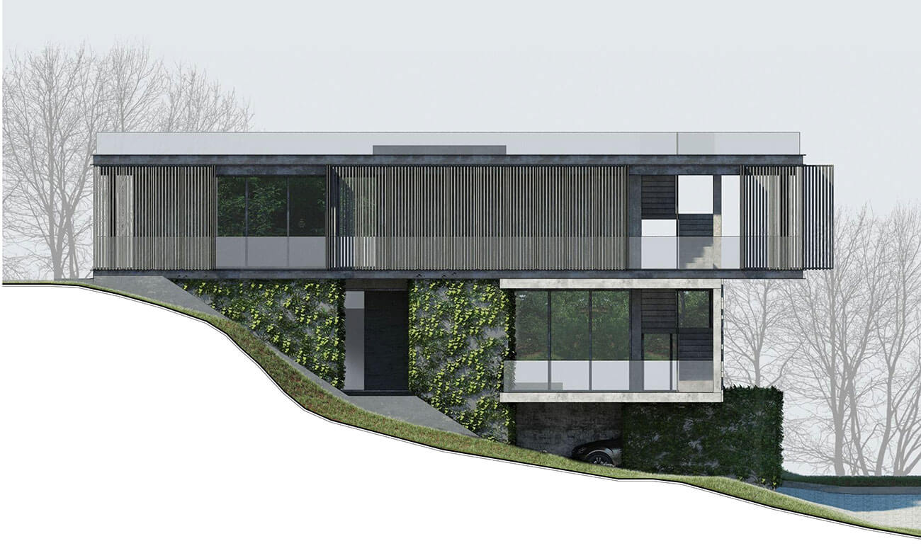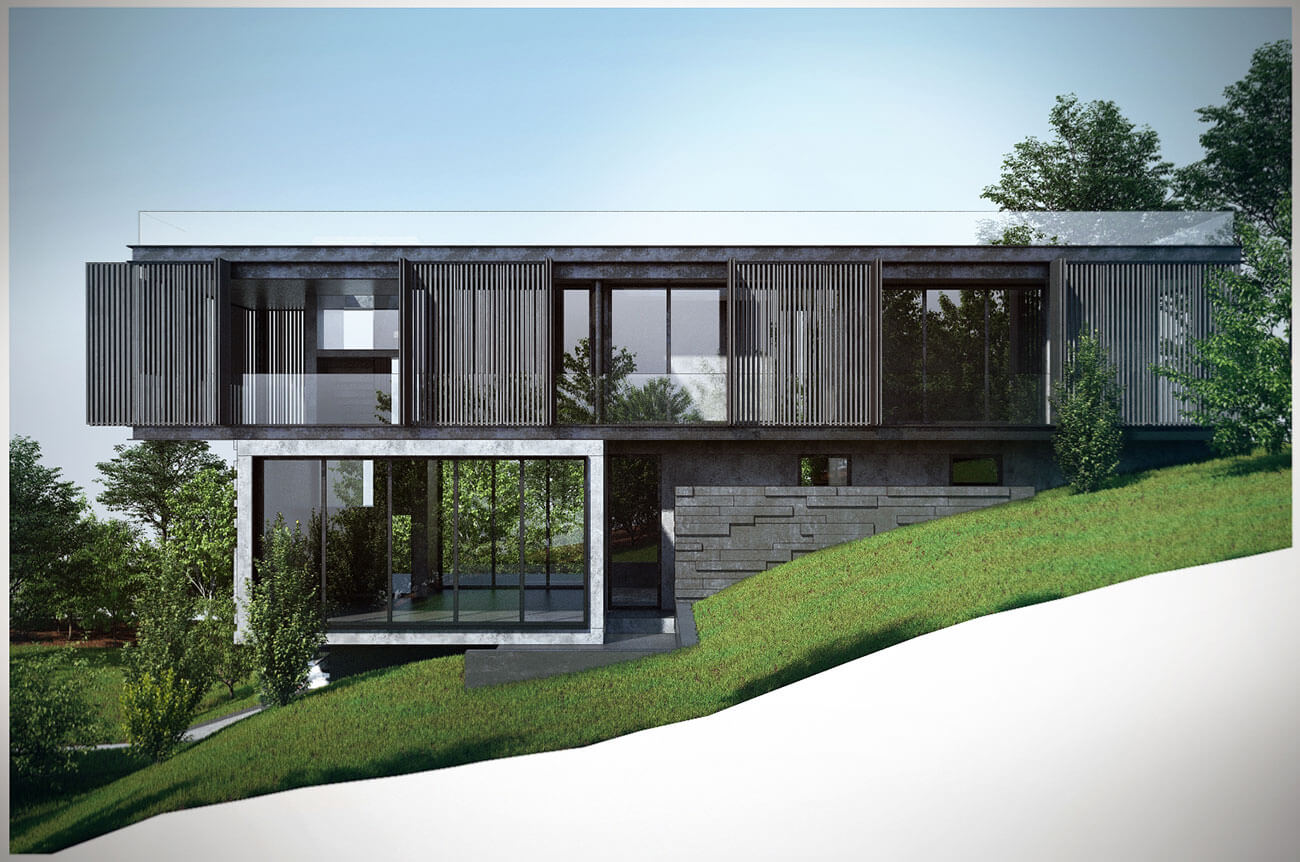 Двухэтажный жилой дом в гористой местности на берегу Черного моря. Дом расположен на участке таким образом, что из каждой его комнаты открывается прекрасный вид на море, горы и виноградники.
