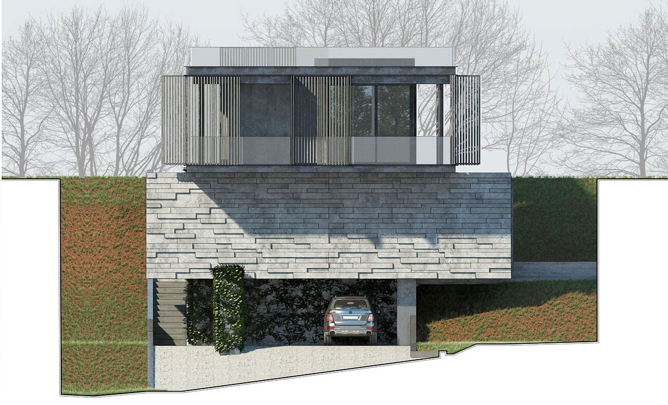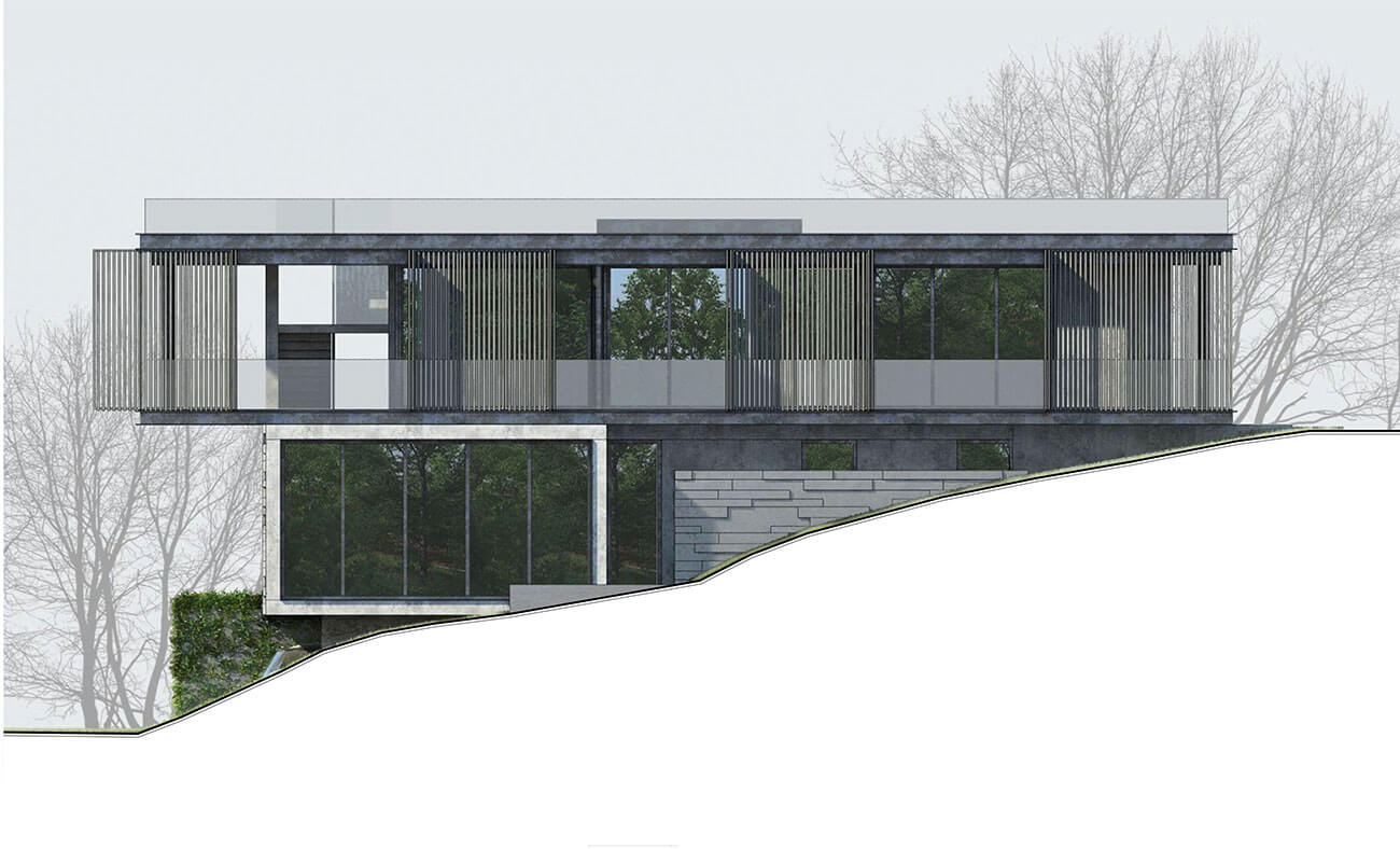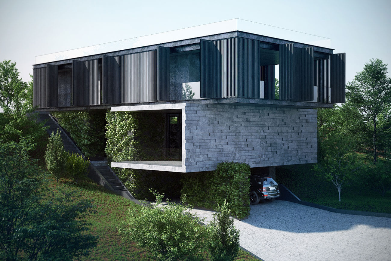 Также в структуре дома организована наружная лестница. По ней в летнее время года можно подняться с уровня террасы первого этажа на уровень кровли. Кровля предполагается эксплуатируемая.