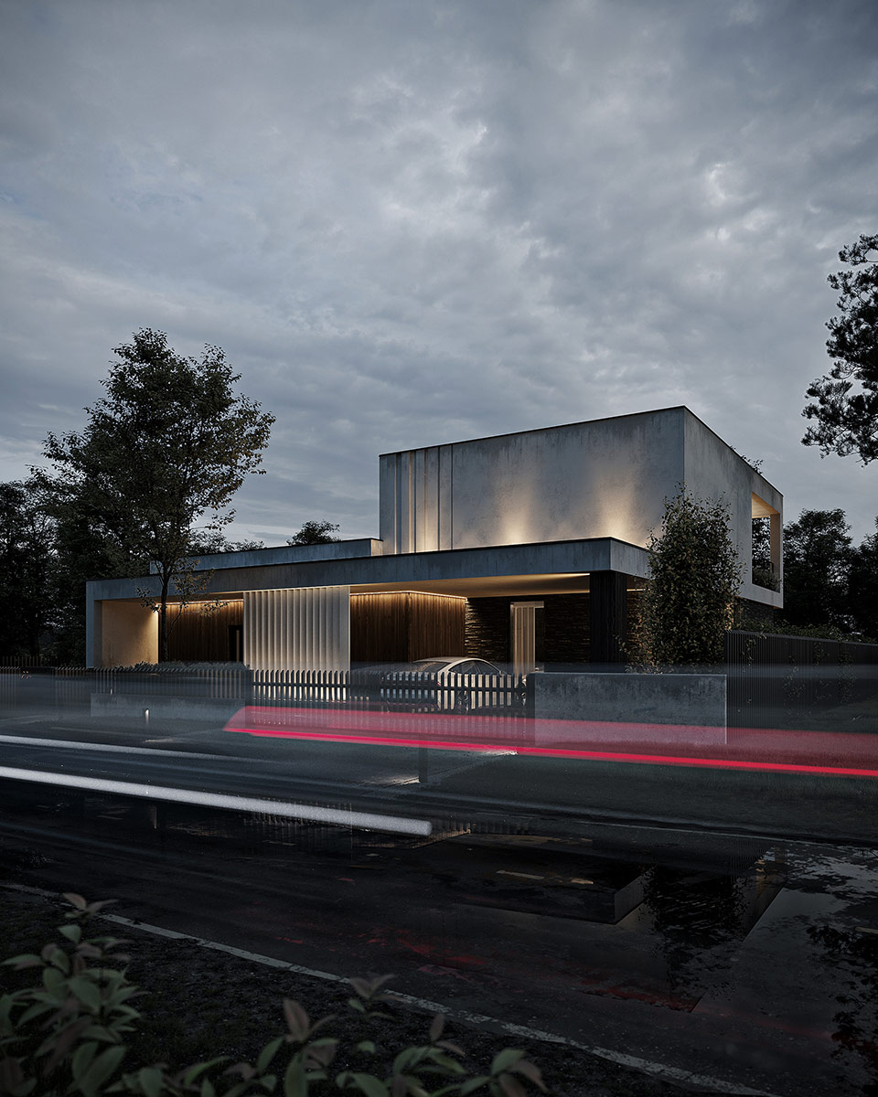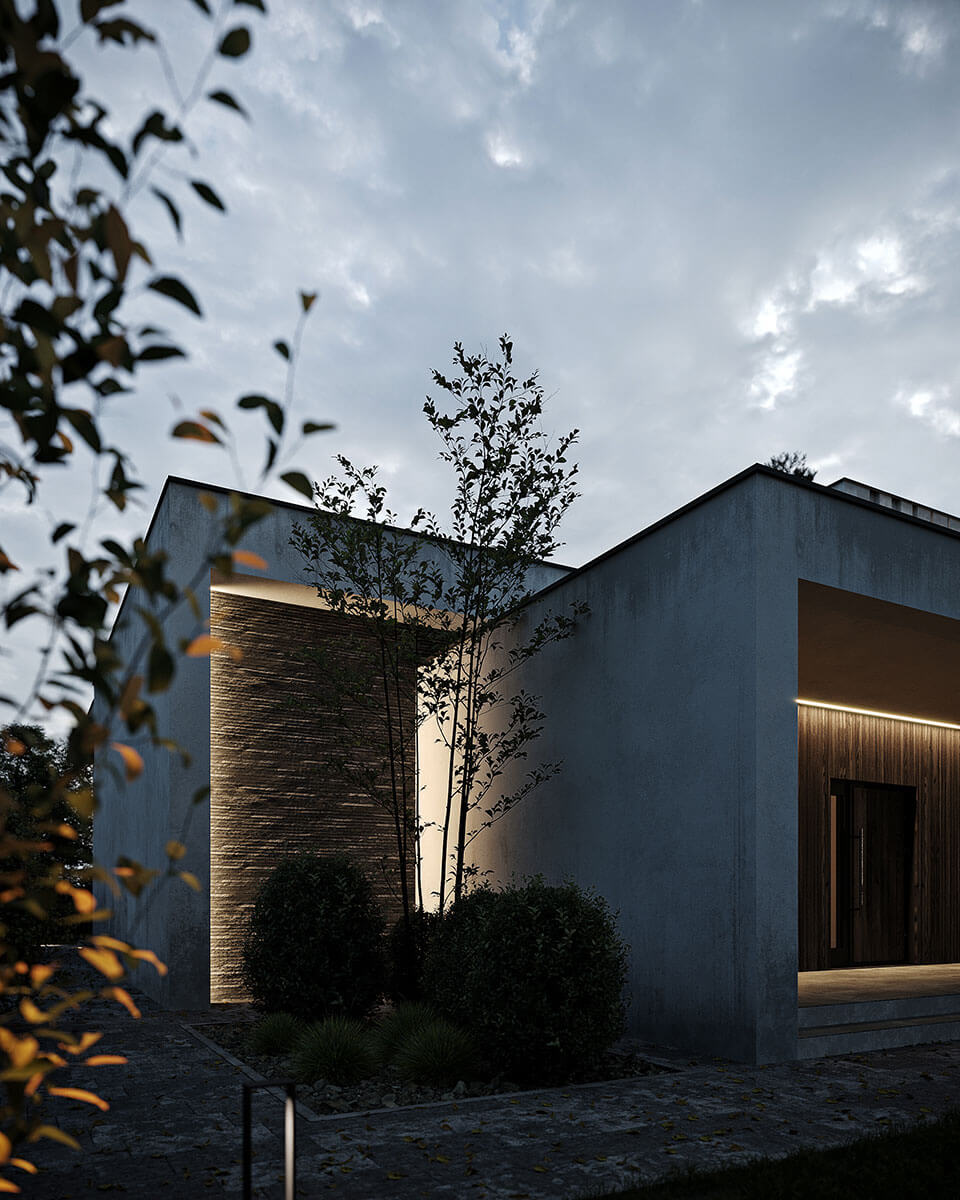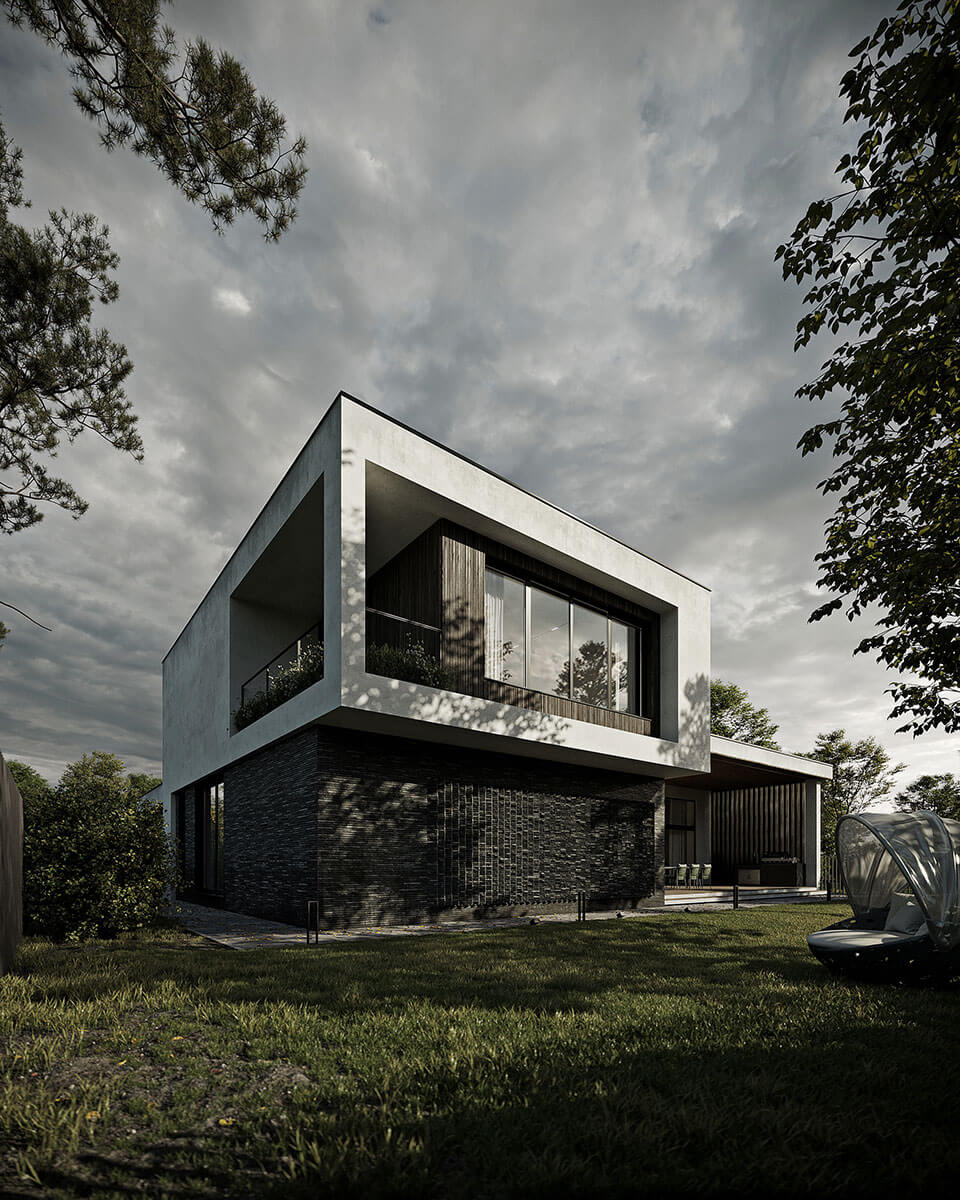 Основная идея проекта – согласовать архитектуру с природой, обособив ее от соседних участков. Для этого была выбрана двухэтажная конструкция, где первый этаж с трех сторон скрыт за живой изгородью, а со второго этажа открывается прекрасный панорамный вид. Кроме этого архитектурная композиция имеет L-образную форму, которая создает уединенный внутренний двор и размывает границы с садом. Соединение объемов создает защищенное пространство внутреннего двора у границ, чтобы тщательно скрыть внутренние функции, которые, в свою очередь, открываются панорамными окнами в центральный внутренний двор.