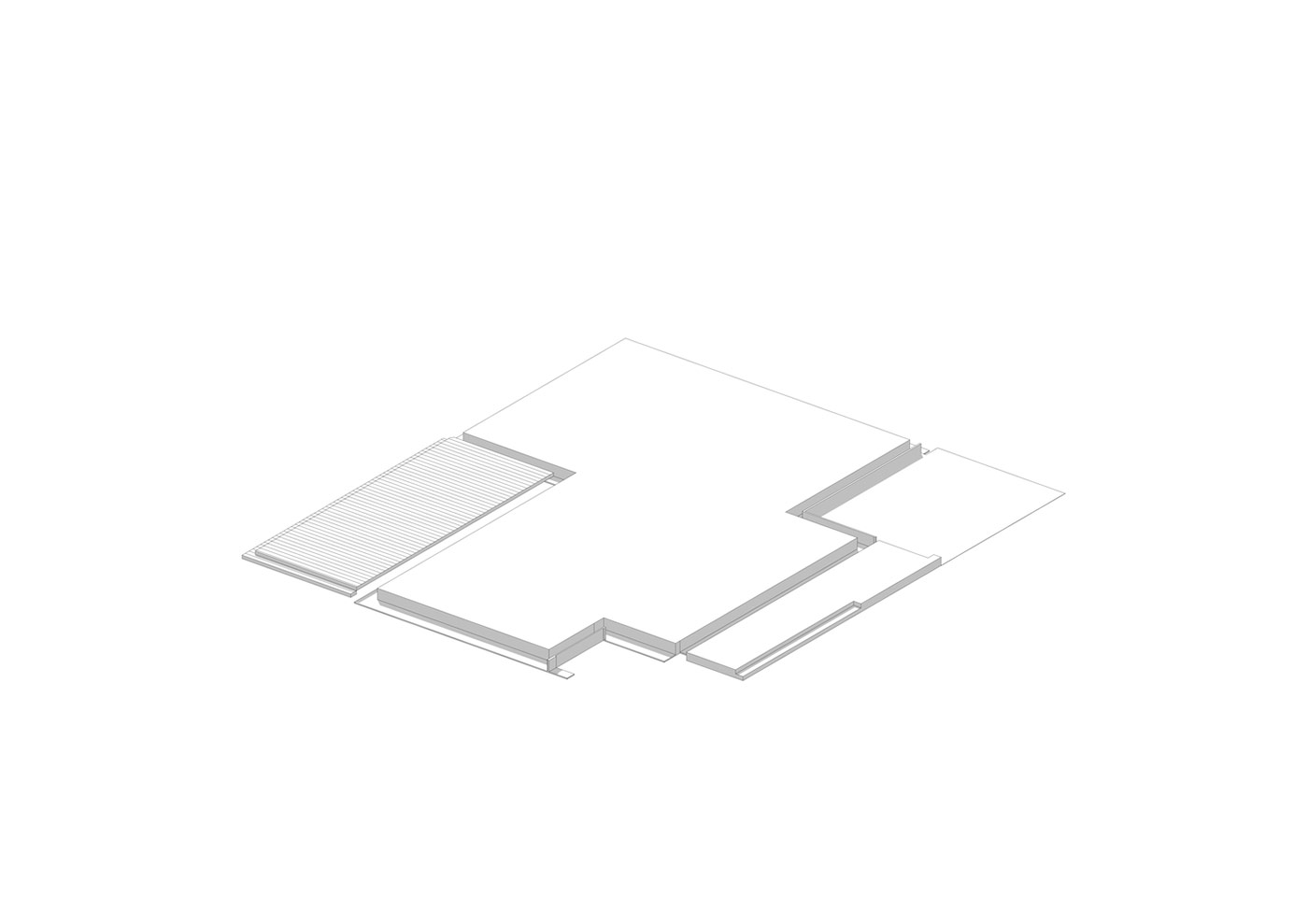 Первый этаж состоит из двух блоков. Это сделано для того, чтобы создать уединенный внутренний двор и усилить контакт с садом. В основной части находятся гостиная, столовая и кухня, которые выходят во внутренний двор. Во втором блоке расположились вспомогательные помещения: кабинет, откуда можно попасть на задний двор, тренажерный зал и технические помещения.