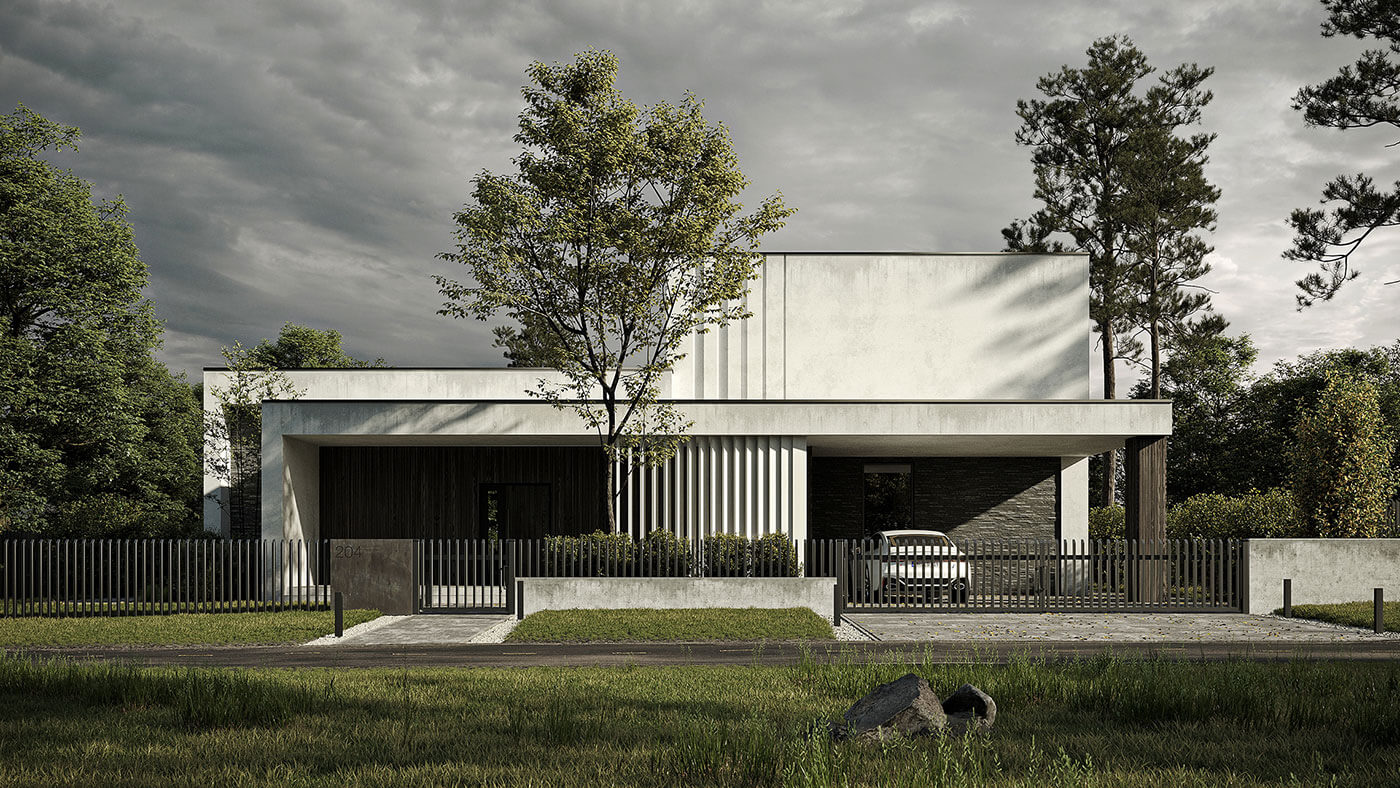 Главный фасад дома ориентирован на юго-восток, что позволяет наслаждаться рассветом. Ко двору примыкает открытый навес с летней кухней и террасой. Еще один навес расположился в тени деревьев и вмещает в себя два парковочных места.