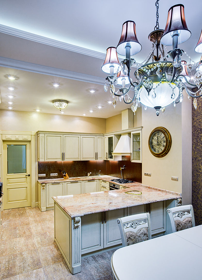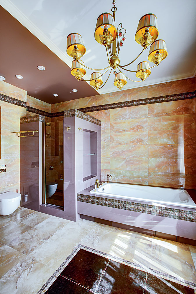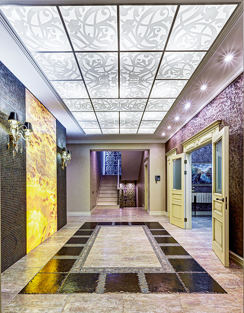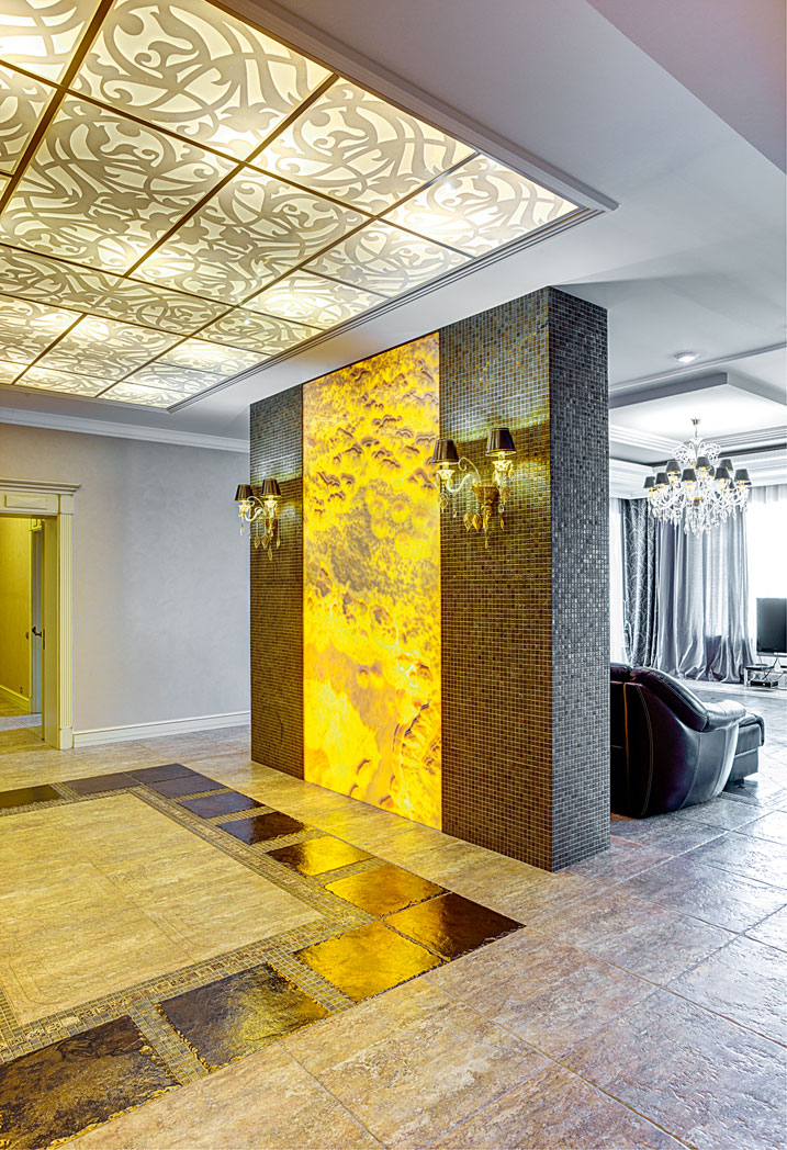 Основным художественным акцентом холла, как и гостиной, стала стена сложной конструкции, выложенная натуральным ониксом, с декоративной подсветкой и выкатной системой освещения. Слэбы оникса в холле и гостиной совпадают по размерам, цвету и рисунку. В поисках двух одинаковых слэбов с подходящим рисунком и цветом авторы проекта объездили все Подмосковье и в результате нашли идеальный вариант. Теплое золотистое сияние оникса создает в доме атмосферу праздника и эмоционального подъема. В гостиной его мягкий свет отражен в многоярусной люстре, соответствующей масштабу панорамного окна.