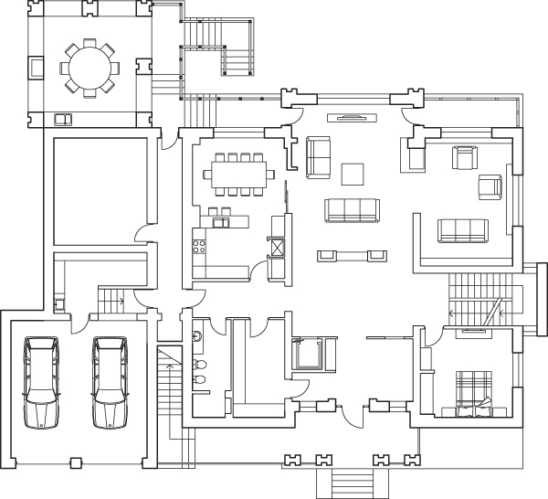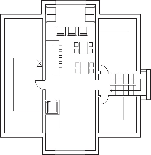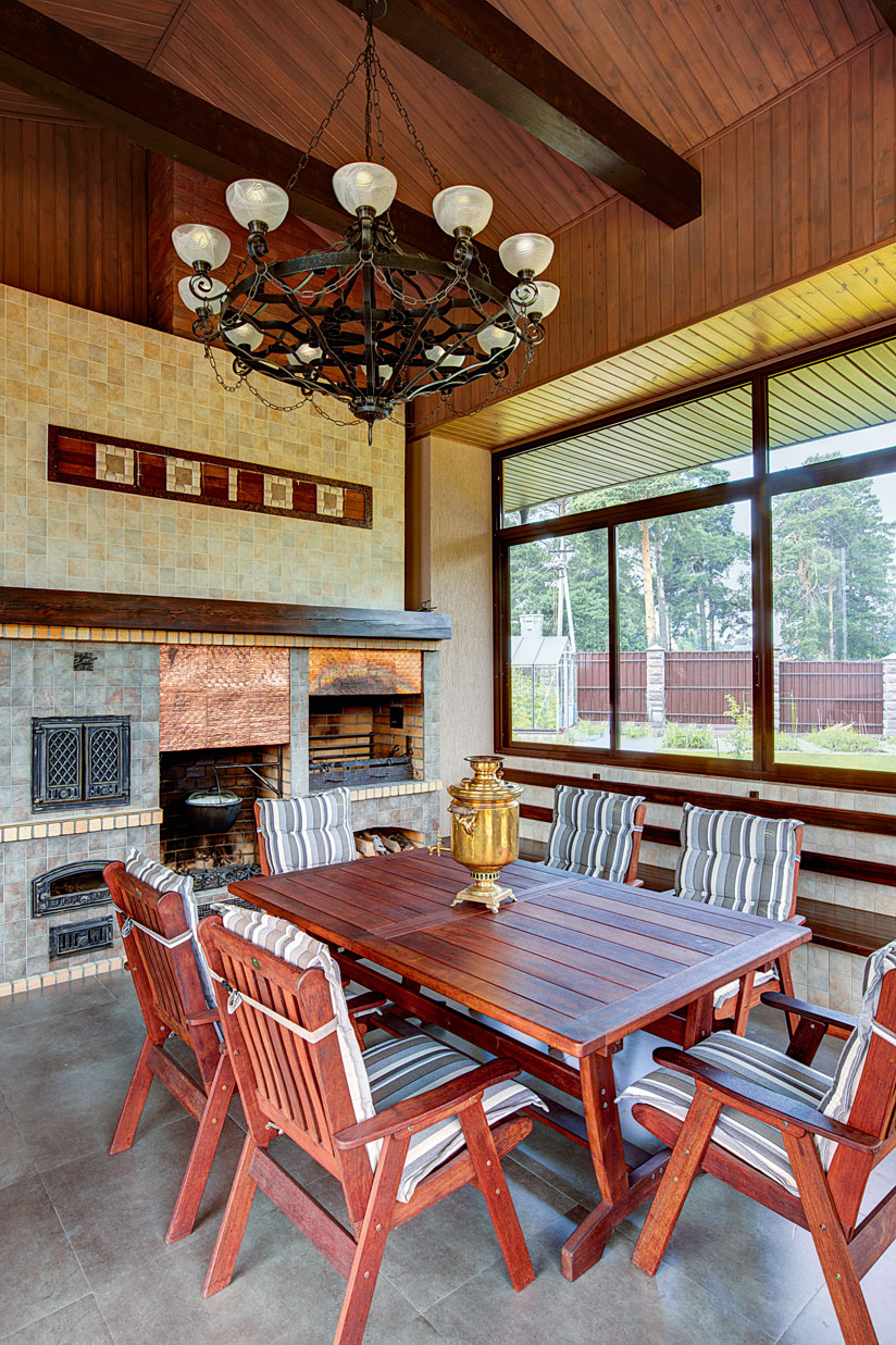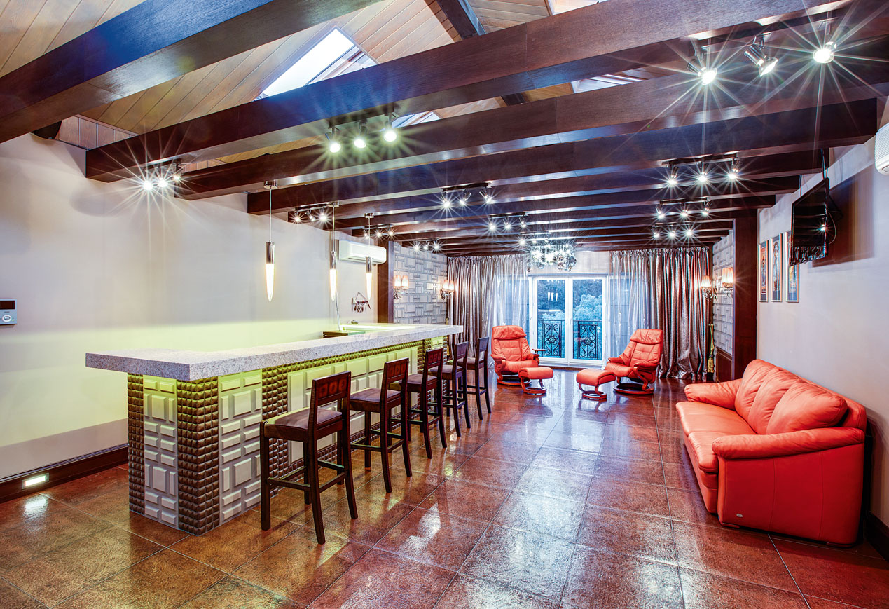 Мансардный этаж особняка получил в проекте название «ресторан». Пространство площадью около ста квадратных метров объединяет функциональные зоны бара, сцены и отдельной кухни. В его дизайне использованы современные конструктивистские приемы и яркие, активные, открытые цвета. Основным материалом во всех помещениях третьего этажа стал камень, которым выложены полы. Каменный пол присутствует и в уютной зоне барбекю с многофункциональным очагом для приготовления блюд.