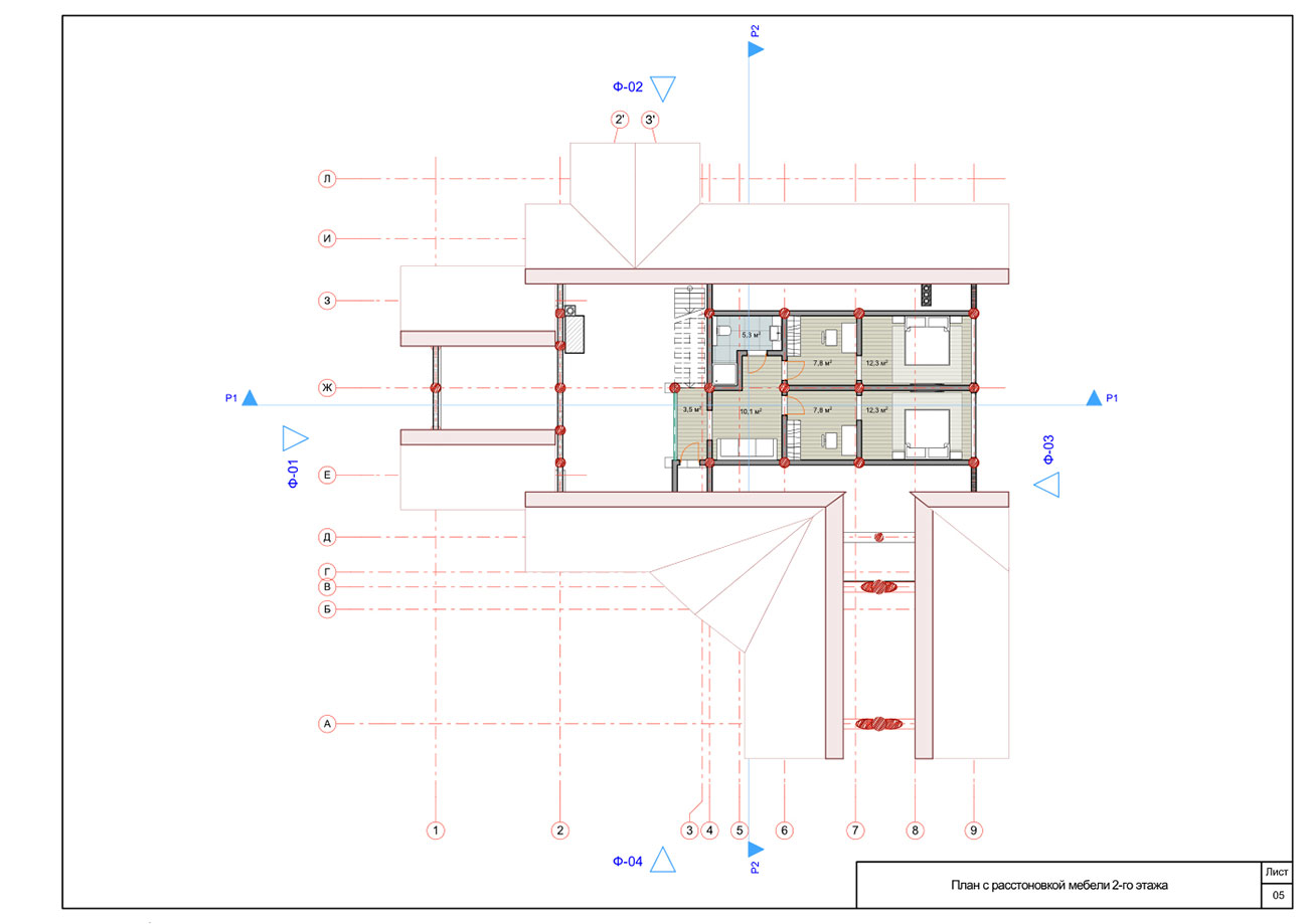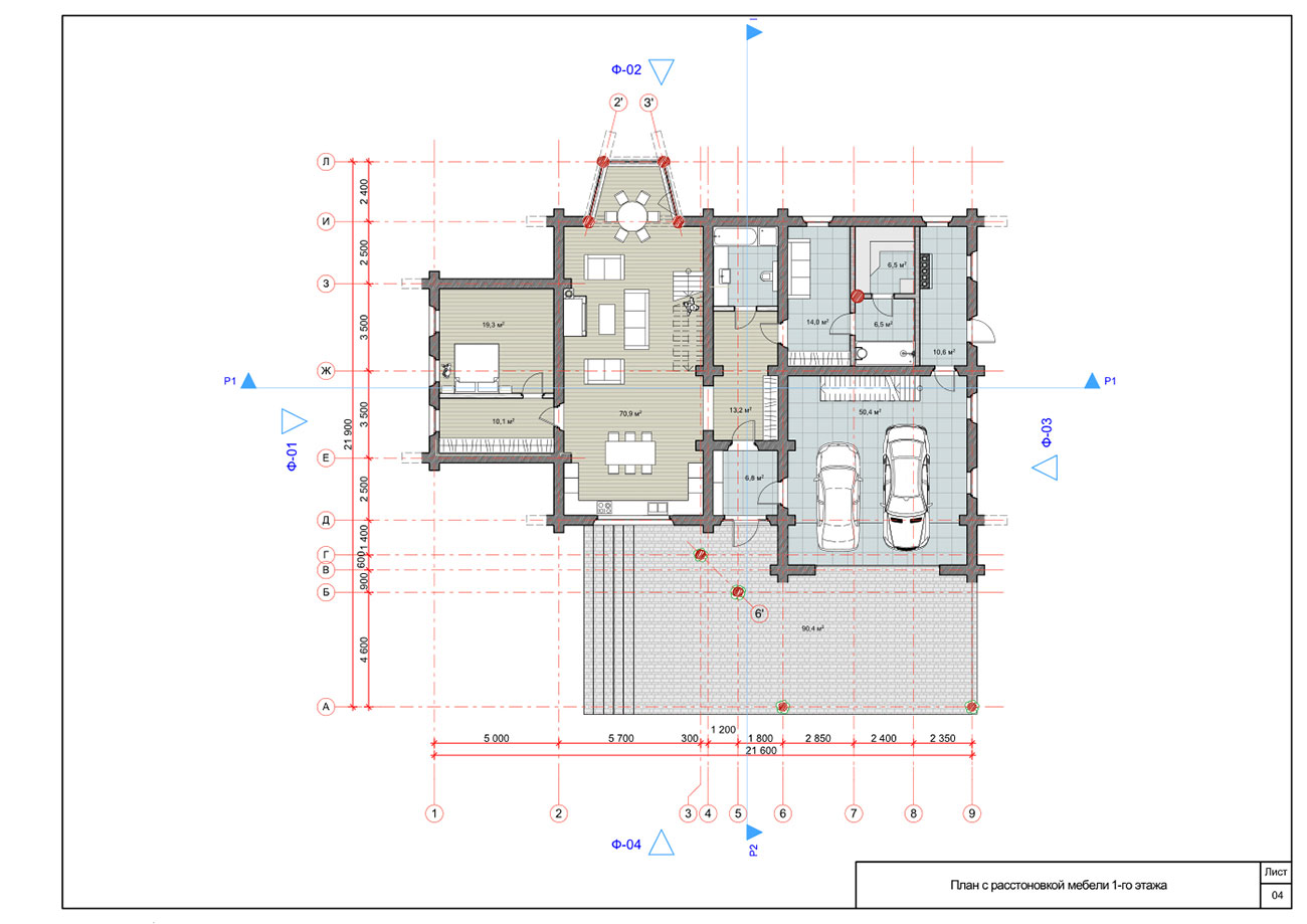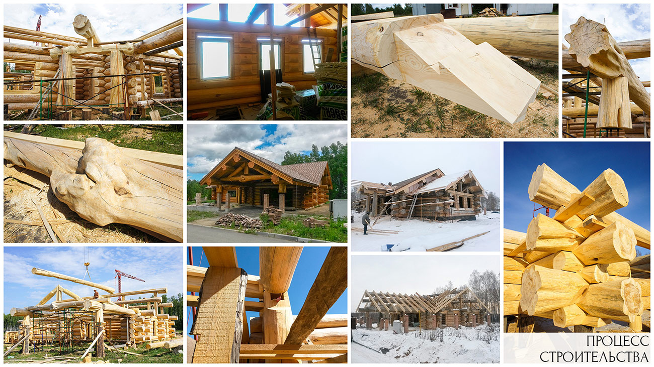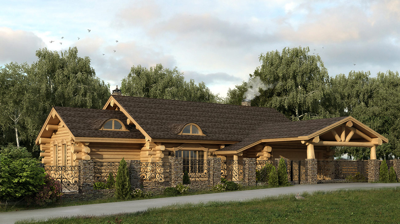 Дом из бруса со встроенным гаражом и баней общей площадью 275,8 м² выполнен по технологии «ручной» канадской рубки. Здание включает сразу несколько функциональных блоков: блок жилых помещений, банный комплекс, гараж и котельная.
