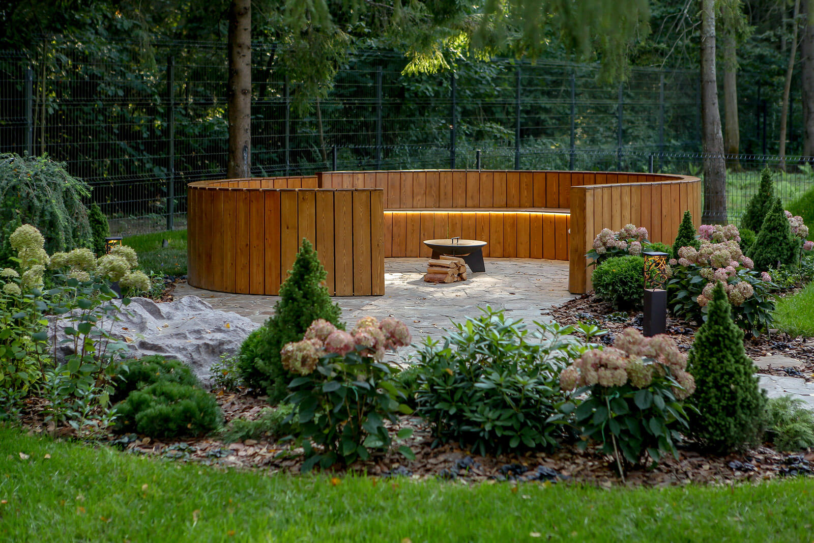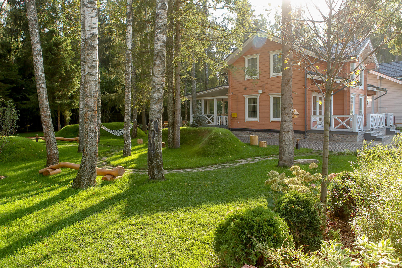 Участок разделен на зоны. В «лесной» части сосредоточены основные крупномерные деревья и геопластика, в виде трёх холмов неправильной формы, между которыми пролегает лесная тропа из плитняка. Зона очага со скамьей, выполненной по индивидуальному проекту, служит точкой притяжения всей семьи в тёплые летние вечера за чашкой чая. Зона окружена миксбордером с декоративными многолетниками и деревьями. За еще одним холмом разместилась плодовая зона с яблонями, грушей, малиной и голубикой, а в грядках высажена лесная земляника-любимица заказчиков. В центре кустарниковой композиции возле входа в дом высажено яркое новогоднее дерево — ель колючая эдит. Стоит упомянуть спортивный уголок сада — воркаут площадку с хозяйственным блоком для хранения инвентаря. Здесь заказчики будут заниматься любимым видом спорта.