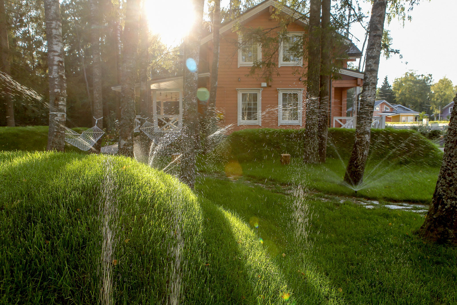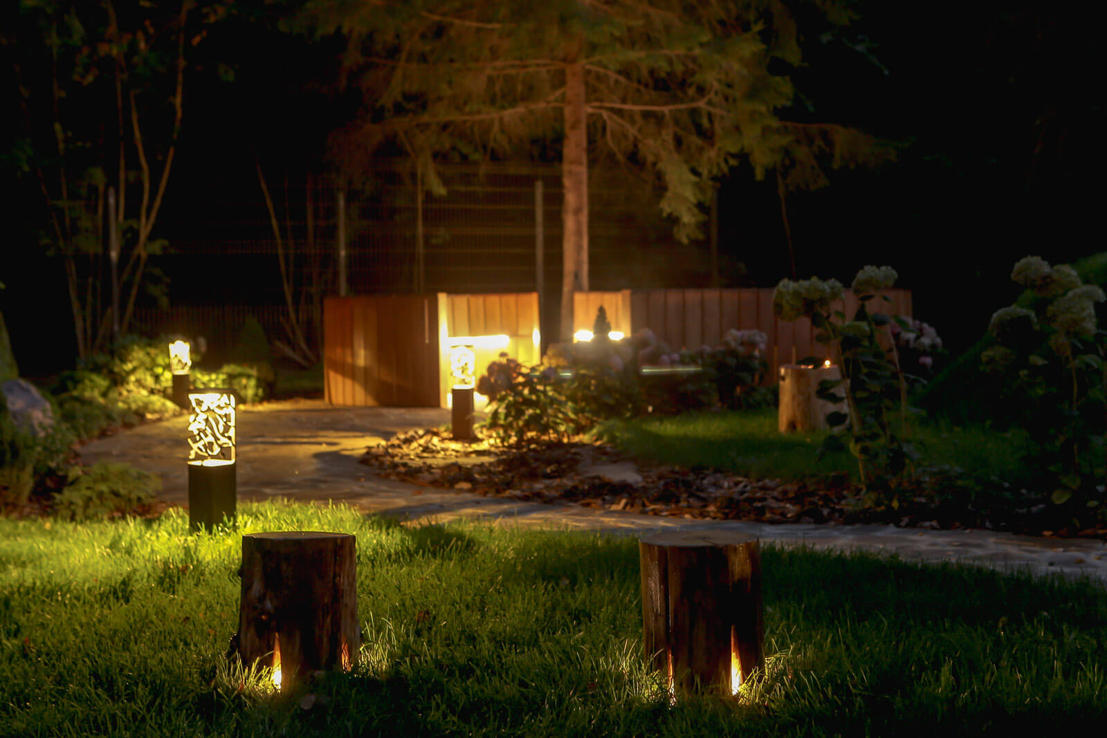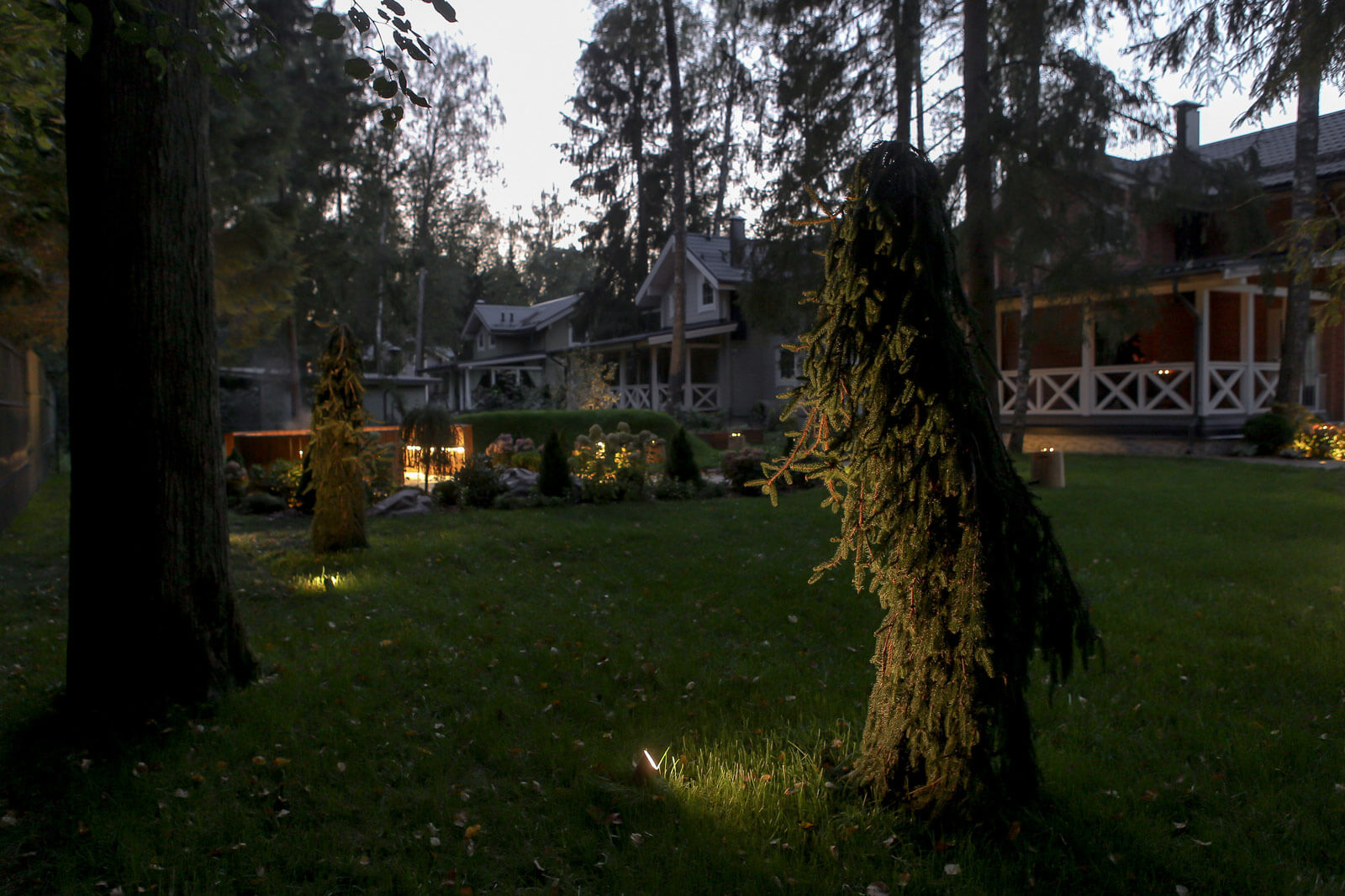Ночью сад приобретает особый шарм, благодаря декоративной подсветке. Основным источником света служат ландшафтные светильники столбики, свет от которых красиво рассеивается на газон, образует различные узоры.