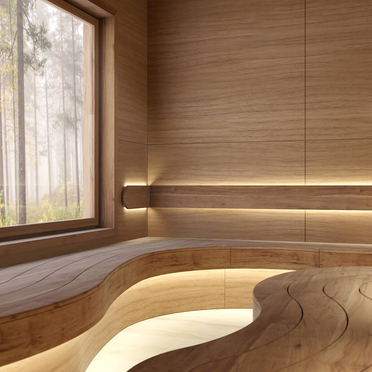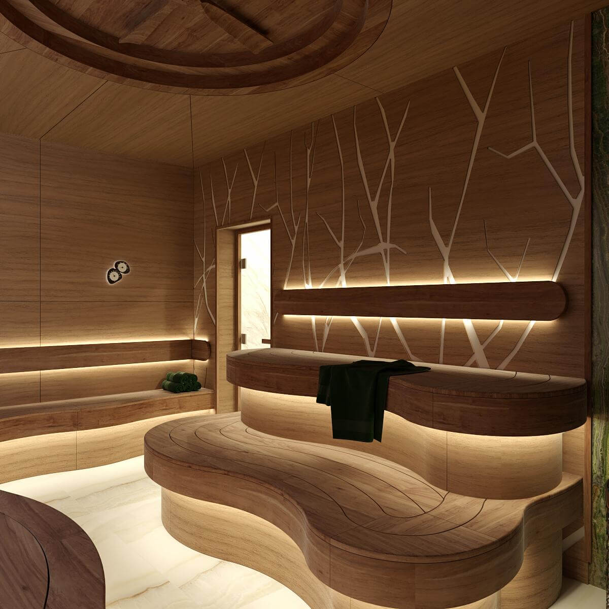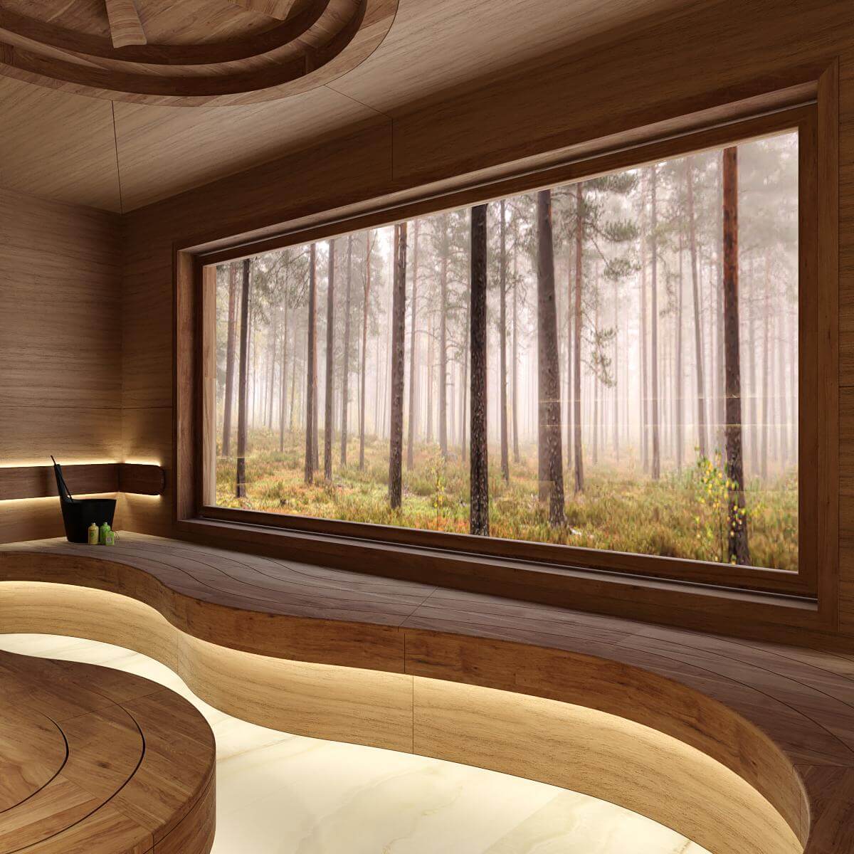 Полки и спинки выполнены из новозеландской термообработанной сосны, а потолок, стены и торцевая зашивка полков из шпонированных панелей Rohol.