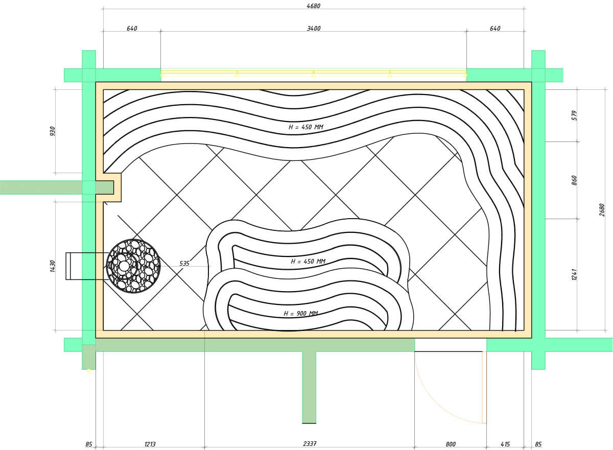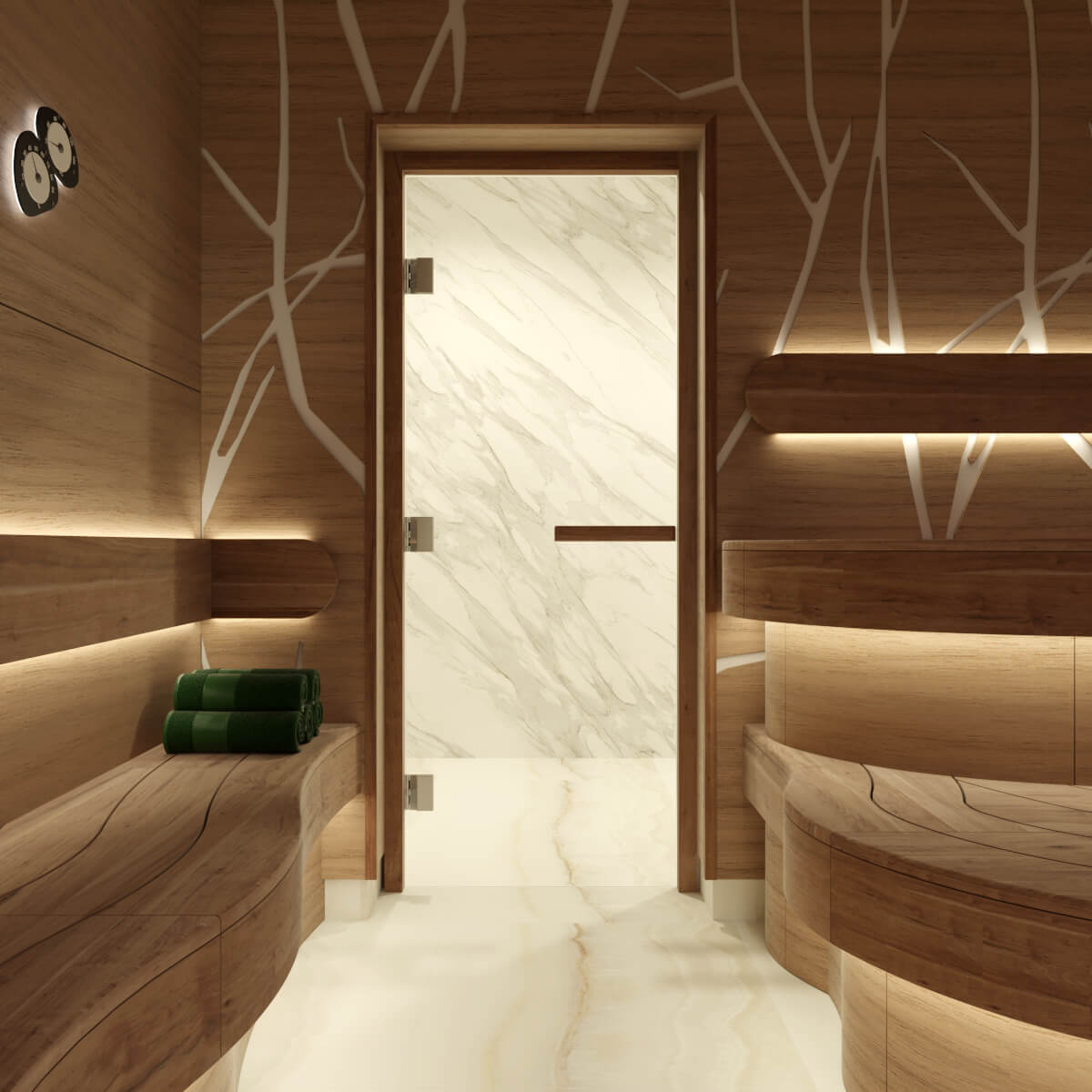 Деревья, силуэты которых легко угадываются на стене, отделка за печью с мраморным рисунком волшебными коричнево-зелеными прожилками, мягкий свет — все эти элементы создают уникальную атмосферу, окунувшись в которую Вы словно попадаете в сказочный лес!