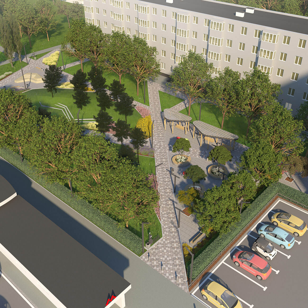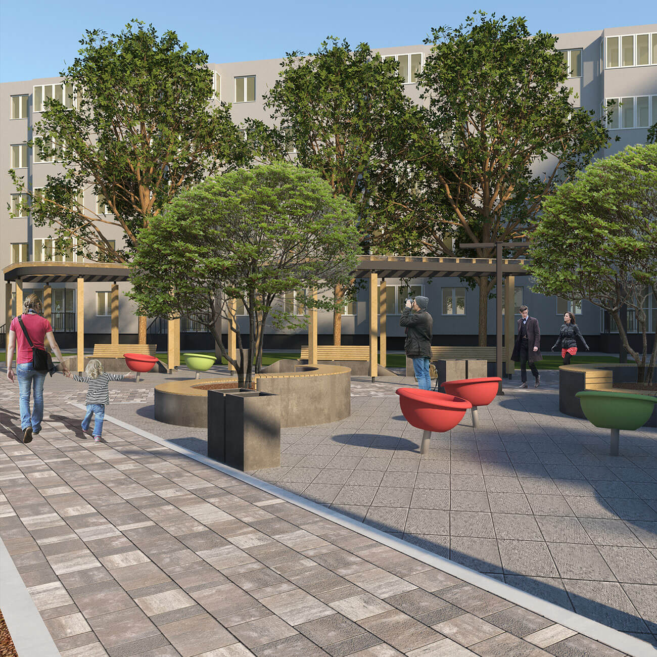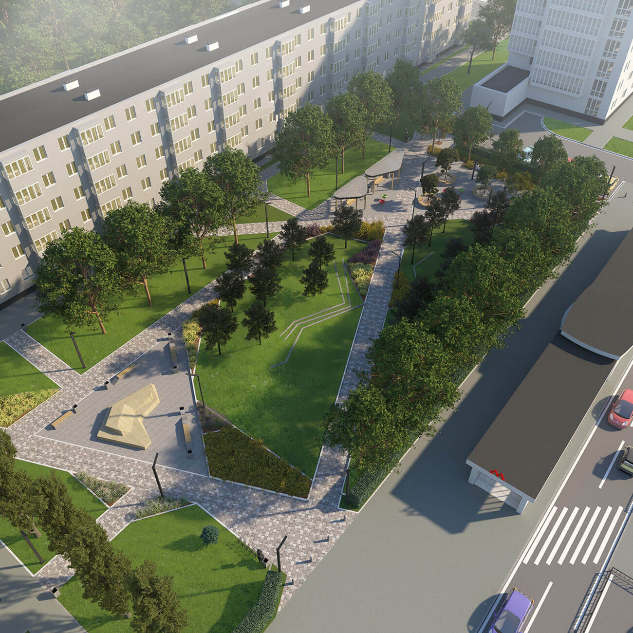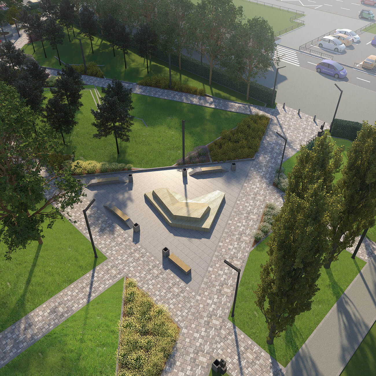 В узловых точках, на пересечении дорожек, проектом предусмотрено размещение площадок для отдыха. Малые архитектурные формы — простые, антивандальные, они подчеркивают современный стиль и наполняют сквер новыми смыслами и функциями. В оформлении территории использованы неприхотливые, максимально адаптированные к климатическим условиям региона растения, такие как сосна черная, липа крупнолистная, спирея серая, спирея японская, можжевельник казацкий «Мас».