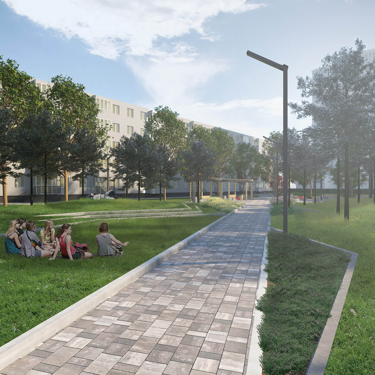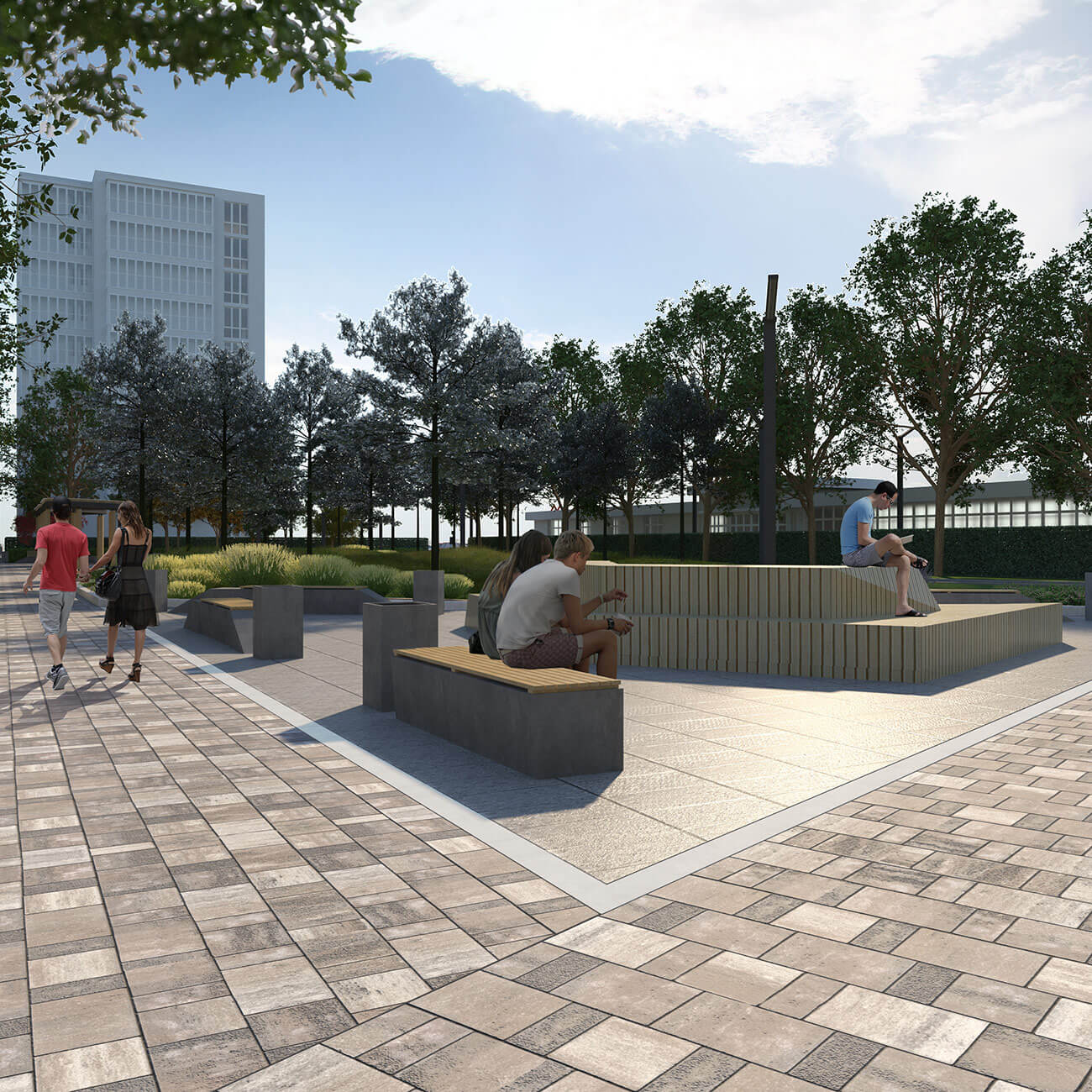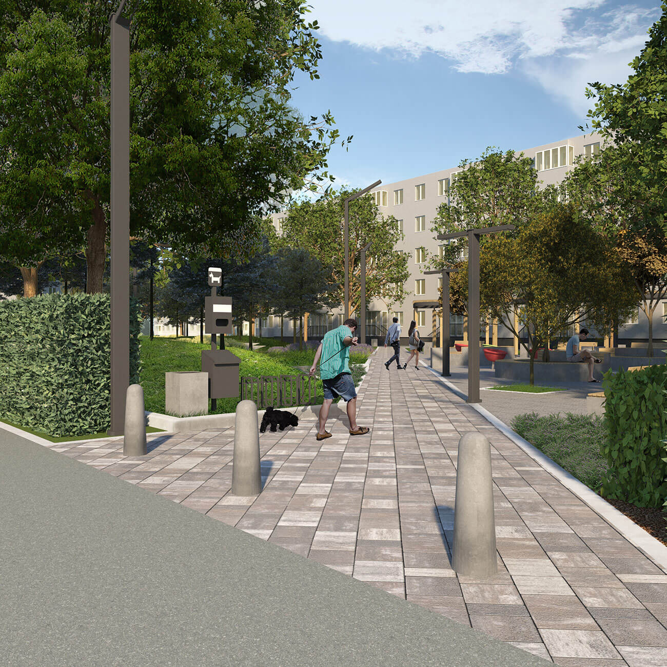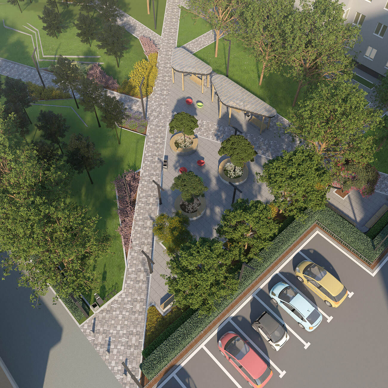 В узловых точках, на пересечении дорожек, проектом предусмотрено размещение площадок для отдыха. Малые архитектурные формы — простые, антивандальные, они подчеркивают современный стиль и наполняют сквер новыми смыслами и функциями. В оформлении территории использованы неприхотливые, максимально адаптированные к климатическим условиям региона растения, такие как сосна черная, липа крупнолистная, спирея серая, спирея японская, можжевельник казацкий «Мас».
