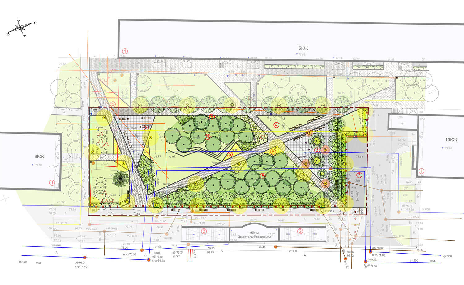 Производственно-революционную тематику названия станции мы перенесли на планировочную структуру сквера. Парк выполнен в современном, деловом стиле. Дорожно-тропиночная сеть связывает свою структуру в единое целое.