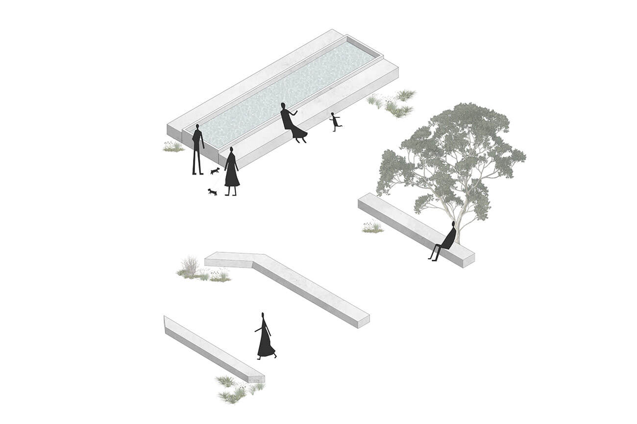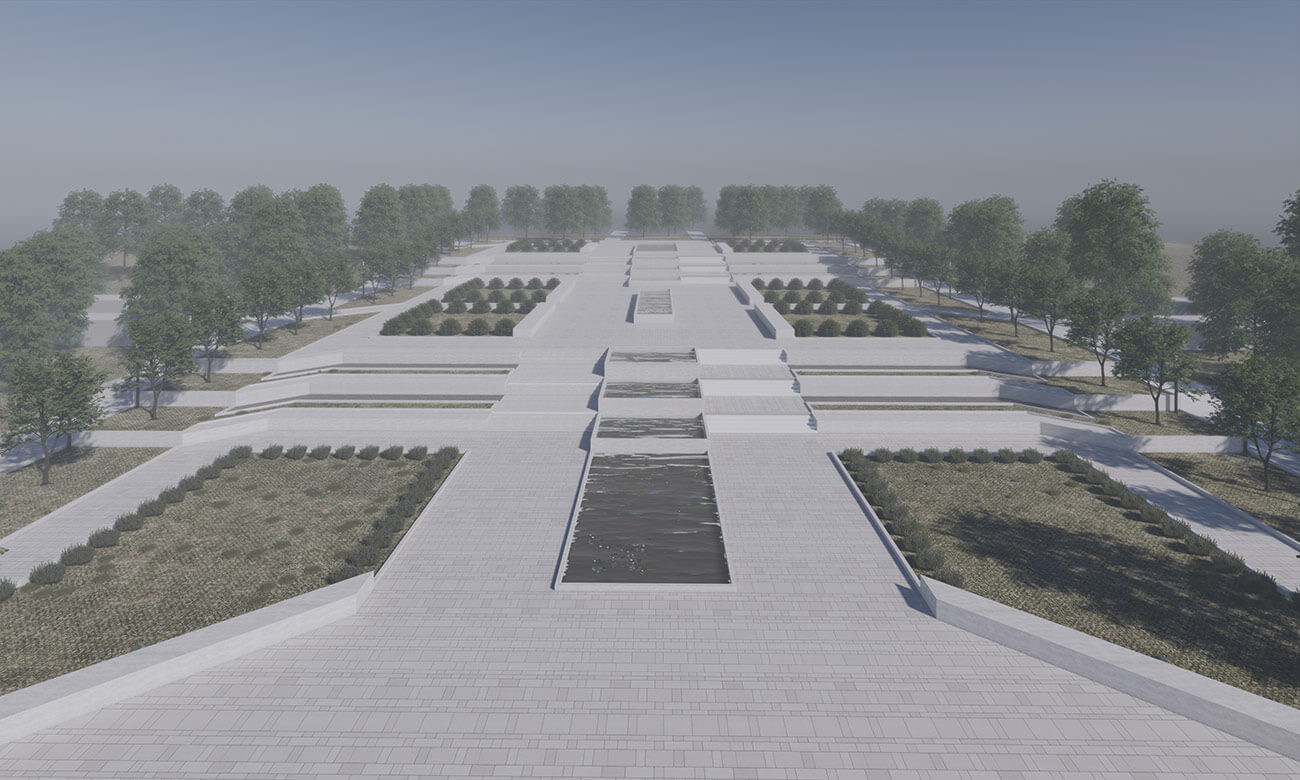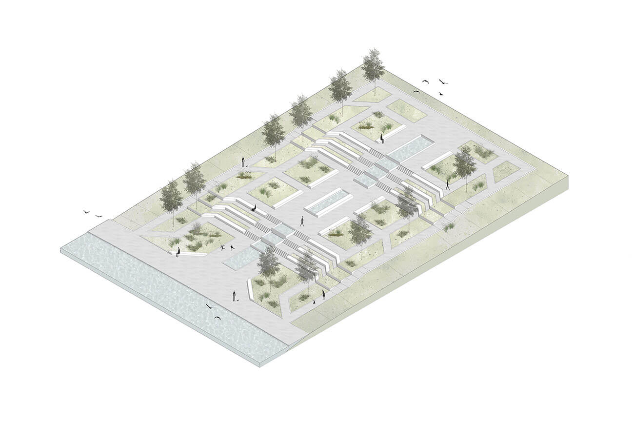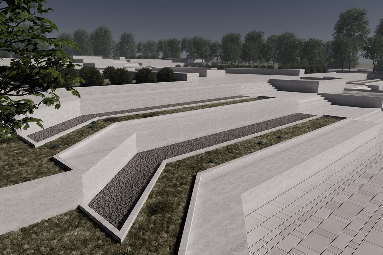 Планировка сквера включает в себя три террасы. Переходы между террасами архитектурно оформлены местами для сидения, лестницами и каскадным бассейном со струями воды. Для людей с ограниченным передвижением попасть на террасы можно по пандусам.