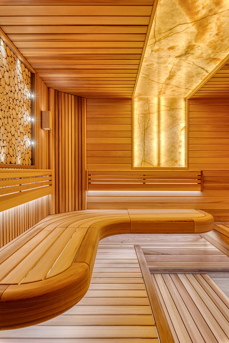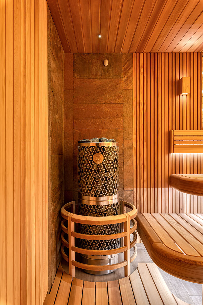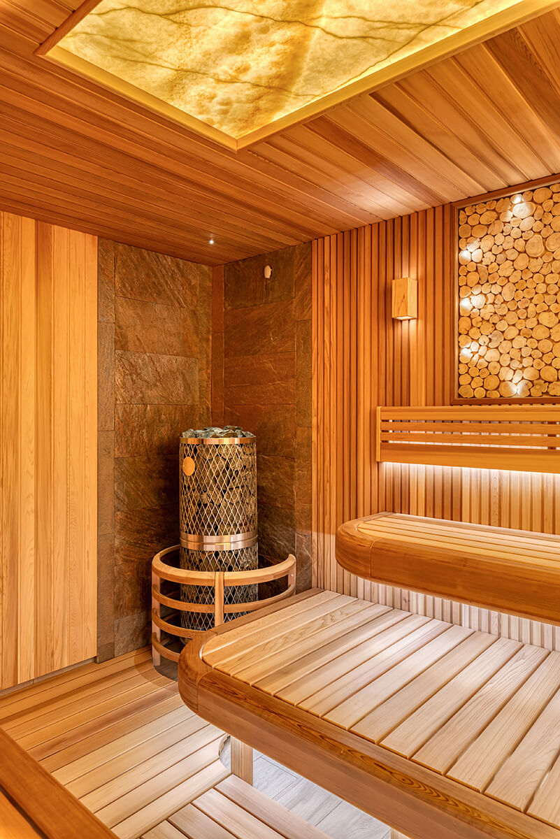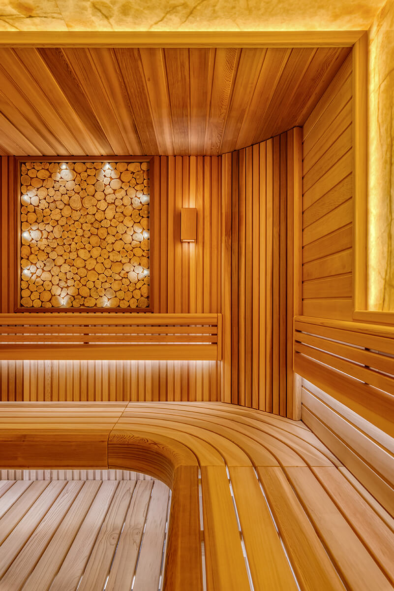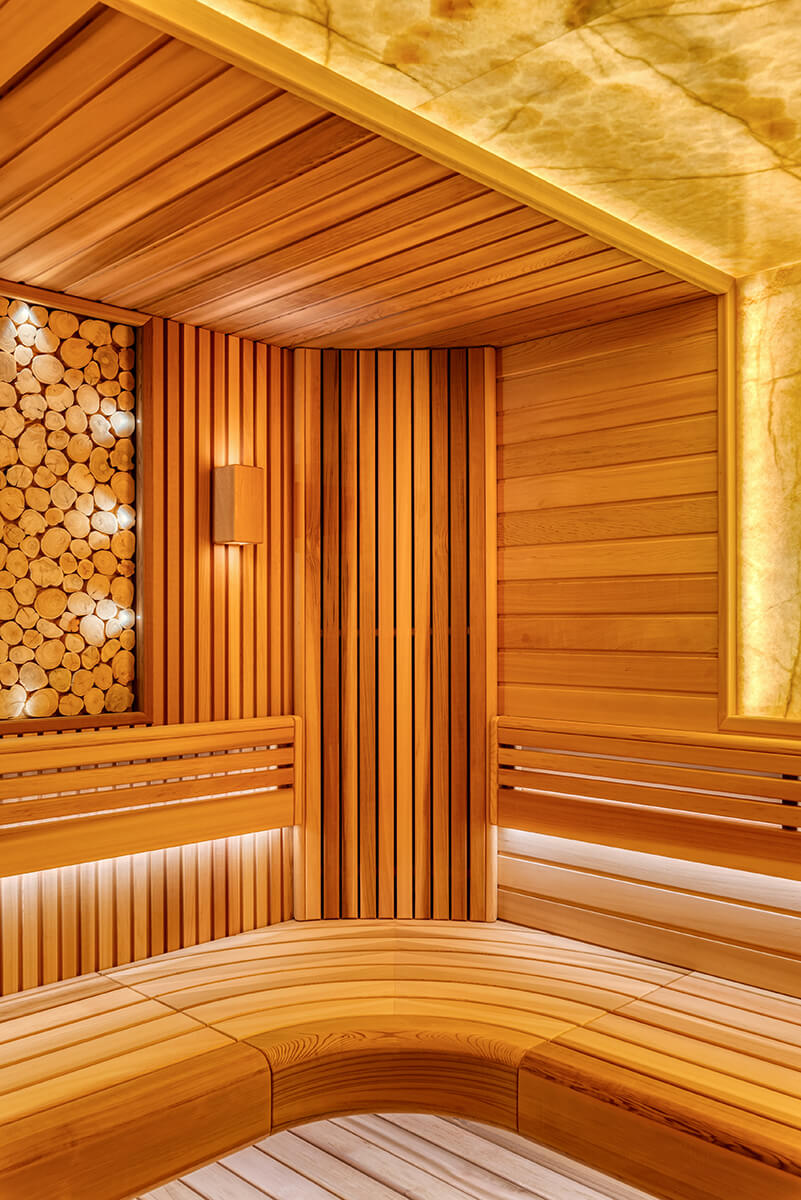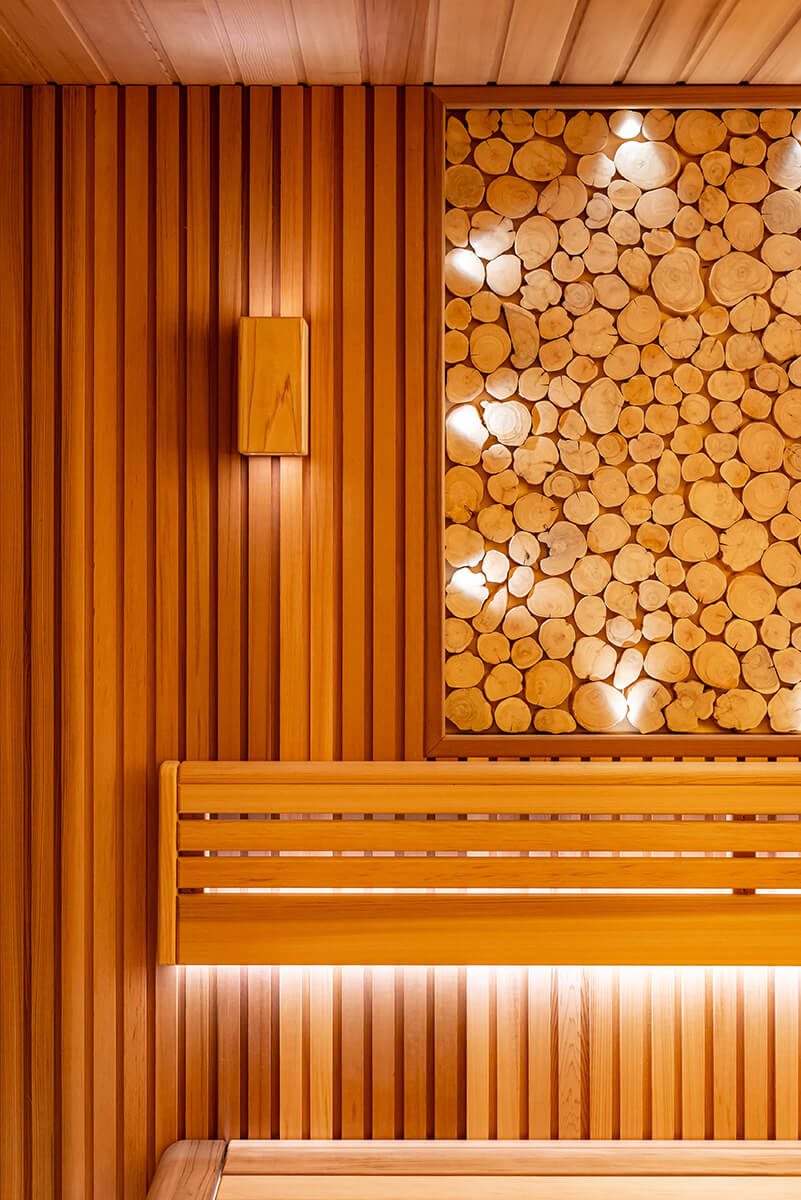 Уютный уголок тепла и комфорта — сауна из ароматного канадского кедра. На стенах — вагонка и реечные панели. Оникс с потолка переходит на стену, насыщает комнату мягким, теплым светом. Яркие ноты можжевелового панно с точечной подсветкой Cariitti дополняют общий букет ароматного леса. Зашивка между полками отсутствует, это дает возможность визуально увеличить пространство. Кромки на торцевых элементах сглажены, углы плавные. Мощная, надежная печь IKI с большим объемом камней обеспечит обильное парообразование и мягкое тепло.
