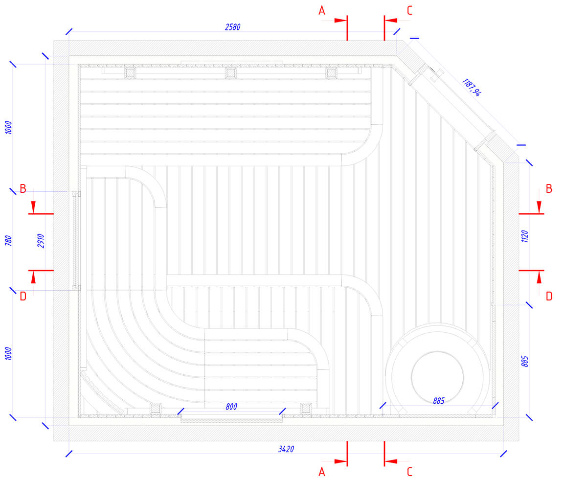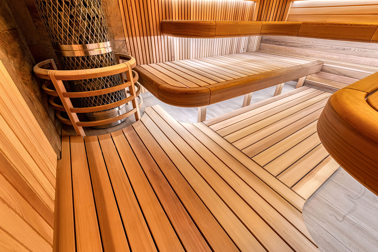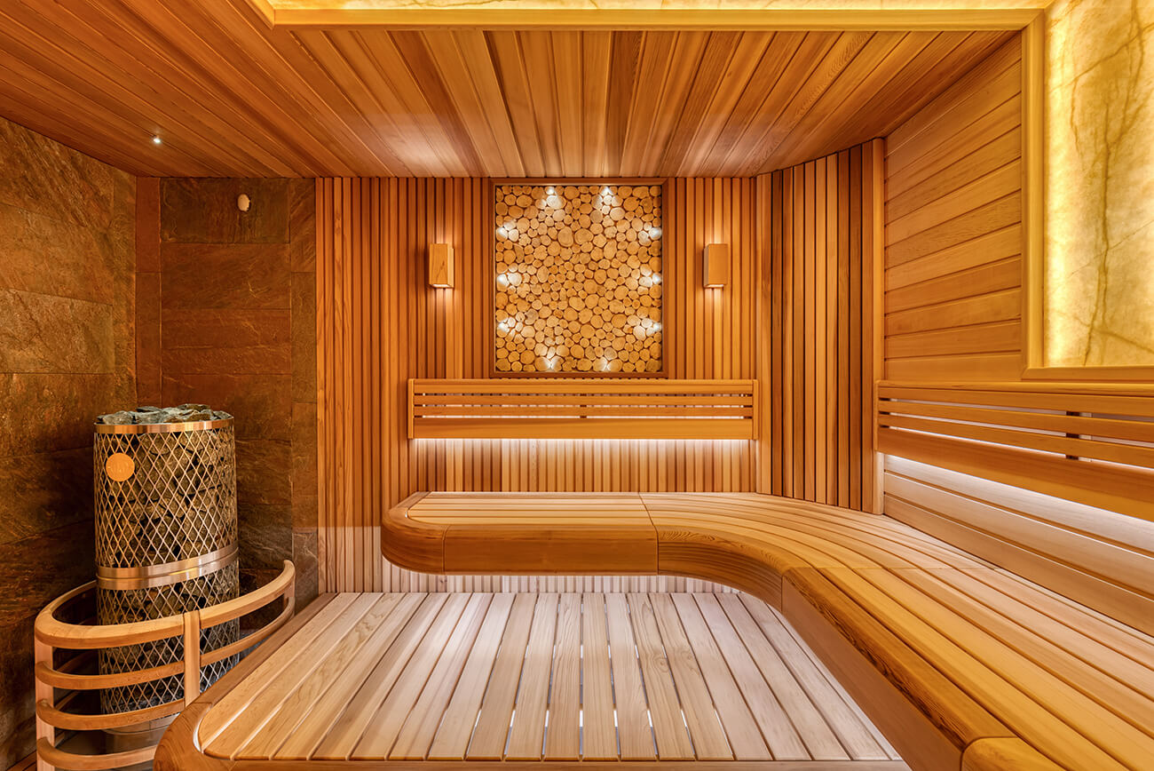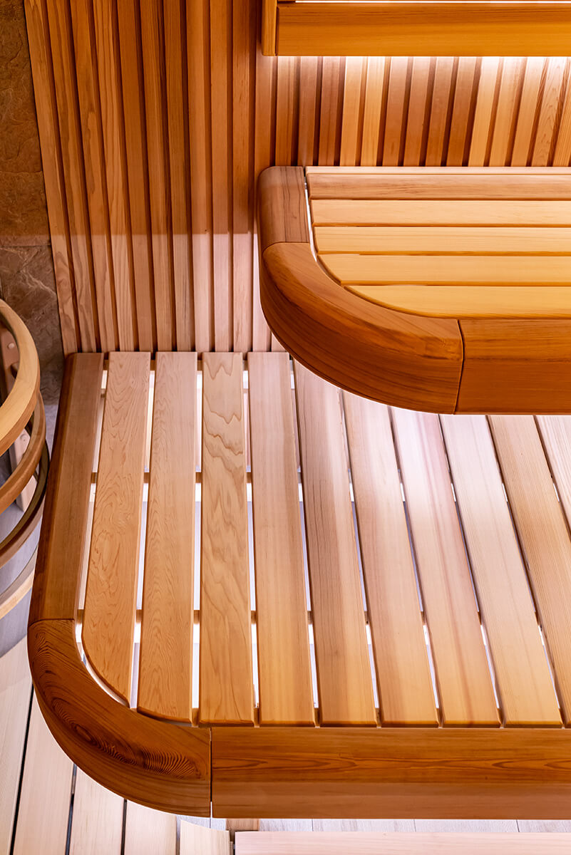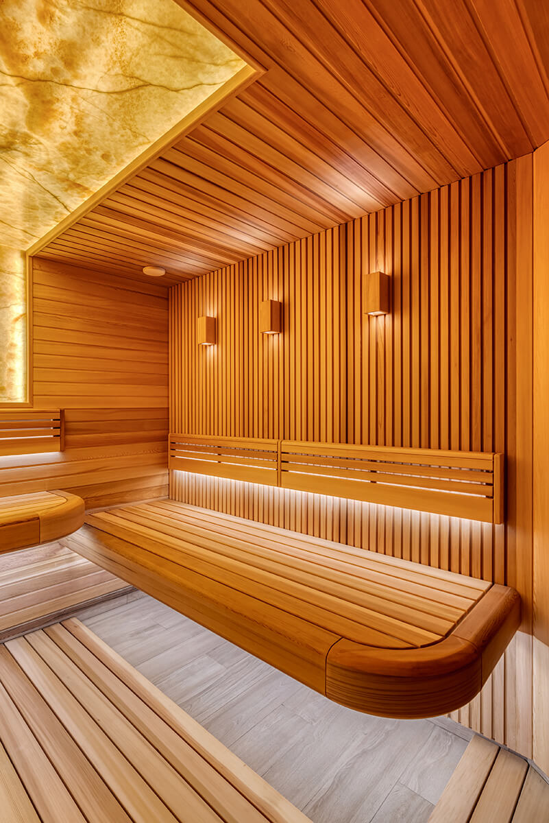 Уютный уголок тепла и комфорта — сауна из ароматного канадского кедра. На стенах — вагонка и реечные панели. Оникс с потолка переходит на стену, насыщает комнату мягким, теплым светом. Яркие ноты можжевелового панно с точечной подсветкой Cariitti дополняют общий букет ароматного леса. Зашивка между полками отсутствует, это дает возможность визуально увеличить пространство. Кромки на торцевых элементах сглажены, углы плавные. Мощная, надежная печь IKI с большим объемом камней обеспечит обильное парообразование и мягкое тепло.