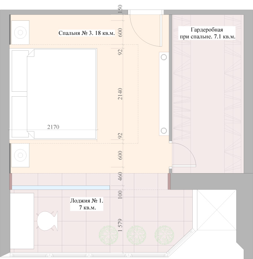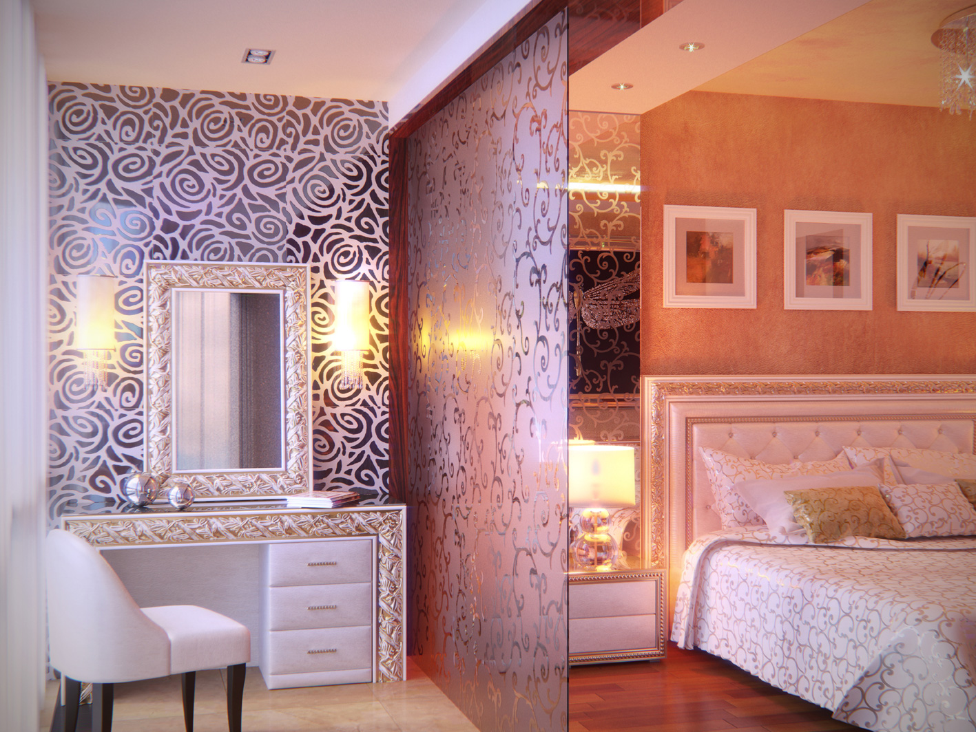 Помещение, по которому представлена визуализация — хозяйская спальня. Пространство представляет собой двухчастное помещение, две зоны которого отделяются друг от друга декоративной стеклянной перегородкой с растительным орнаментом. Общая площадь пространства составляет 24,7 м².