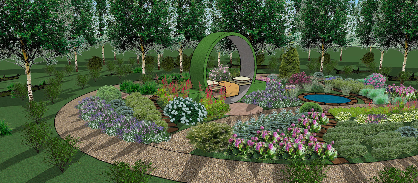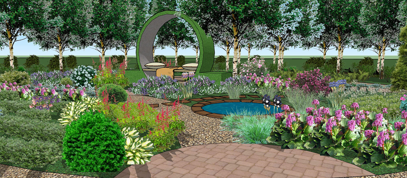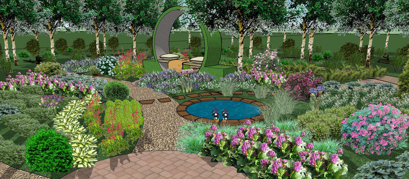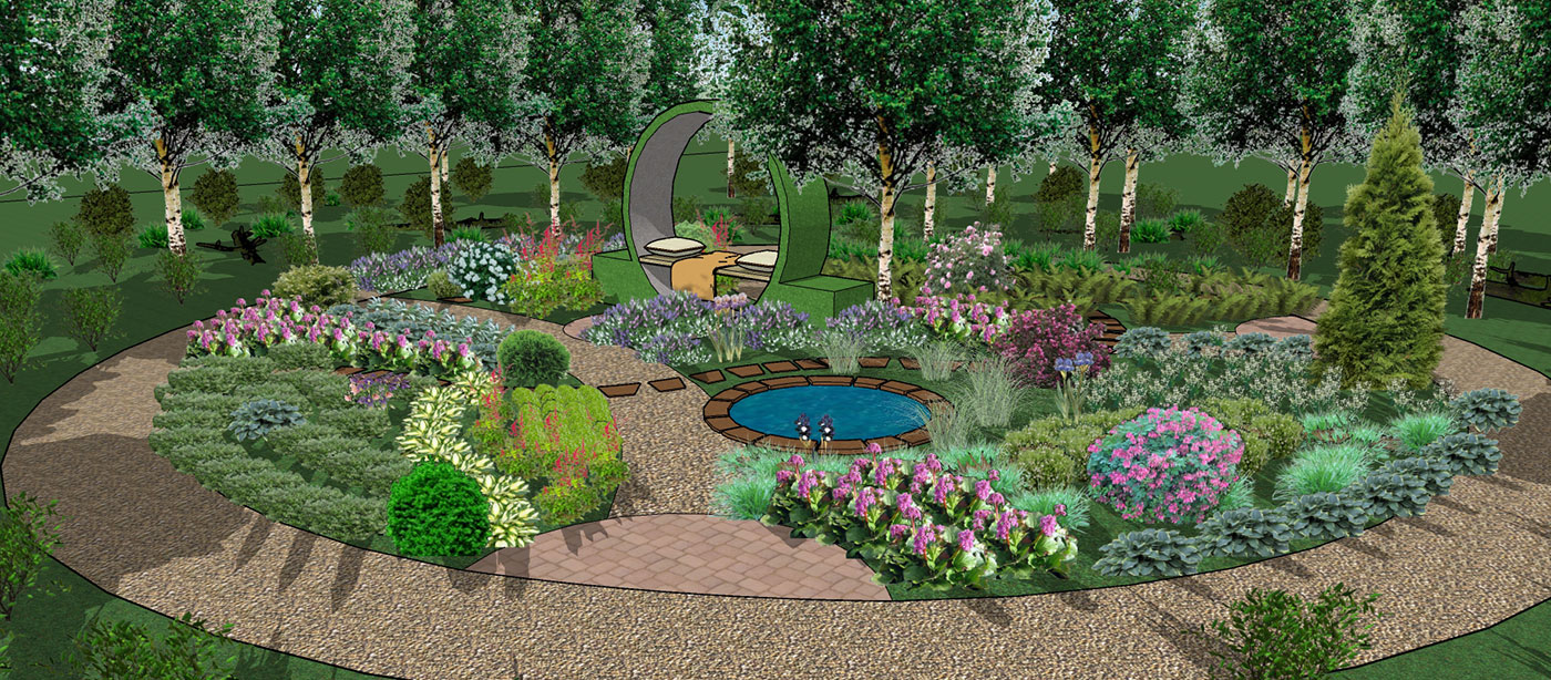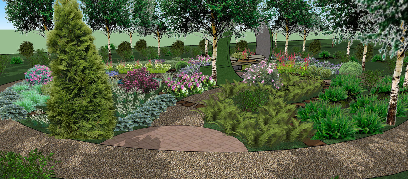 Основа проектируемого сада — березово-осиновый лес. В ассортименте растений сада использовались травы, почвопокровные растения и кустарники для полутенистых и тенистых садов.