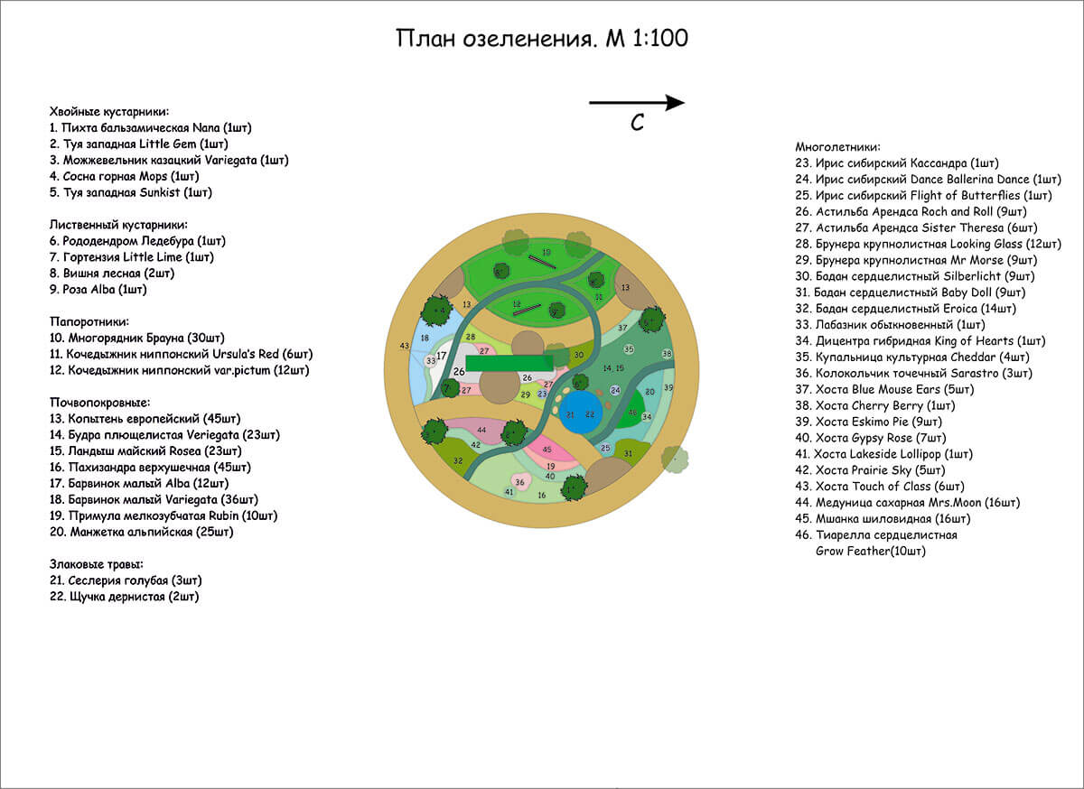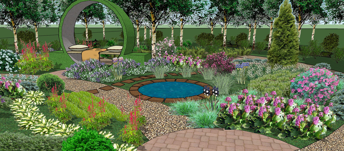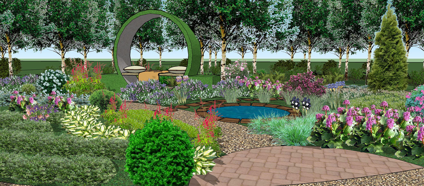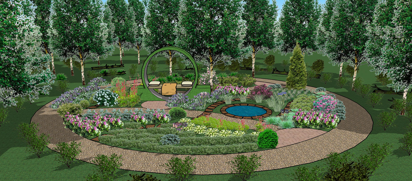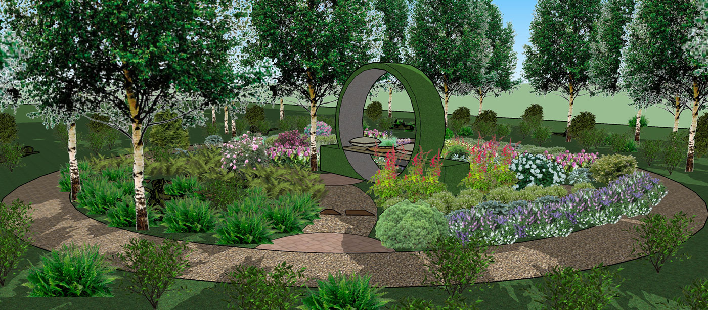 Основа проектируемого сада — березово-осиновый лес. В ассортименте растений сада использовались травы, почвопокровные растения и кустарники для полутенистых и тенистых садов.