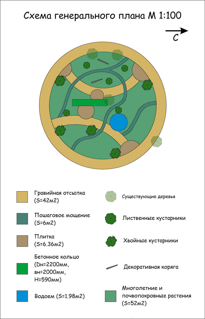 Центральные дорожки сделаны из гравийной отсыпки. Круговые площадки выполнены из плитки, закрепленной пластиковым бордюром.