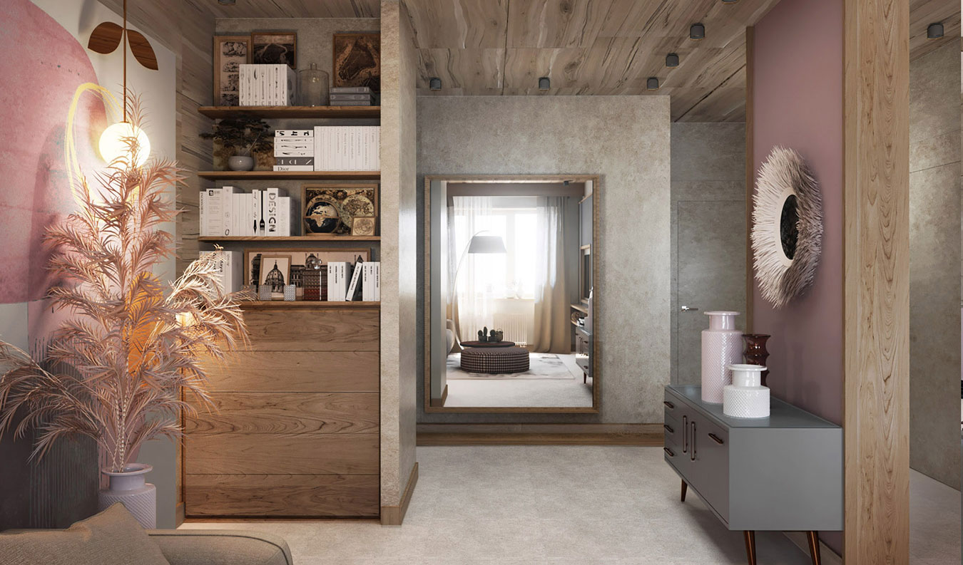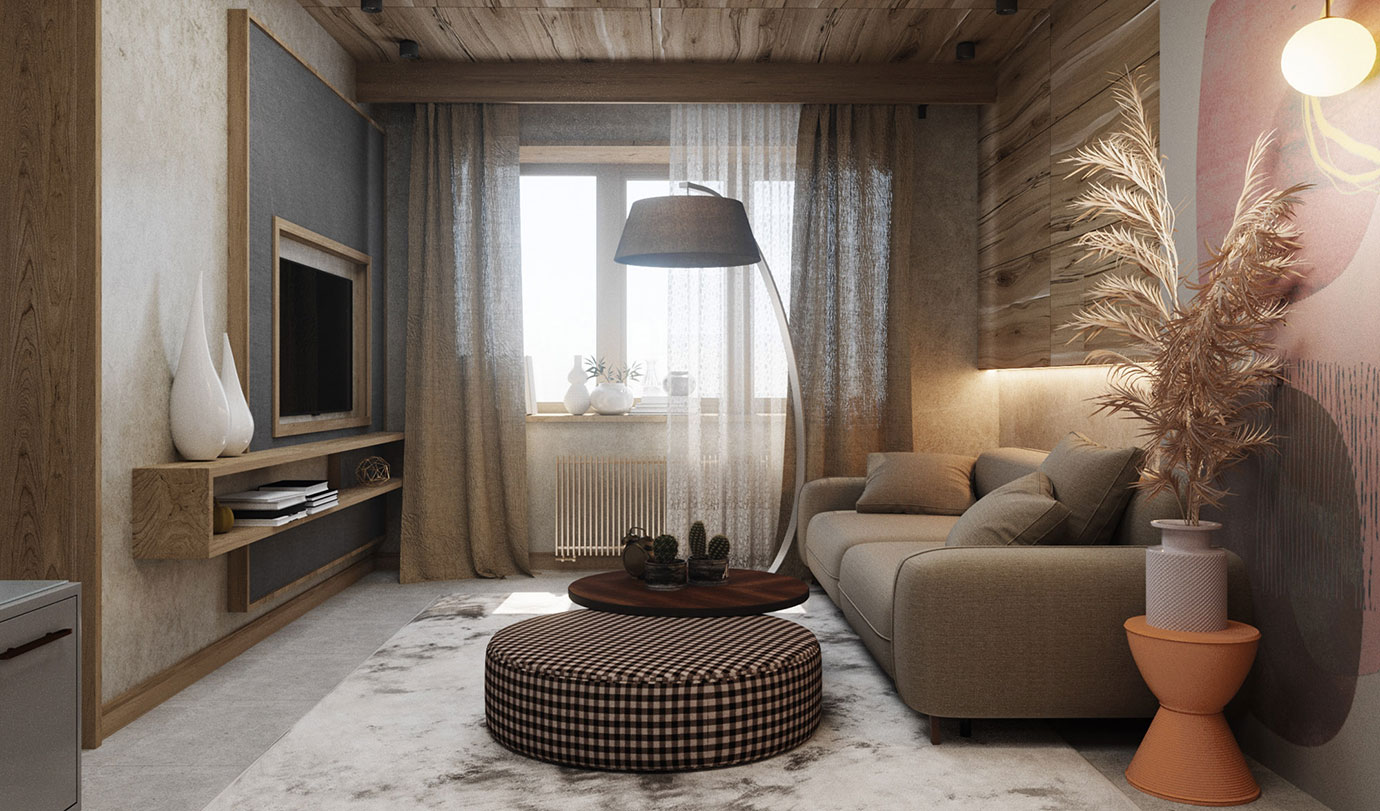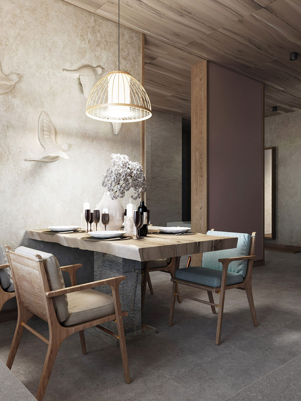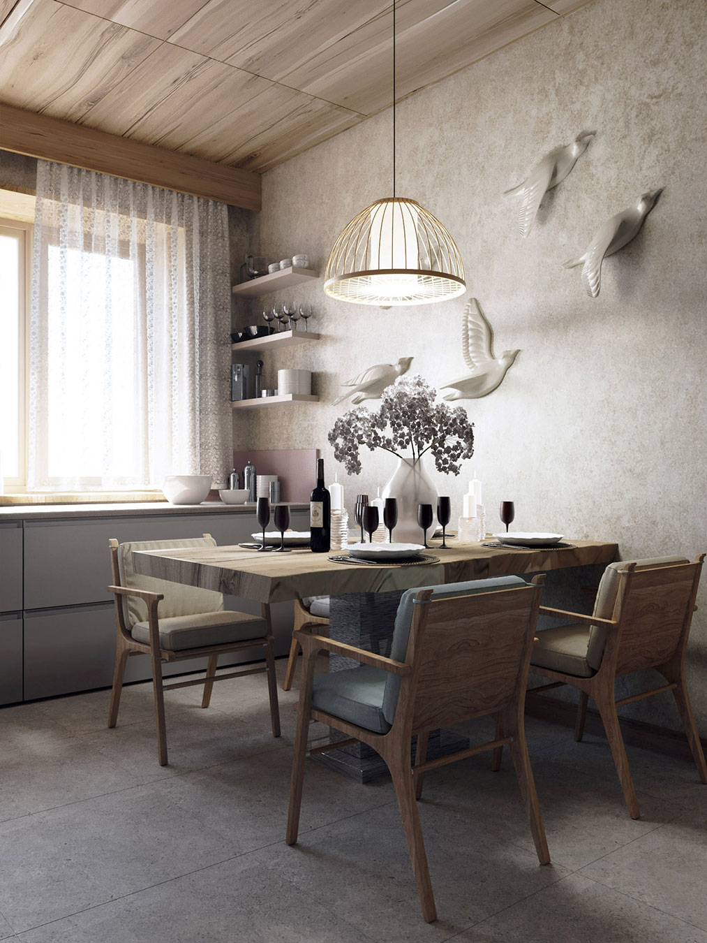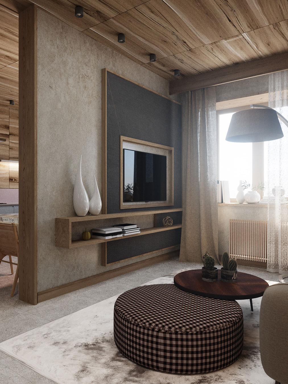 Задачей проекта была разработка интерьера квартиры, сочетающего этнические мотивы, стили минимализм и ретро, в котором бы житель мегаполиса мог ощущать себя так же уютно, как и в загородном доме. Главная идея — согласие человека с природой и с самим собой.