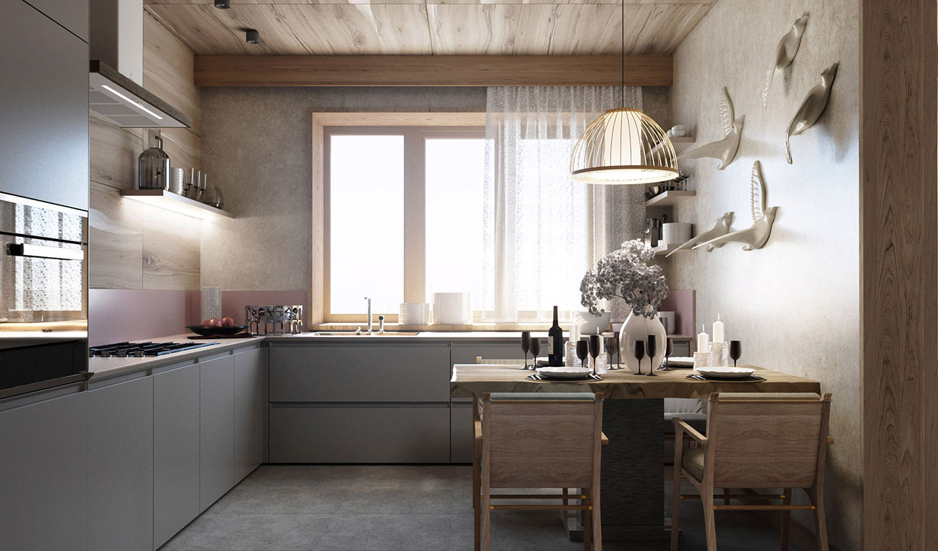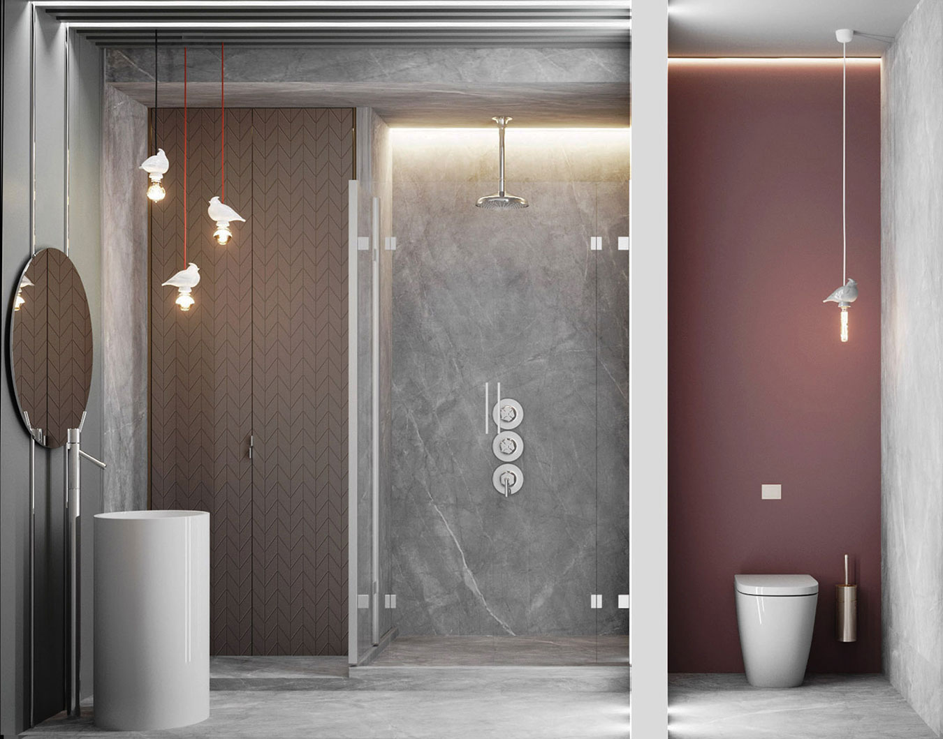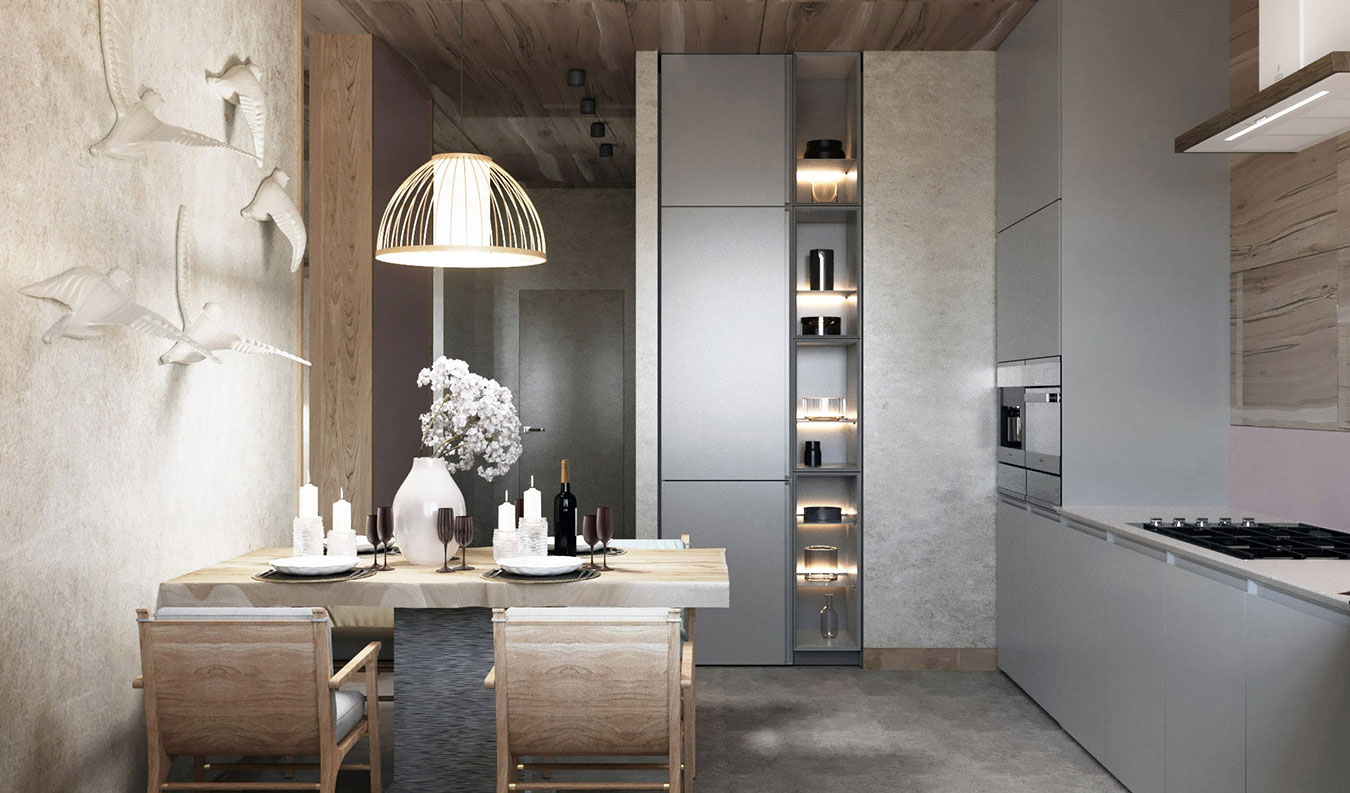 Тема птиц в проекте поддерживает концепцию воздушности. Она также представлена стильными аксессуарами: подвесными светильниками в ванной комнате, утонченным барельефом на стене кухни и зеркалом с окантовкой из перьев.