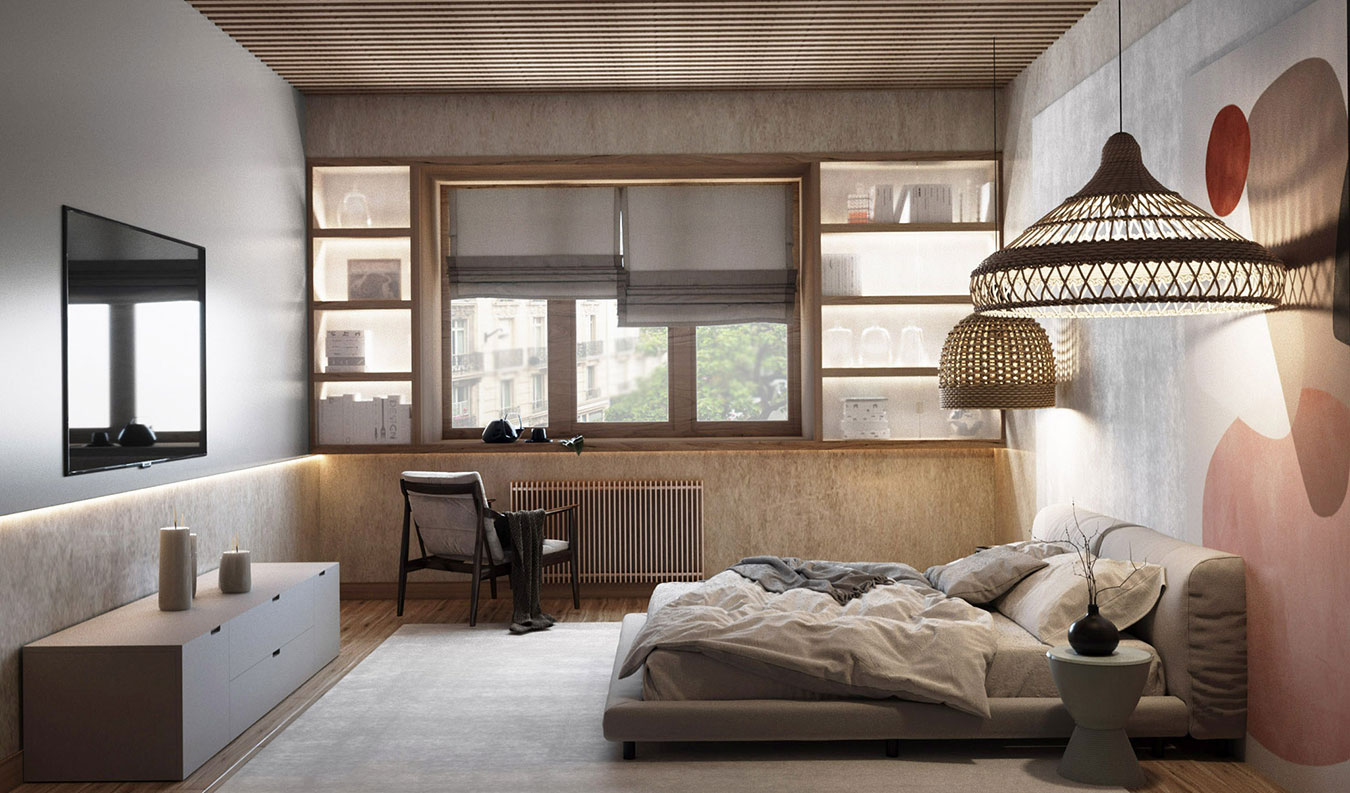 Геометрию пространства подчеркивает встраиваемая корпусная мебель. Выполненная в стилистике минимализма мягкая мебель гармонирует с обстановкой и позволяет сконцентрировать внимание на отделке. Деревянные панели на потолке — еще один отсыл к природе.