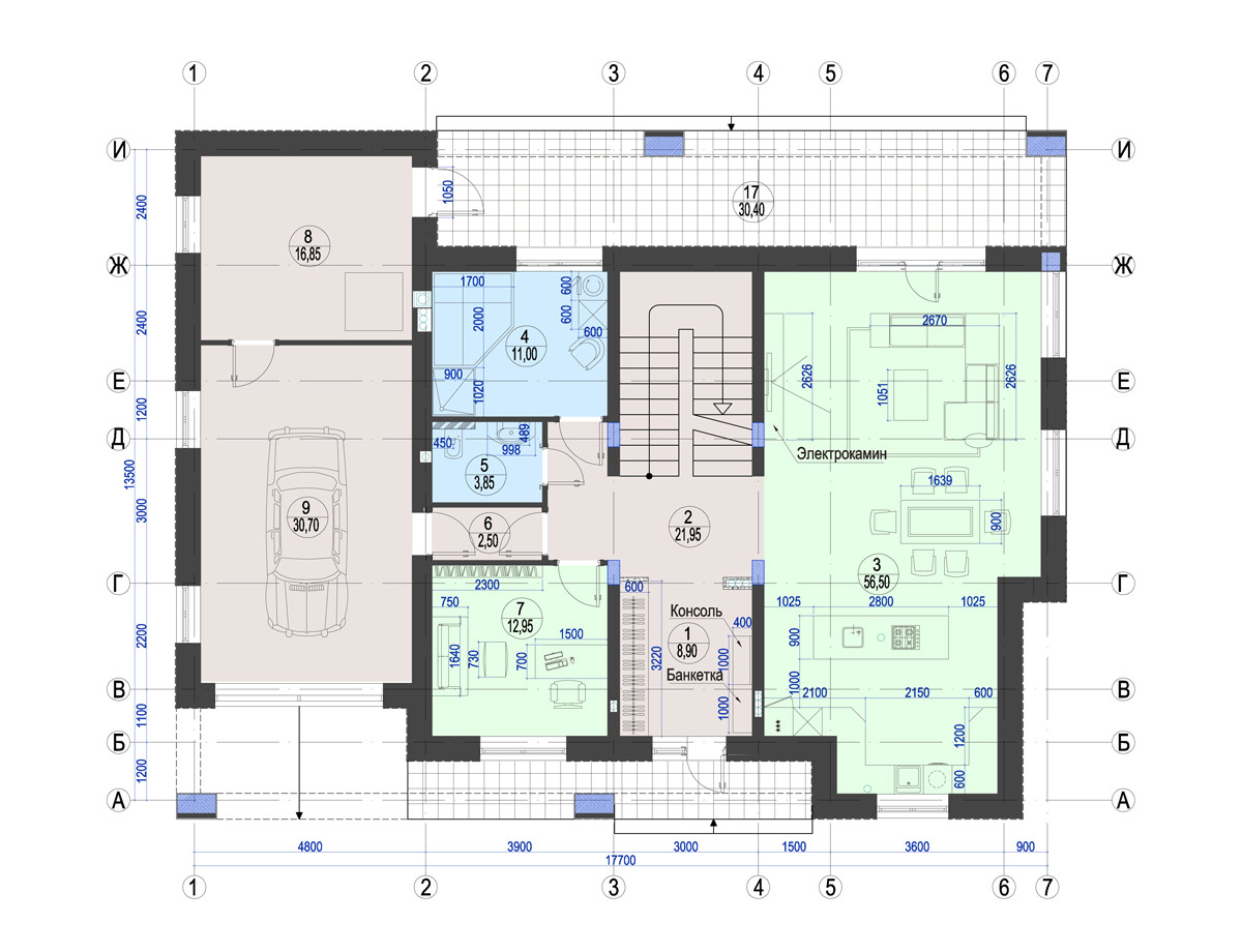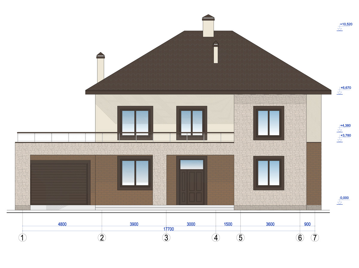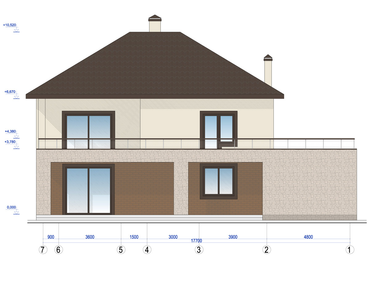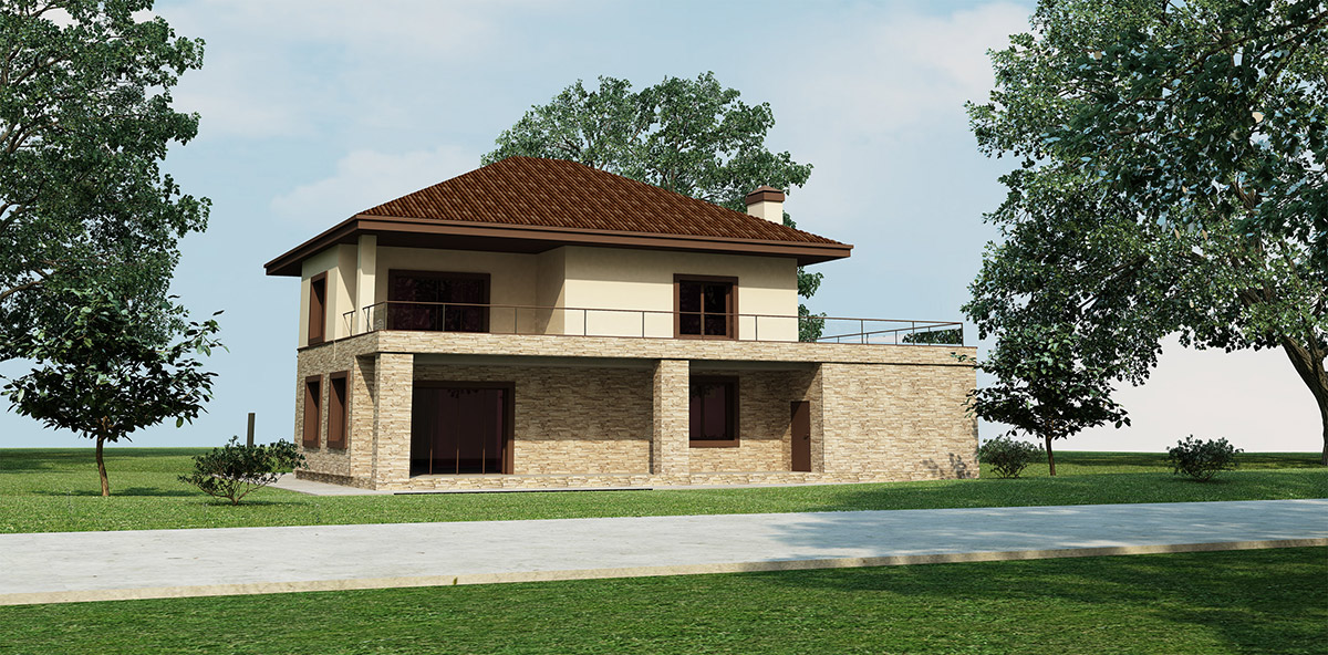 Отделку дома также планируется выполнить натуральными материалами. Их бежево-коричневая цветовая гамма приблизит строение к природному объекту.