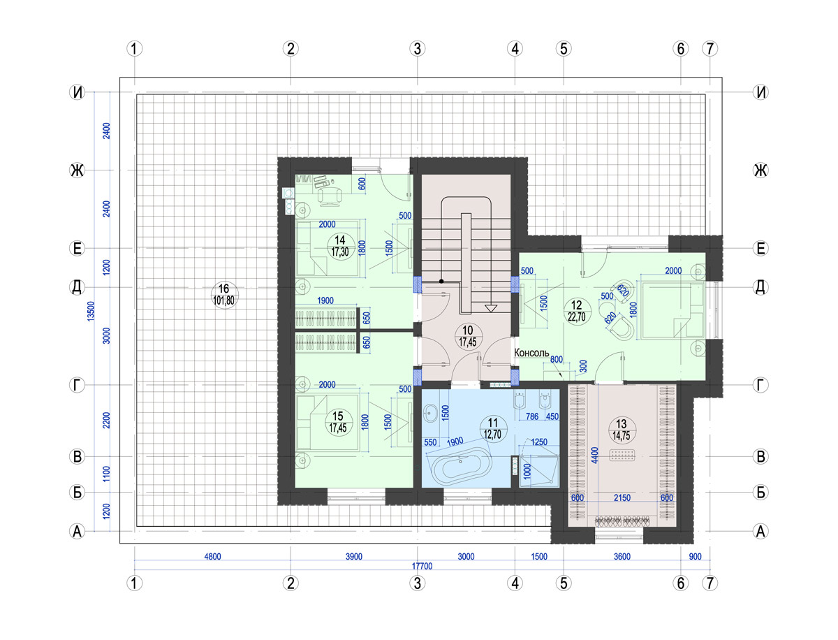 Исходя из этих задач автор запроектировала дом более вытянутым по фасаду и выбрала приземистую кровлю, чтобы строение не выделялось на фоне окружающей его зелени.