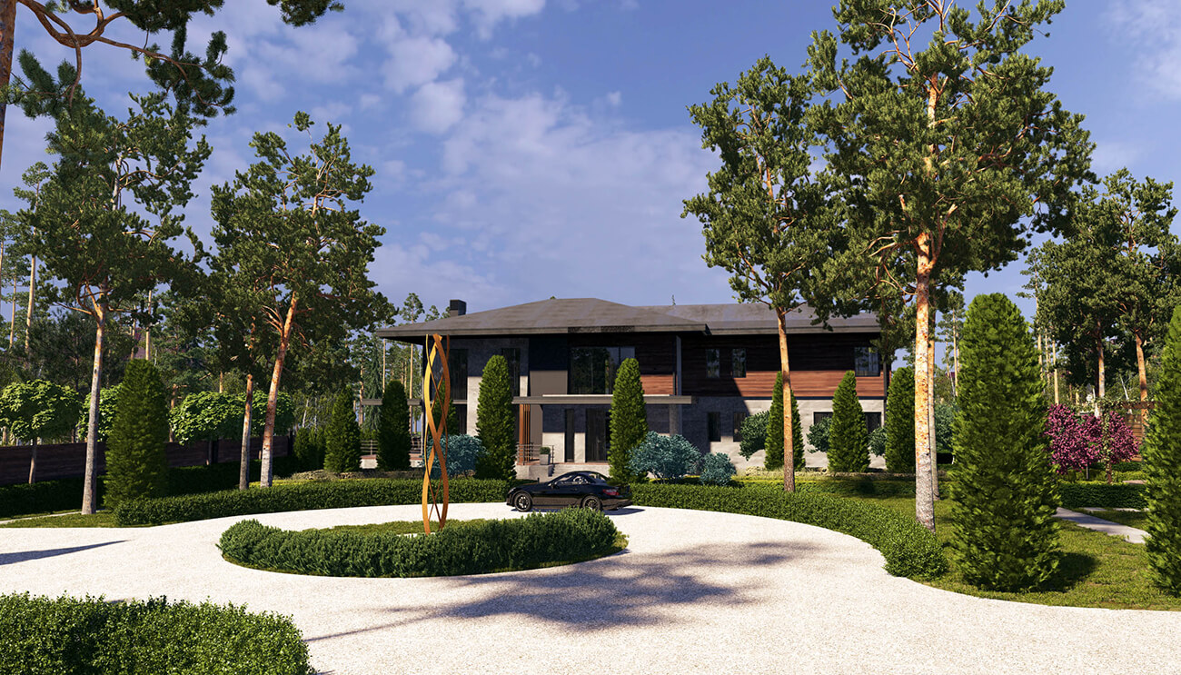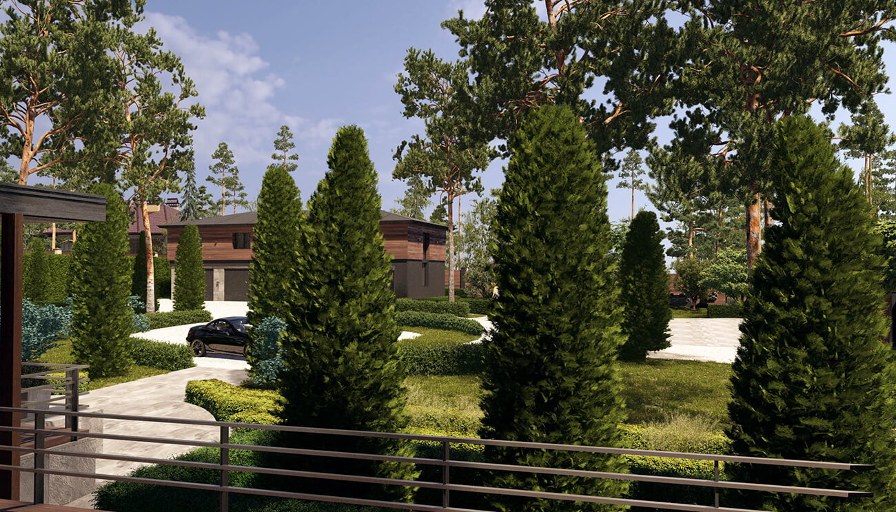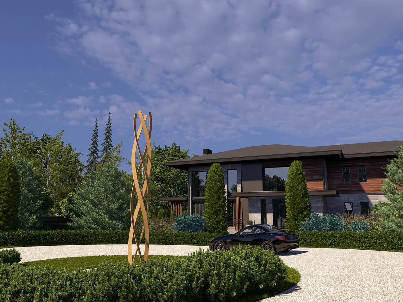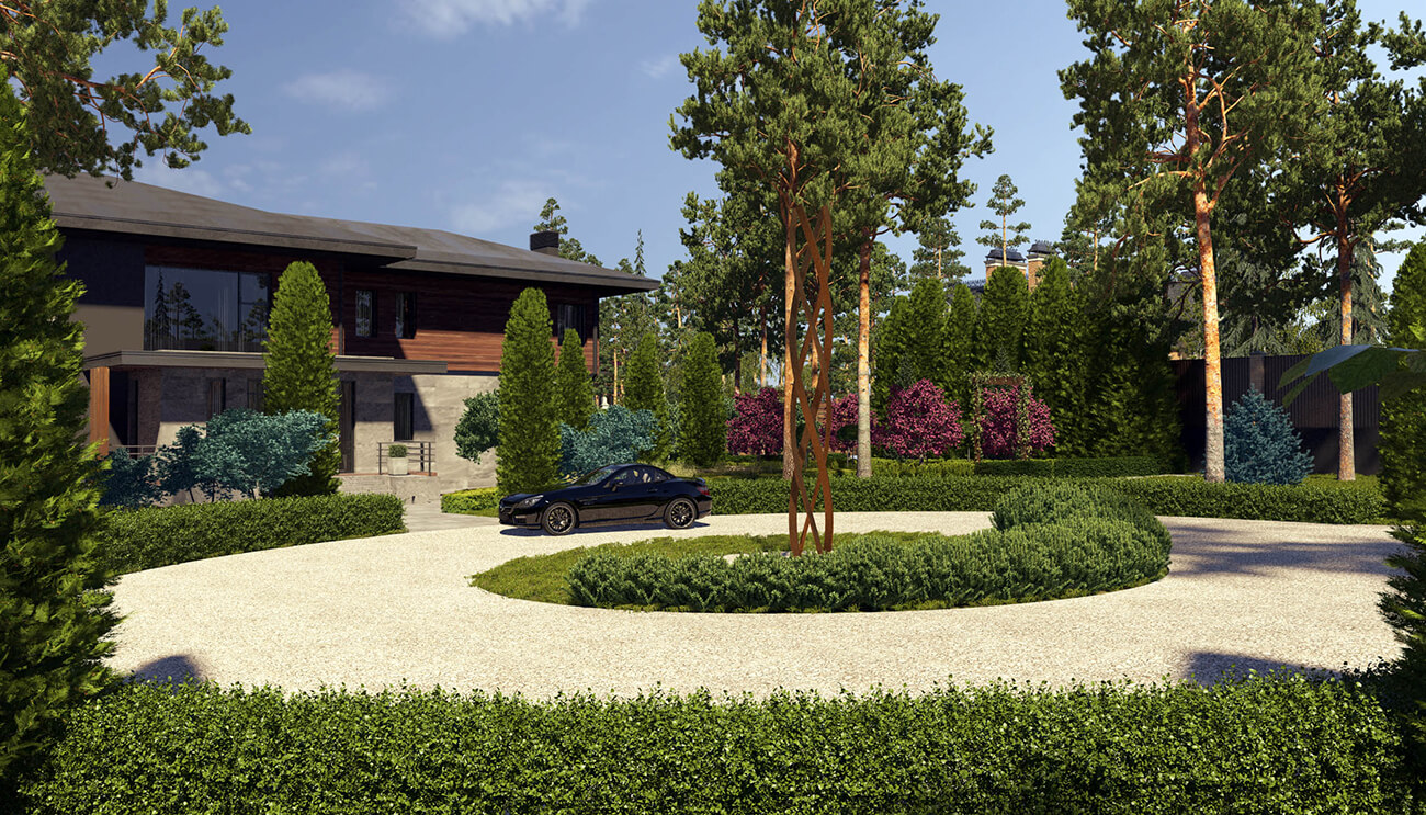 На въезде — разворотный круг, центр которого украшает арт-объект из кортена и завиток бордюра из сосны горний.