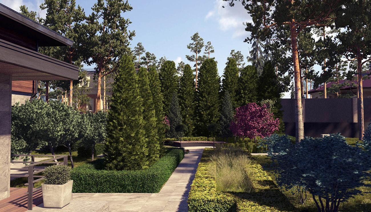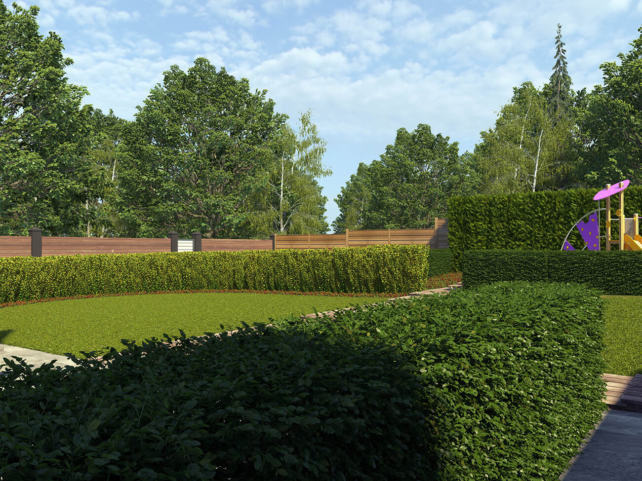 Перспективный вид открывается на зону тихого отдыха в виде боскета. Плотная структура посадки образует зеленую непроницаемую стену и делает пространство более уединенным.