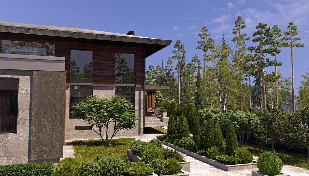 Растения на участке преимущественно хвойные, основу составляет сосна обыкновенная. Украшение участка — формированные деревья (сосна, туя, липа, клен) и кустарники с зонтичной формой кроны (ирга Ламарка, бересклет, боярышник). Часть территории занимают газон с четкими границами и живые изгороди.
