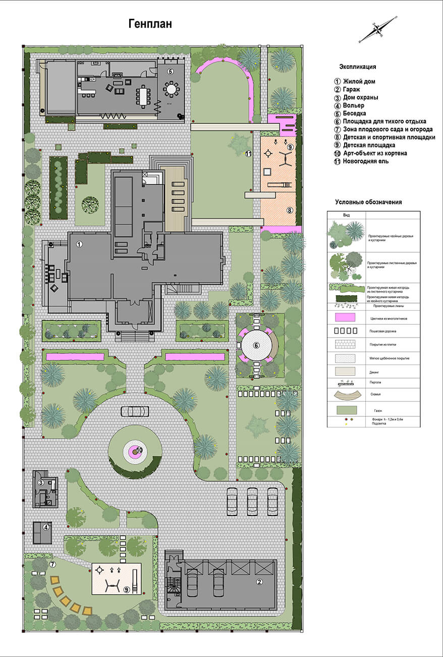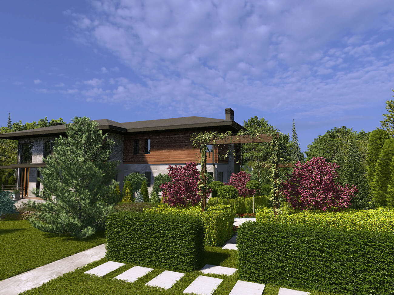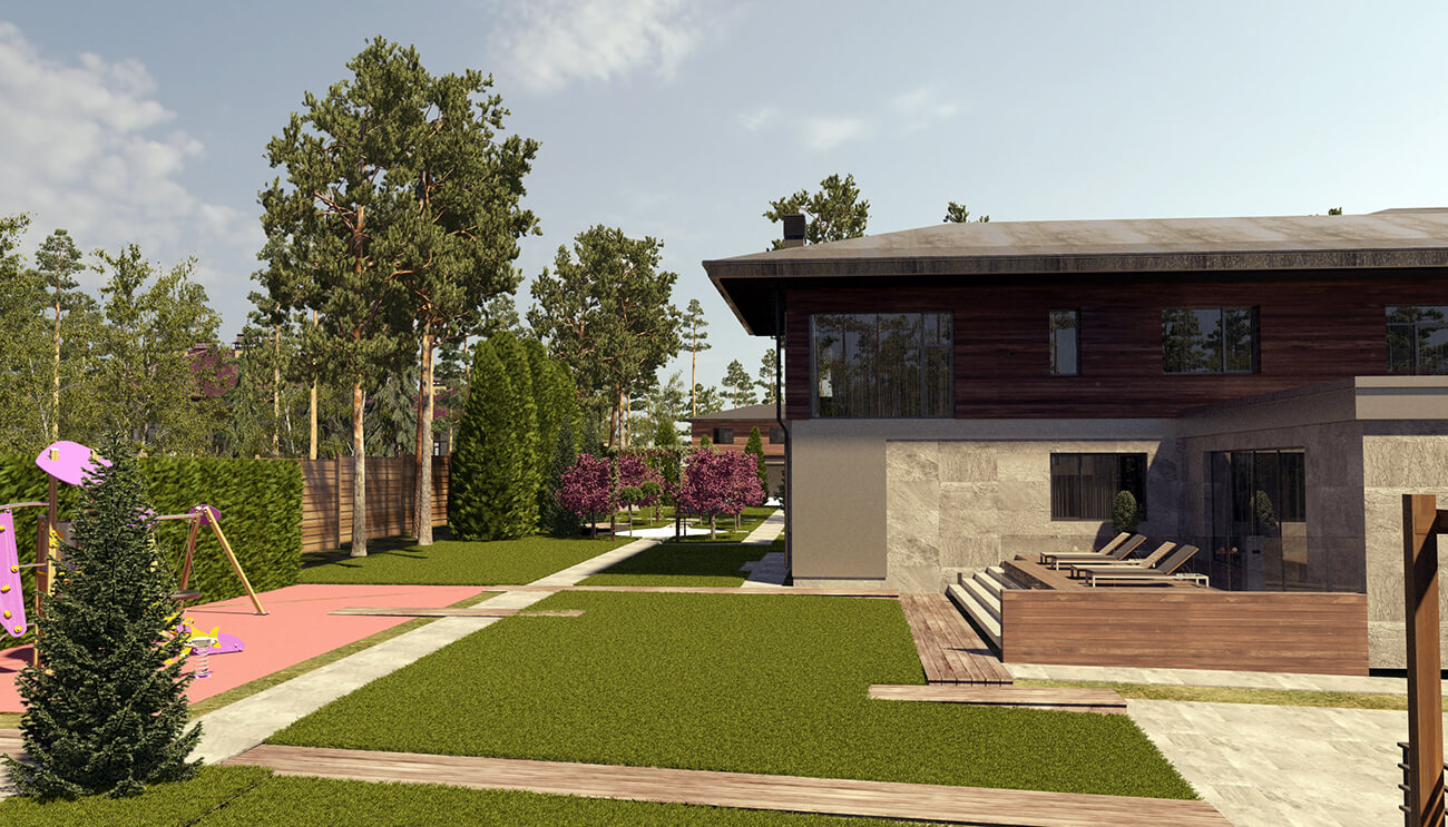 Архитектура дома становится основополагающей при разработке концепции ландшафта. Здесь сад как продолжение дома подчеркивает современный образ строений, объединяя жилое пространство с окружающей зеленой средой. Ландшафт выделяется геометрической планировкой и легко делит участок на функциональные зоны: плодовый сад, зону тихого отдыха, две детские площадки и зону для шезлонгов.
