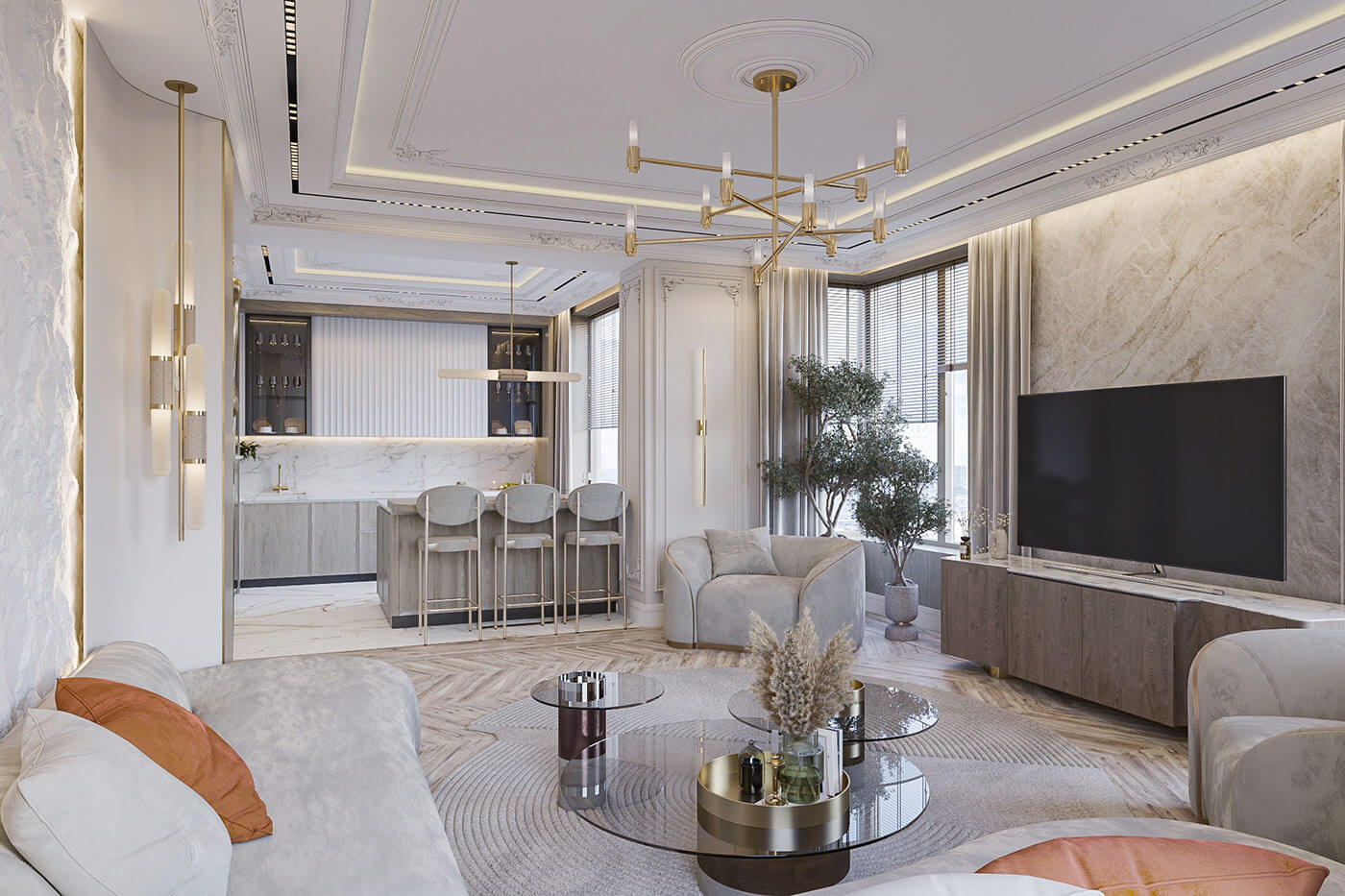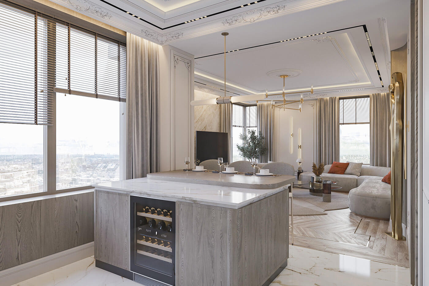 Современный интерьер просторной трёхкомнатной квартиры площадью 133 кв. м. — идеально подходит для проживания молодой семьи с ребёнком. Цветовая гамма пастельно-пудровых оттенков придает кухне-гостиной особый шарм. Использование в интерьере натуральных материалов дерева и камня — подарят ощущения единения с природой, с чем-то натуральным и полезным.