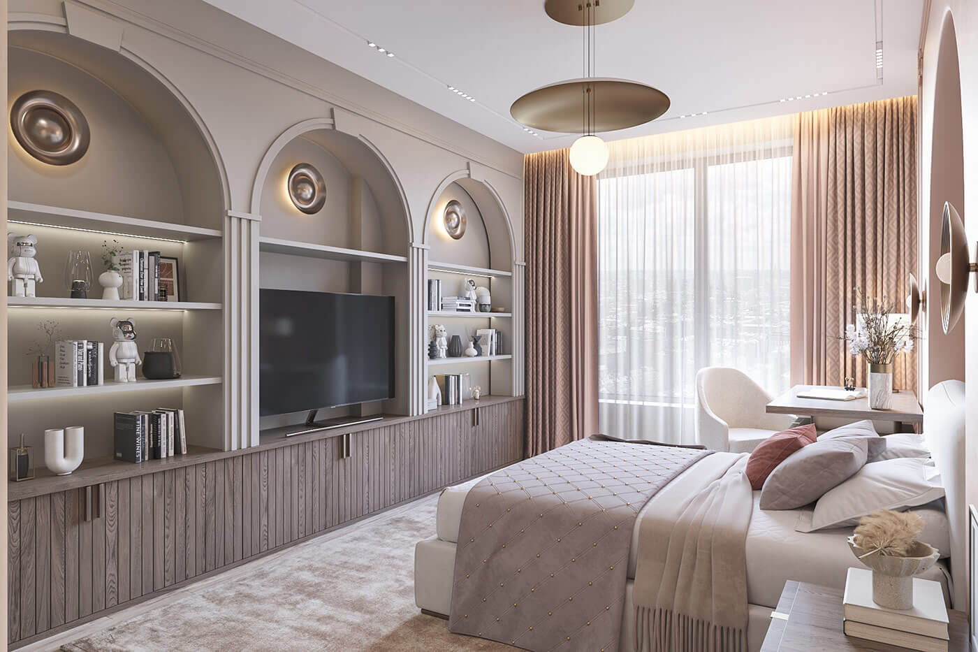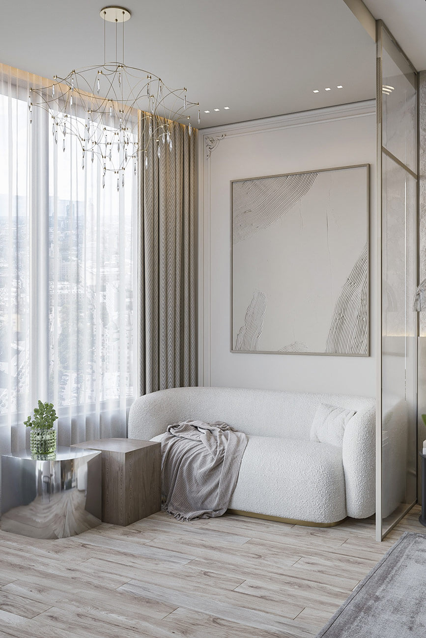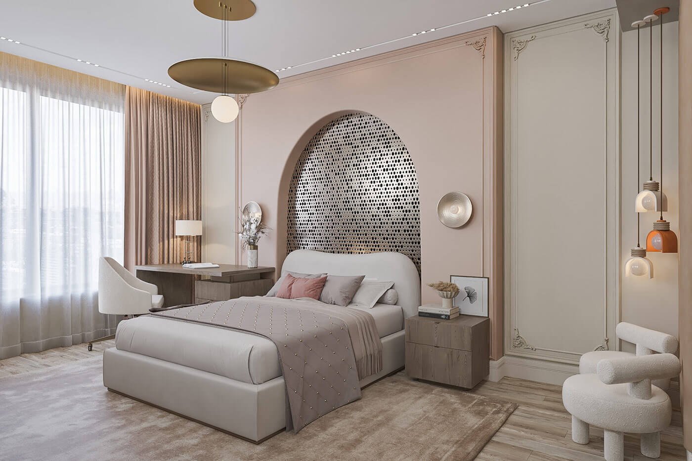 В спальне, за счет большого количества естественного света, создается ощущение воздушности. Минималистичный дизайн мебели, скругленные формы и мягкие фактуры ткани добавляют в интерьер уют.