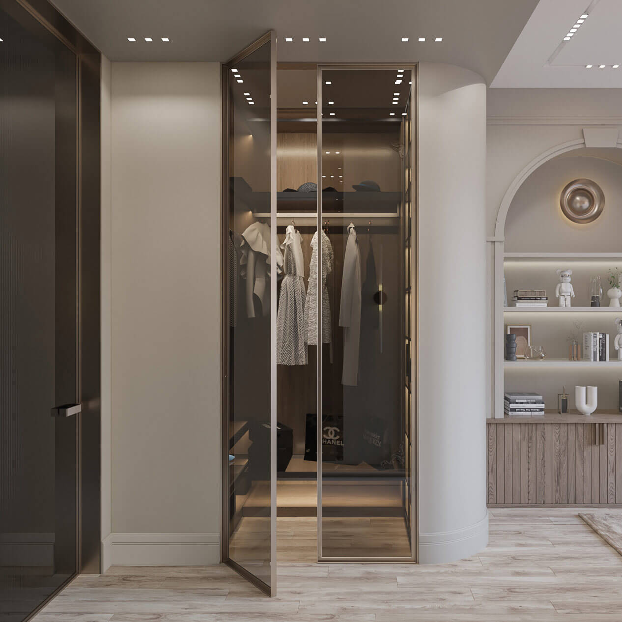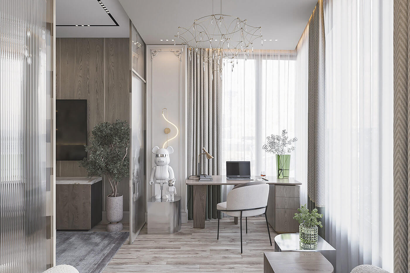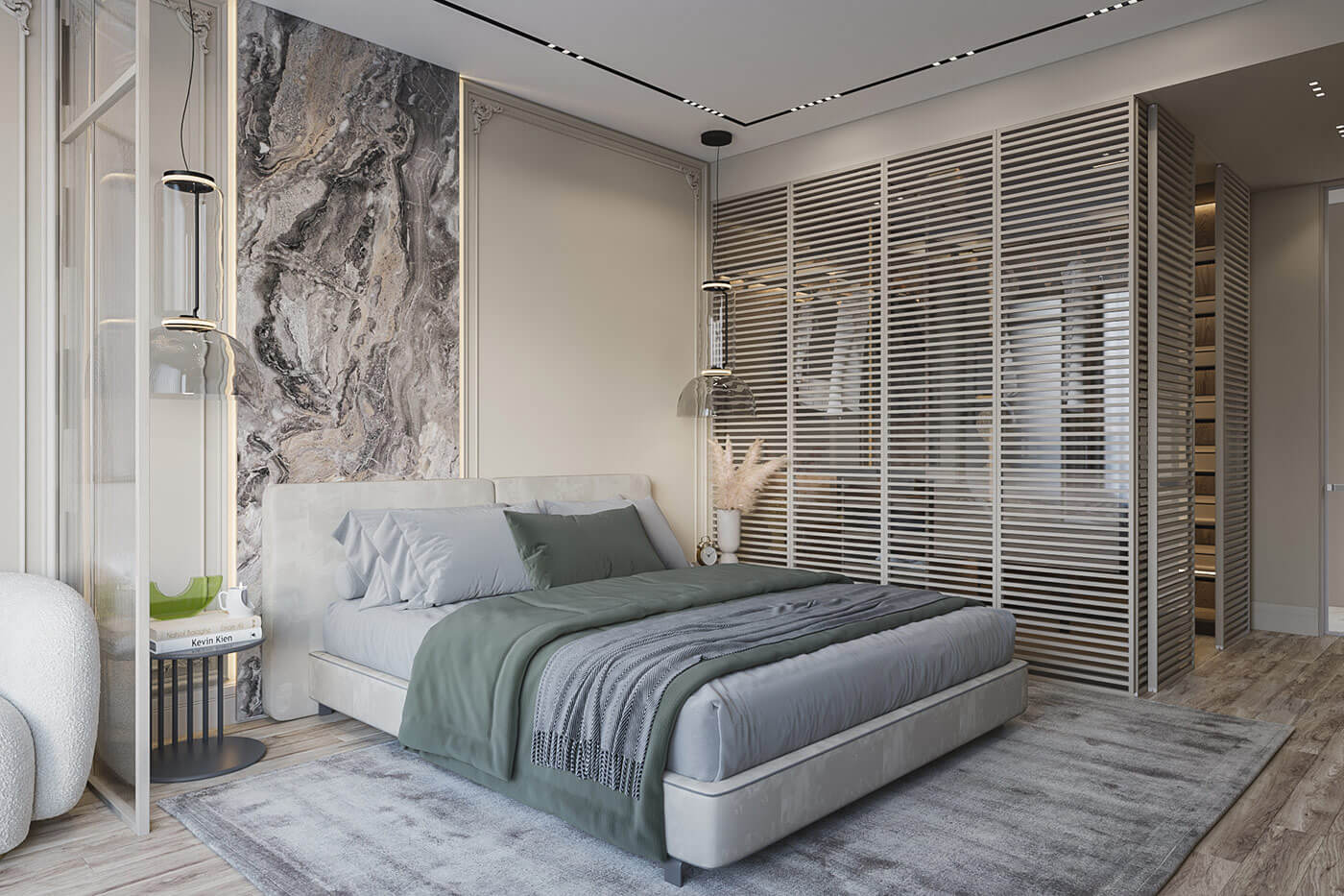 В спальне, за счет большого количества естественного света, создается ощущение воздушности. Минималистичный дизайн мебели, скругленные формы и мягкие фактуры ткани добавляют в интерьер уют.