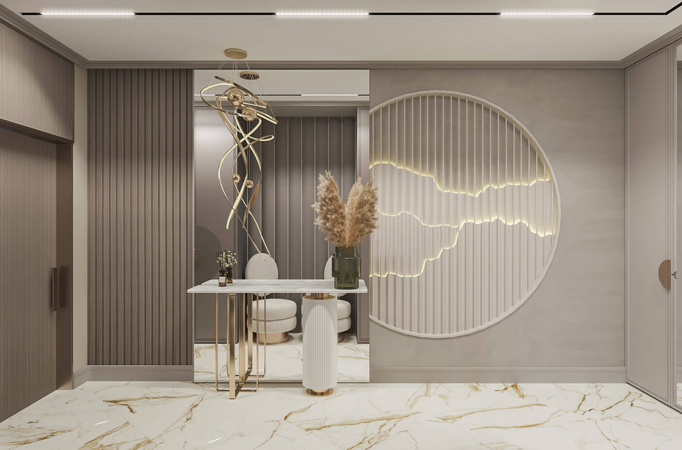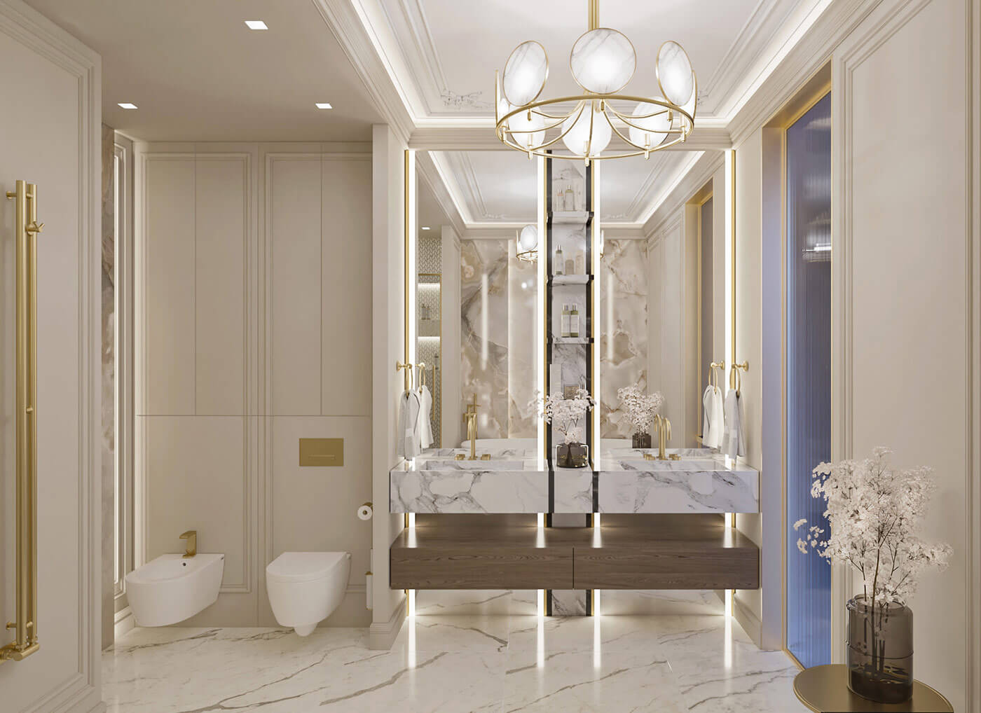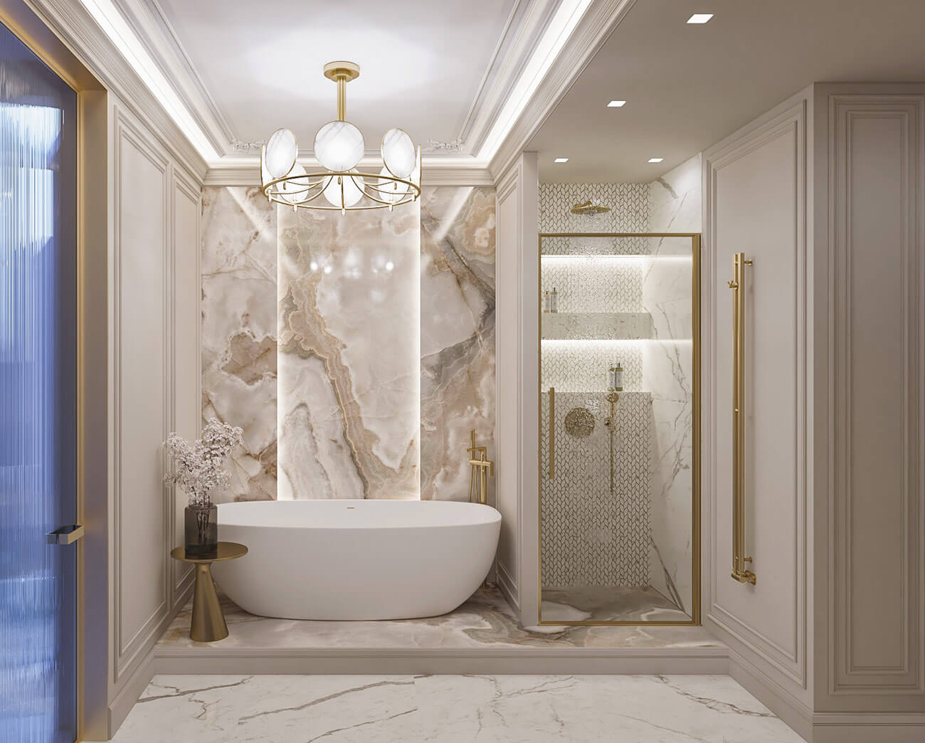 Элементы классической гипсовой лепнины присутствуют и в ванной комнате, но основной акцент в отделке идет на крупноформатные слэбы камня с подсветкой и раковину из мрамора.